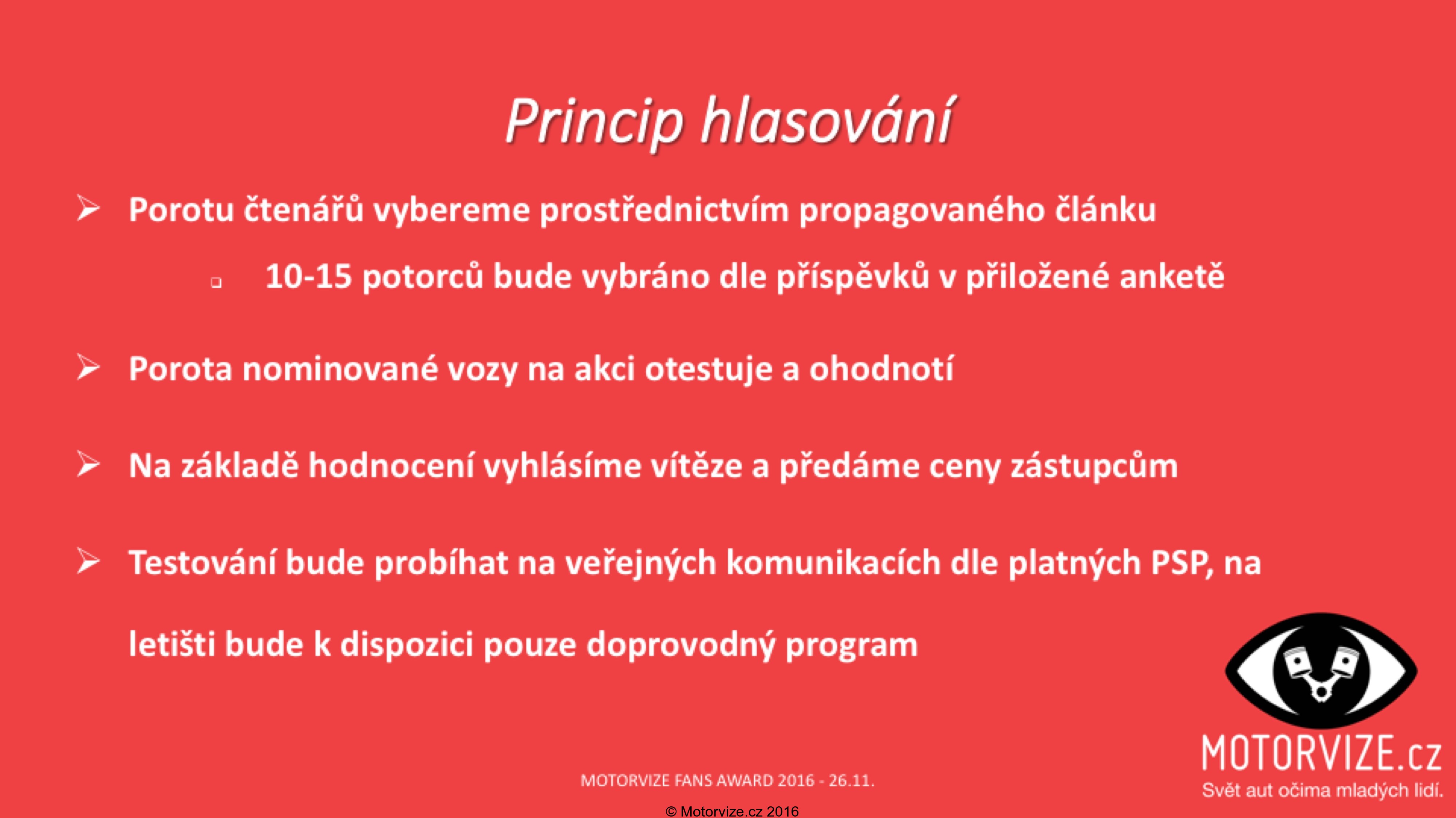 Stačí si jen vybrat svého kandidáta na nejlepší automobil a napsat nám, proč by se jím měl stát právě on! Redakční tým ze všech odpovědí vybere ty nejlepší, jejíž autoři se stanou našimi porotci. K odepsání využijte možnost odpovědi přímo pod článkem nebo pod příspěvkem na Facebooku Motorvize.cz. Nezapomeňte do textu uvést kontakt, abychom se s vámi mohli spojit pro případ, že vybereme právě vás. Pro tento případ doporučujeme si nechat v kalendáři na sobotní odpoledne 26.11. volno.