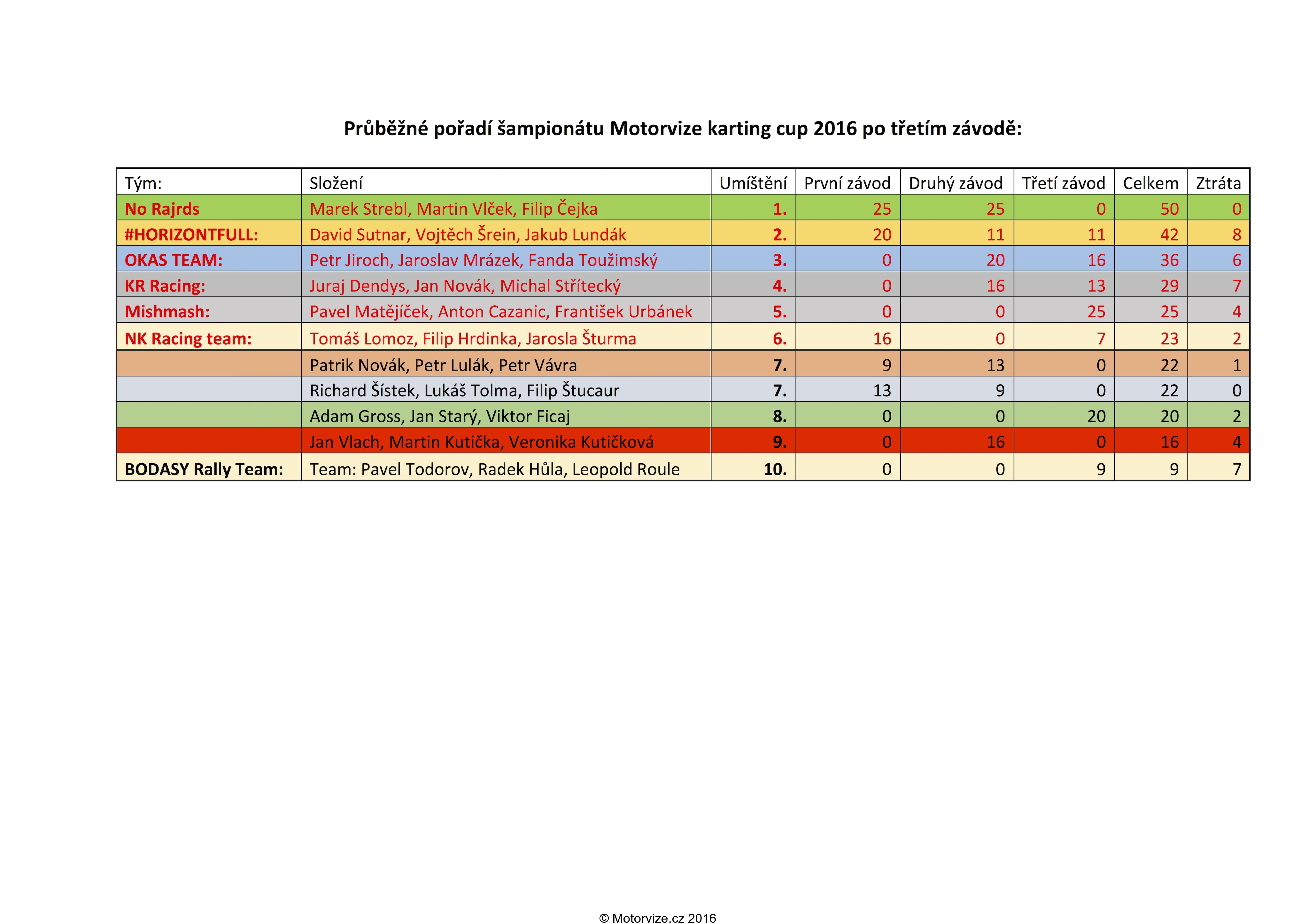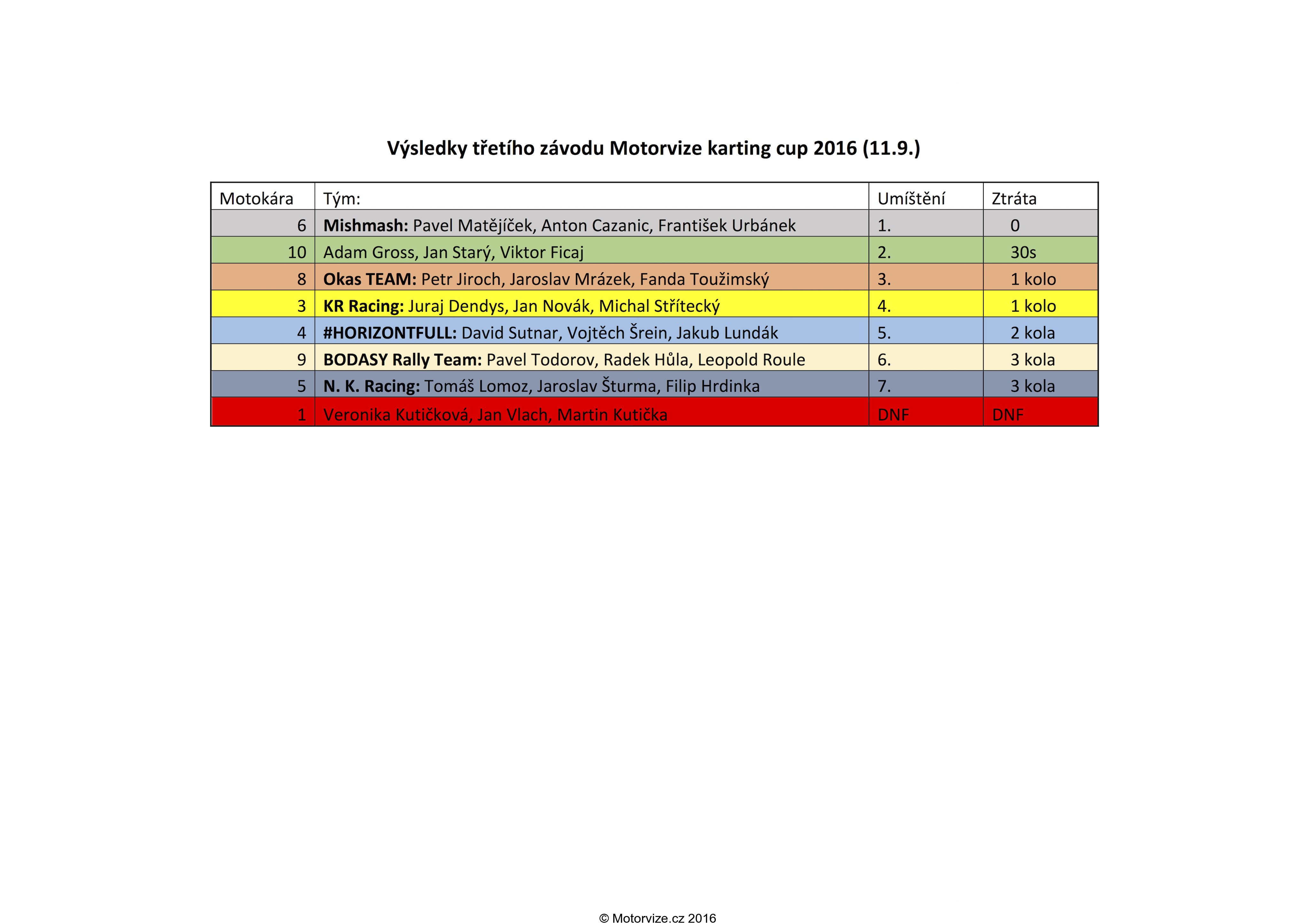 Na chvilku jsem si propůjčil mé oblíbené přísloví. Konec dobrý neznamená jen dobré umístění a já jsem rád, že většina týmů i tentokrát sdílela tento náš přístup. Jde hlavně o nadšení, které by měl každý startující sdílet s ostatními. Týmový duch je pak u nás kromě jízdních dovedností opět jednou z nejdůležitějších částí. Jak se můžete přesvědčit i ve výsledcích, velký důraz je kladen na „fair-play“. Poslední z týmů potkali na dráze nejdříve technické problémy s motokárou. V rámci dalšího střídání pak zástupci týmu nechali kvůli nespokojenosti vyměněnou motokáru samovolně odjet. Boxy se motokáře podařilo naštěstí bez střetu s dalšími předměty či osobami projet až na dráhu, kde se zastavila o pneumatikovou bariéru. Není pak snad ani divu, že tento tým byl diskvalifikován a přišel tak samozřejmě i o možnost dalšího účinkování v našem šampionátu. Pojďme už ale k těm radostnějším zprávám, ke kterým doufám patří kromě výsledků třetího závodu i průběžné výsledky, ve kterých tentokrát najdeme prvních šest postupujících týmů do finálového kola, které se uskuteční 9.10.2016.