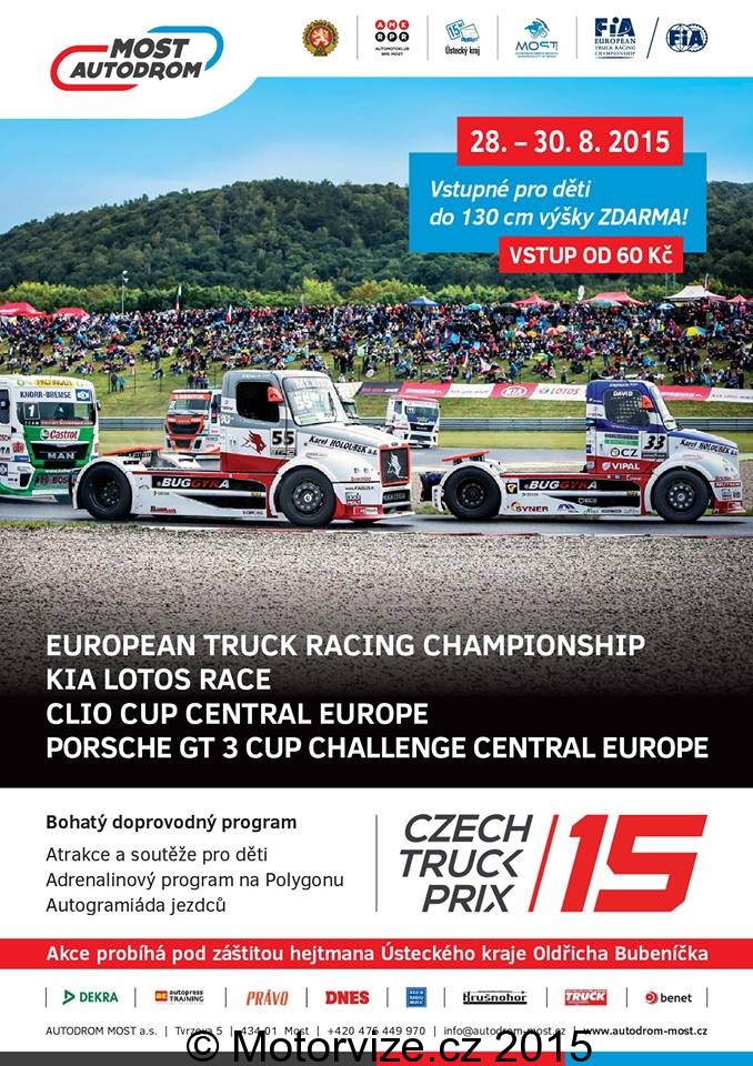 Ani na okruzích poslední víkend prázdnin nebude prázdno. Konkrétně máme na mysli nám již dobře známý Autodrom Most, který každoročně hostí monstrózní závody tahačů. Kromě již velké prestiže samotných závodů okruh může potěšit zastoupením tří českých závodníků na domácím okruhu. V rámci důležitých závodních sérií je zvykem bohaté zastoupení doprovodných závodních seriálů, není tomu jinak ani při letošním ročníku trucků v Mostě. Ty budou letos doprovázeny již podruhé závody Kia Lotos Race (okruhové speciály vozů Kia Piccanto), závody Clio Cup CE a letos nově i Porsche GT3 CCCE. Doprovodný program ale není ani zdaleka jen o ostatních šampionátech. Obzvláště na mosteckém autodromu si vždycky velmi potrpěli na mnoho doprovodných atrakcí. Avizované jsou taxi jízdy s Veronikou Cichou, průjezd formule Dallara GP2, na offroad trati bude jezdit bojovné vozidlo pěchoty a několik Jeepů. Dle zkušenosti s předešlích let pak očekáváme I různé kaskadérské show a třeba průlet akrobatického letadla nad okruhem, nechme se překvapit. Letos s novým majitelem jsme o to víc zvědavi, co si na nás pořadatelé připraví. V rámci Czech Truck Prix 2015 budete mít možnost se s naším redakčním týmem potkat na diváckém svahu Autodromu Most.