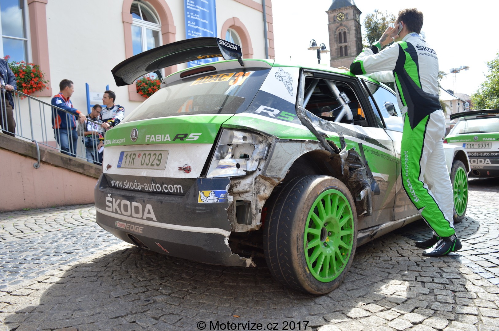 O sobotě jsem se sice rozepsal už v předchozím článku, ale pokud jsme u Highlightů, sobotu jako takovou a nejdelší zkoušku celé soutěže si prostě nemohu odpustit. Čtyři dny v Německu nebyly pro nikoho odpočinkem, pokud nepočítáte ten psychický, ale všeho s mírou. A pokud se mě někdo dneska zeptá, kde se rozhodovalo, tak odpovím, že právě ve velkém vojenském prostoru nedaleko Baumholderu. Samozřejmě nemám na mysli dvě/tři super RZ, které se dohromady nevyrovnají ani ¼ celé délce Panzerplatte. Nejde však pouze o samotnou vzdálenost, kterou v plném tempu musí posádky a jejich vozy zvládnout, ale také o trať jako celek – terén a nástrahy. Jednou z nejzajímavějších vidím skok Gina, na kterém někteří atakují vzdálenost 40 metrů. Nemyslete si, že by někdo zpomaloval, alespoň né ti s novými WRC. Jedou plný plyn, co to jen jde. Úžasný pohled. A právě před touto rychlostkou, na přeskupení v St. Wendelu jsme vyzpovídali nejlepšího českého startujícího – Jana Kopeckého jedoucího na tovární Škodě Fabii R5.