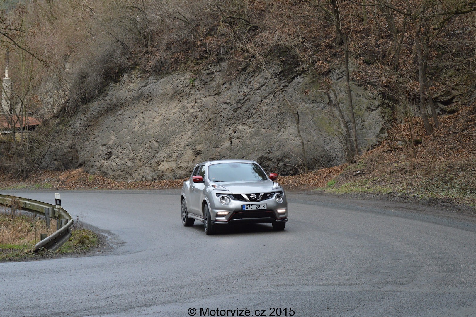 Ačkoliv jsem ze začátku zejména díky špatné volbě jízdního režimu hledal v autě potenciál 220 koní opravdu těžko, postupně jsem si na auto zvykal a ke konci testu bych snad řekl, že bych mu i tipoval více než udávanou porci výkonu. Vlastně s téměř stejným motorem jsem měl možnost se svézt v modelu Pulsar, který měl akorát výkon ponížený o 30 koní (na 190). V něm mě překvapila především hospodárnost. Při troše snahy jsem byl schopný jezdit i za 6l/100km, to bohužel u Juka nejde. Vyšší spotřebu přisuzuji vyšší stavbě karoserie a o něco vyšší hmotnosti, kratší převodové skříni a obecně sportovnějšímu naladění motoru a koneckonců celého vozu. V reálném provozu pak dálniční stotřicítka představuje zhruba 8l/100km, klidnější jízdou se umíme dostat i lehce pod 7, naopak razantnějším stylem zhoršíte svůj průměr k 12-15l/100km. Nám se spotřeba ustálila na přijatelných 8,5l. Ale přeci jen už dost řečí o spotřebě, která by v takovém autě stejně neměla hrát zas tak velkou roli, pojďme se konečně pořádně svézt. Až na samotný závěr našeho testování se mi teprve podařilo využít Nismo tak, jak se patří, v režimu SPORT s vypnutými bezpečnostními systémy a s plynem na podlaze. Zde není téměř co dodat, větší výška vozu je kompenzována opravdu kvalitním podvozkem a je tak téměř neznatelná, brzdy se skvěle dávkují a nevadnou, převodovka je přesná a její převody jsou krátké, zvuk v tomto režimu je razantnější. Chvilku bych se jen pozastavil nad účinností samosvorného diferenciálu, ten při běžné jízdě nemáte šanci vůbec poznat. Když pak pojedete vaši oblíbenou zatáčku, kterou by rallyoví jezdci očíslovali v rozmezí 5-7, při přidání plynu poznáte opravdový rozdíl. Místo klasického charakteru předokolky, kdy by vůz okamžitě začal zvětšovat poloměr otáčení nebo se dostal do neotáčivého smyku, tady nic takového nehrozí. Naopak máte pocit, jakoby se kola více zaryla do silnice a chtěla zatáčku projet rychleji a rychleji. Někdy to může být až nepříjemné, efekt samosvoru je tu prostě opravdu obrovský. Když si na tuto vlastnost zvyknete, budete z každé rychleji projeté zatáčky vyjíždět s úsměvem.