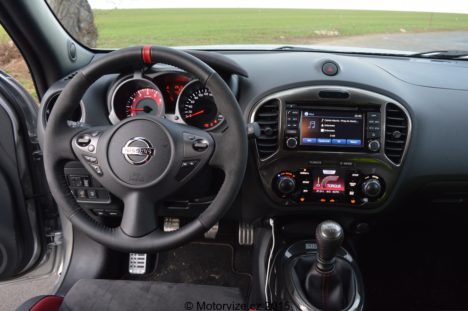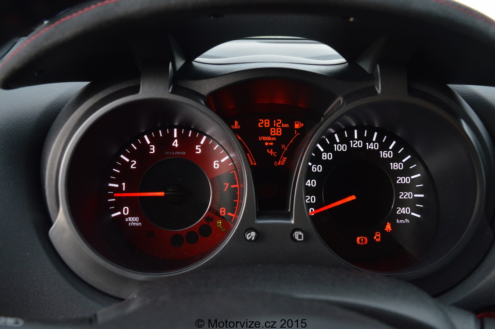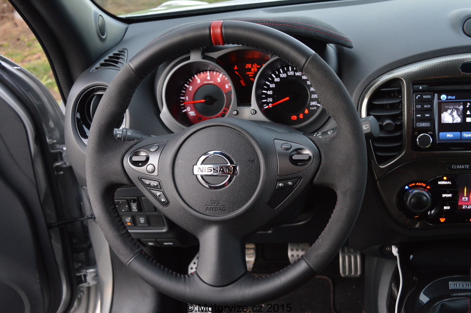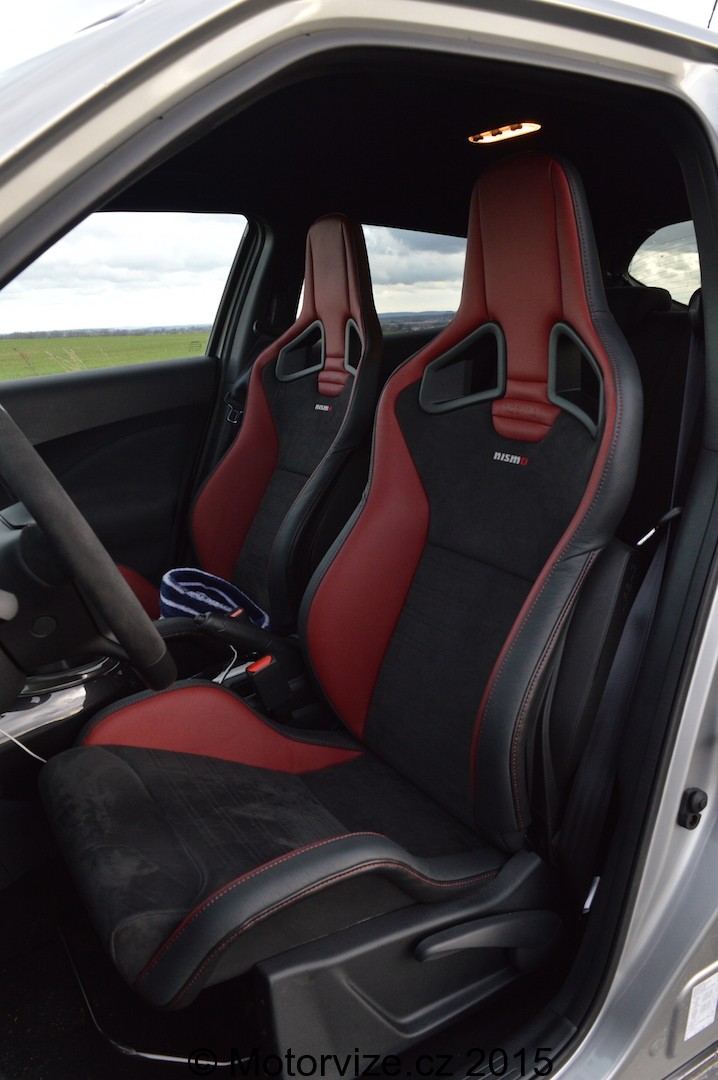 Zvenčí byste náš vůz ve specifikaci Nismo nazvali silně extravagantním, ale stejně byste mu vyloženě sportovní nebo dokonce závodní vlastnosti netipovali. K jeho výstřednosti bych uvedl jeden citát vztahující se konkrétně k barvě, v našem případě stříbrnošedé metalíze: „To auto je šedé, ale mě jako šedá myš rozhodně nepřipadá. Je to skvělá barva!“. Šedá barva totiž na tomto voze nepředstavuje splynutí s davem, ale velmi povedenou kombinaci s červenými doplňky a mnoha sportovními designovými prvky. Když se přesunete od exteriéru do interiéru, zažijete první šok ještě při nasedání. Zprvu nepohodlné nastupování nám kompenzují snad ty nejlepší skořepiny na trhu. Ačkoliv by to člověk ani trochu nečekal, tak Nissan nabízí ve specifikaci Nismo opravdu ty nejlepší předpoklady k pocitu sportovní jízdy. V interiéru kromě sedadel, kterým by se nevyrovnalo ani mnoho opravdu závodních vozů, nás dále překvapí také volant se středem označeným efektním červeným proužkem, ale především okolo pozice „třičtvrtě na tři“ semišové obšití. S trochou nadsázky mohu říci, že takové prvky nemáte šanci najít v žádném dostupném sportovním voze běžných automobilek. Interiéru se také týkají moderní technologie, ty u Nissanu představuje již tradiční dotykový displej navigace, který mimo jiné zobrazuje také záběry z panoramatického kamerového systému. U Juka navíc Nissan přidal jeden displej, který je kombinací údajů klimatizace a jízdních režimů. I zde najdeme jedno překvapení. V rámci jízdních režimů vozidlo umí zobrazit aktuální přetížení, sílu točivého momentu i aktuální využití výkonu či stopky pro případ, že vašeho miláčka vezmete na okruh. No, abych řekl pravdu, očekávání sportovní jízdy se nám v rozmezí 0-10 zvedly z počátečních 0 na zhruba 11.