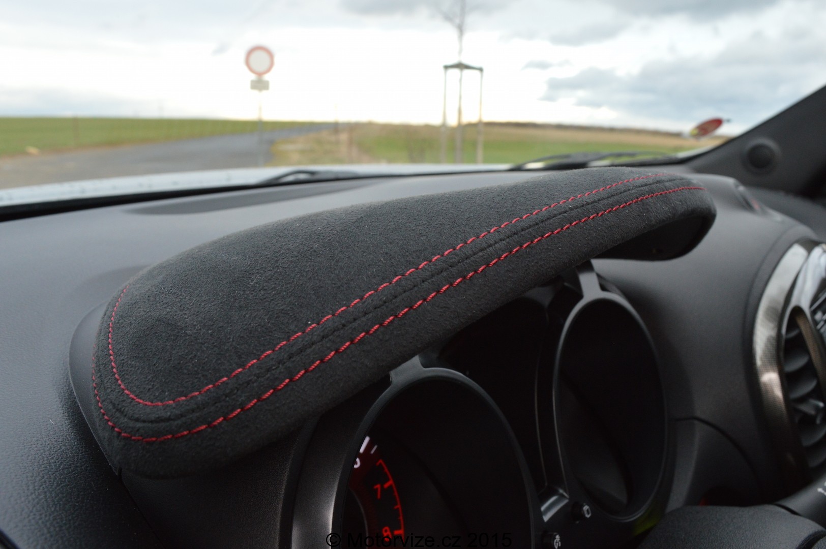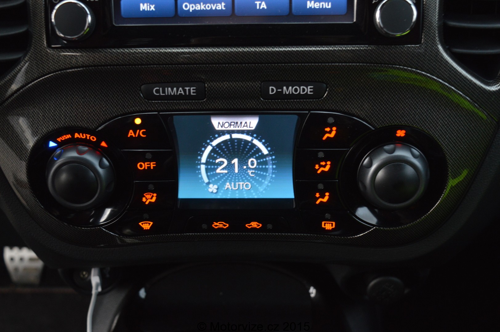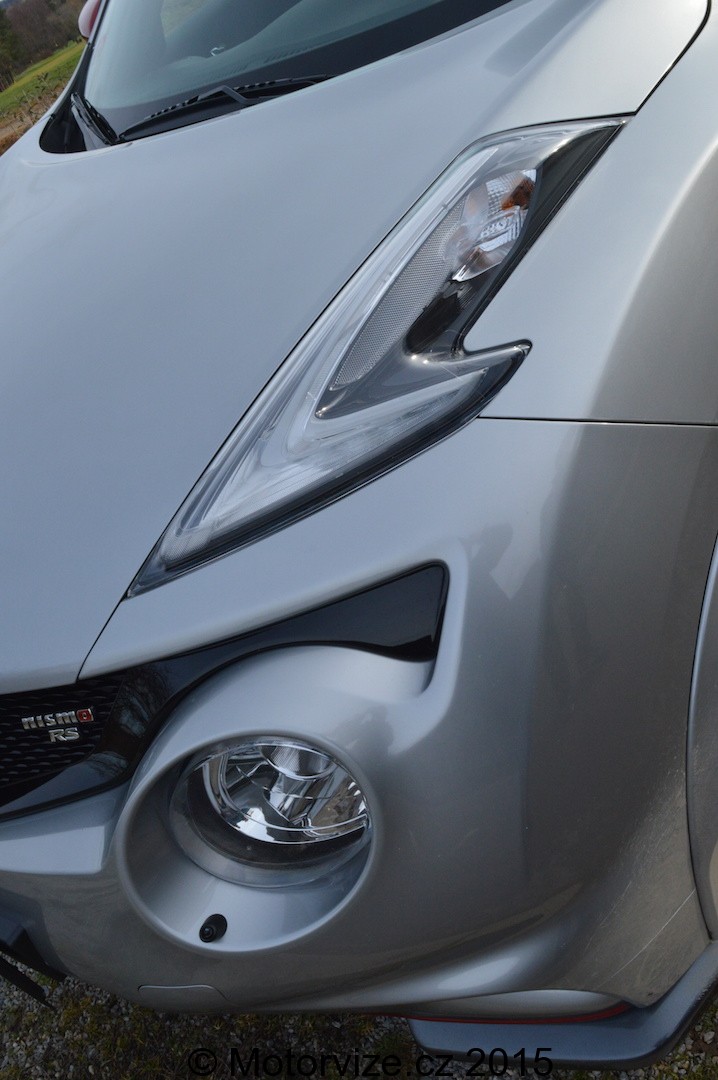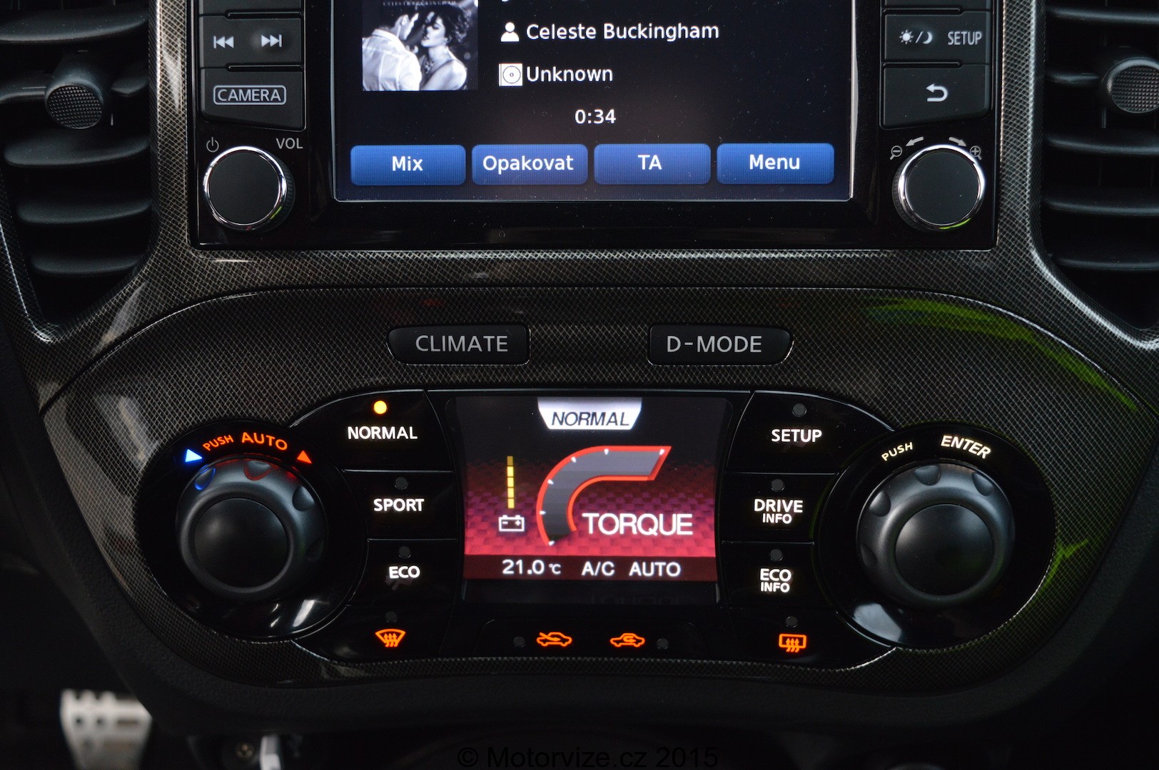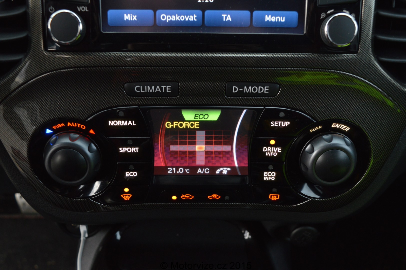 Zvenčí byste náš vůz ve specifikaci Nismo nazvali silně extravagantním, ale stejně byste mu vyloženě sportovní nebo dokonce závodní vlastnosti netipovali. K jeho výstřednosti bych uvedl jeden citát vztahující se konkrétně k barvě, v našem případě stříbrnošedé metalíze: „To auto je šedé, ale mě jako šedá myš rozhodně nepřipadá. Je to skvělá barva!“. Šedá barva totiž na tomto voze nepředstavuje splynutí s davem, ale velmi povedenou kombinaci s červenými doplňky a mnoha sportovními designovými prvky. Když se přesunete od exteriéru do interiéru, zažijete první šok ještě při nasedání. Zprvu nepohodlné nastupování nám kompenzují snad ty nejlepší skořepiny na trhu. Ačkoliv by to člověk ani trochu nečekal, tak Nissan nabízí ve specifikaci Nismo opravdu ty nejlepší předpoklady k pocitu sportovní jízdy. V interiéru kromě sedadel, kterým by se nevyrovnalo ani mnoho opravdu závodních vozů, nás dále překvapí také volant se středem označeným efektním červeným proužkem, ale především okolo pozice „třičtvrtě na tři“ semišové obšití. S trochou nadsázky mohu říci, že takové prvky nemáte šanci najít v žádném dostupném sportovním voze běžných automobilek. Interiéru se také týkají moderní technologie, ty u Nissanu představuje již tradiční dotykový displej navigace, který mimo jiné zobrazuje také záběry z panoramatického kamerového systému. U Juka navíc Nissan přidal jeden displej, který je kombinací údajů klimatizace a jízdních režimů. I zde najdeme jedno překvapení. V rámci jízdních režimů vozidlo umí zobrazit aktuální přetížení, sílu točivého momentu i aktuální využití výkonu či stopky pro případ, že vašeho miláčka vezmete na okruh. No, abych řekl pravdu, očekávání sportovní jízdy se nám v rozmezí 0-10 zvedly z počátečních 0 na zhruba 11.