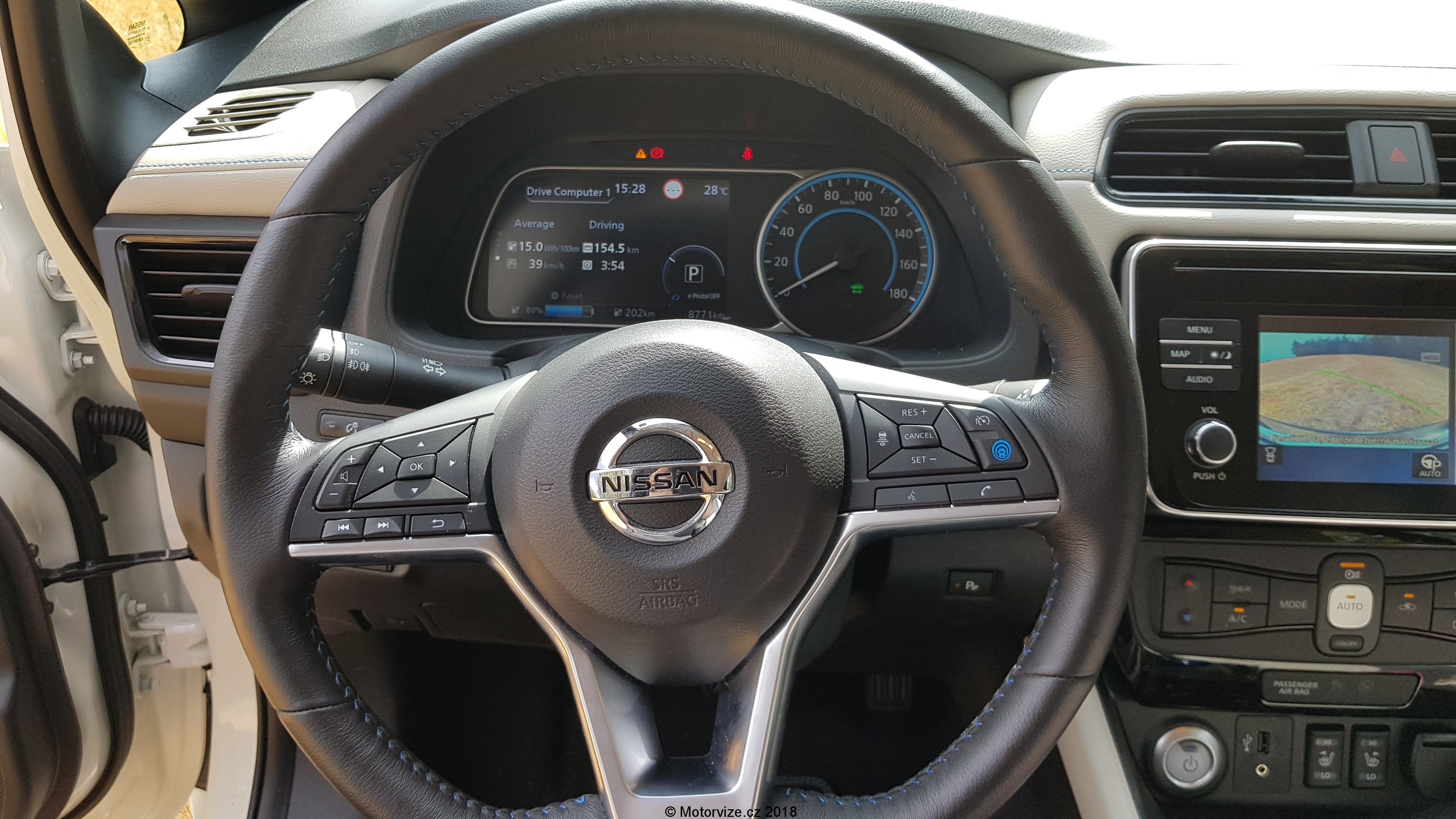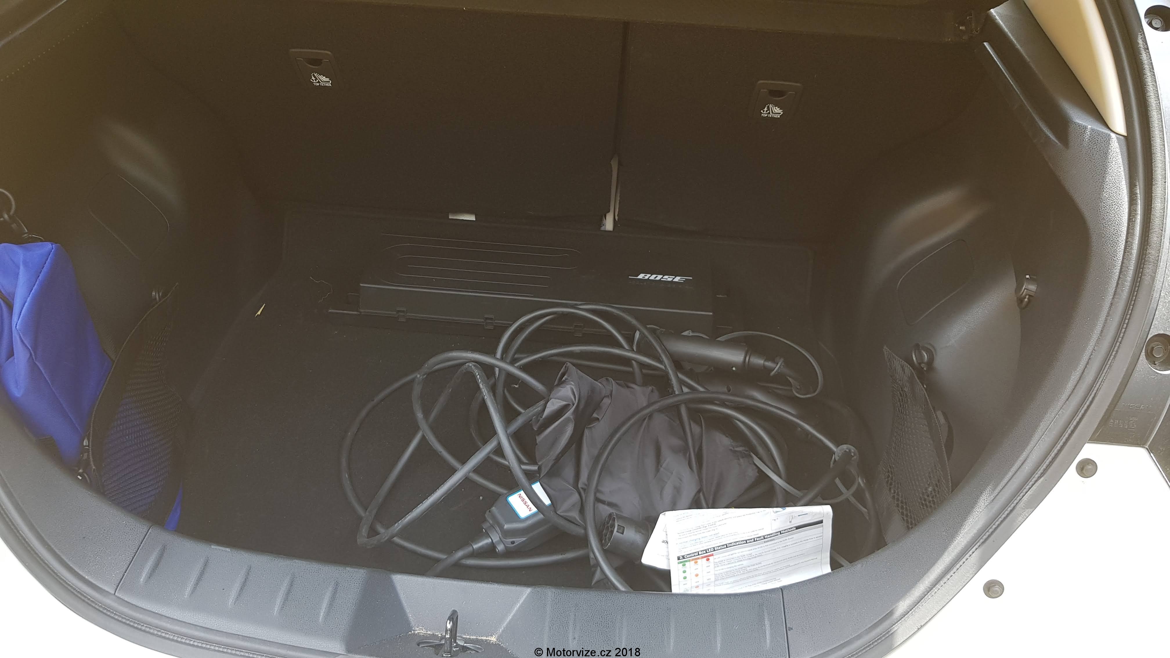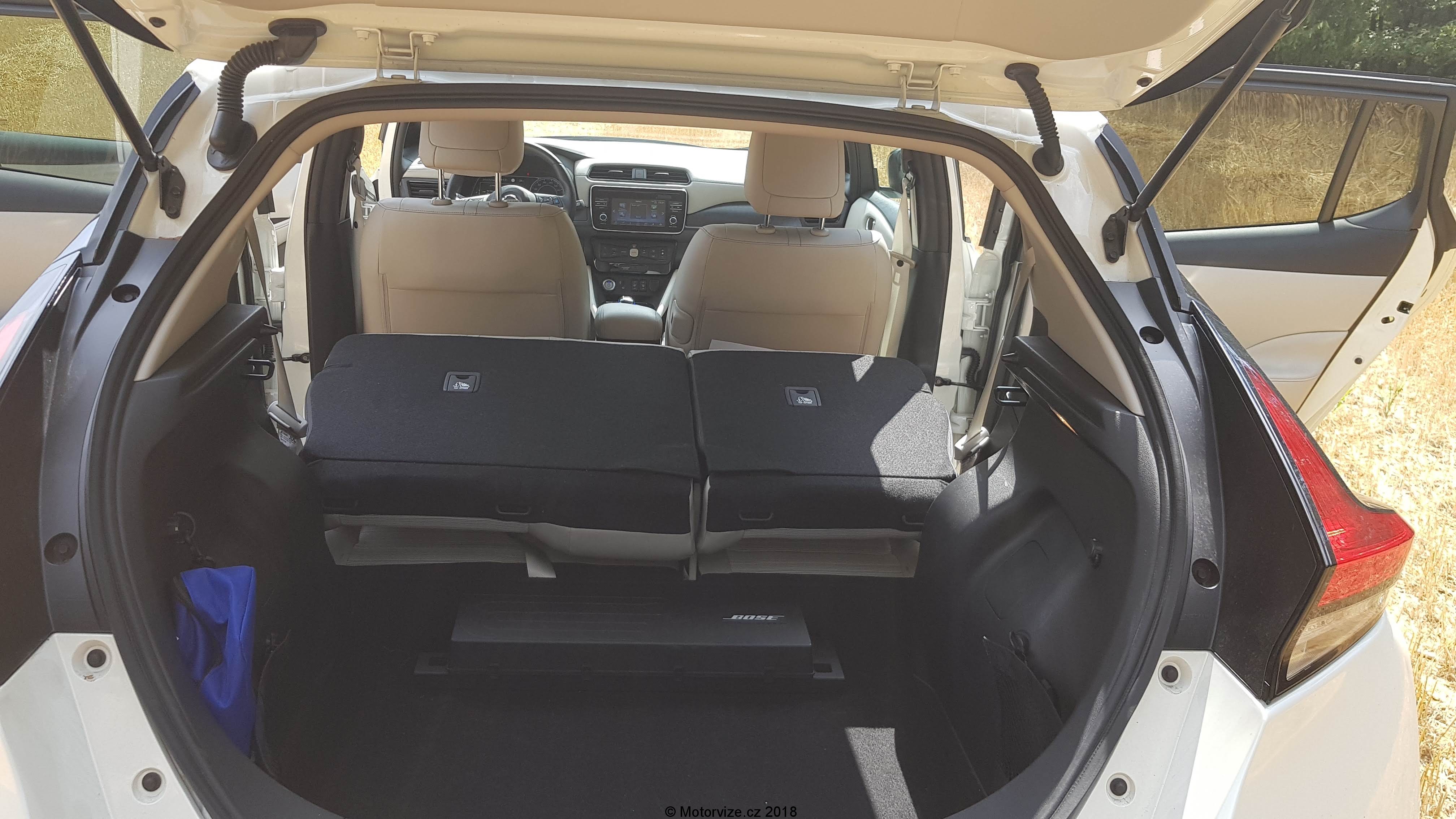 Interiér je prostorný a místa je všude více než dostatek, ne však pro všechny typy postav. Já jsem si bohužel nedokázal za celou dobu najít to správné místo za volantem a viník je právě onen zmíněný volant. Jeho podélné i výškové nastavení je poněkud omezené a pro moje potřeby nejde dostatečně vytáhnout a ani zvednout.To ve spojení s vyšším posazem znamená, že dlouháni musí být blíže k volantu a obouchávají si o něj kolena ze všech stran. Další drobný problém pro pohodlí řidiče bych viděl v umístění a velikosti pevné loketní opěrky. Ta je hodně krátká a umístěna příliš vzadu. Mě to vlastně vcelku vyhovovalo, ale naopak pro menší postavy, které si musí posunout sedadlo více dopředu, je opěrka až za jejich zády. Moje drobounká žena měla sice za volantem plné pohodlí, ale právě o loketku se opřít nemohla. Celkové zpracování interiéru je ve standardu Nissanu, vše dobře zpasováno. Převládají však tvrdší plasty, což bych u této cenové kategorie nečekal. Naopak mile překvapí koženě (koženkově) čalouněná palubní deska. Polokožená sedadla s mírně zvýšeným posazem mají dostatečné boční vedení a jsou pohodlná i na delší cesty. Potěší i isofix na sedadle spolujezdce. Hned jsem jej využil pro jednu dětskou sedačku. Na zadních sedadlech je také dostatek místa ve všech směrech, jen je snad hůře vidět dopředu přes mohutné hlavové opěrky. Pod kapličkou přístrojů je jeden analogový budík ukazující rychlost. Ostatní informace se zobrazují na velkém digitálním displeji. Ten je přesně dělaný pro takové hračičky, jako jsem já. Pomocí ovládání na volantu si řidič může zobrazit velké množství informací o aktuálním stavu Leafa. Různých obrazovek s informacemi je nepřeberné množství. I přes to, že je Leaf našlapaný technologiemi, co se ovládání týká, je konzervativní a zanechal nejen u ventilace, ale i u velké části informačního systému klasická tlačítka (děkuji Nissane). Ta jsou dostatečně velká a intuitivní. Zavazadlový prostor je vcelku velký, nicméně s drobnými chybkami. Na podlaze je umístěn zesilovač (či subwoofer) sound systému, který překáží při posunování předmětů po podlaze. Navíc jsem nenašel žádný box na nabíjecí kabely, které si sebou Leaf musí vozit, teda alespoň ty pro veřejné nabíjecí stanice. Osobně si myslím, že by si auto zasloužilo dvojitou podlahu, pod kterou by se dalo schovat ledasco. Při cestování s dětmi s sebou musím vozit mnoho věcí, jako je kočárek, případně odrážedlo a podobně. Zavazadlový prostor je dostatečně veliký a po vyjmutí krytu kufru jsem neměl problém naložit vše potřebné. A zde je další drobnost, kterou jsem musel řešit, a to je „co udělat s vyjmutým krytem“?. No nic, nechal jsem ho doma.