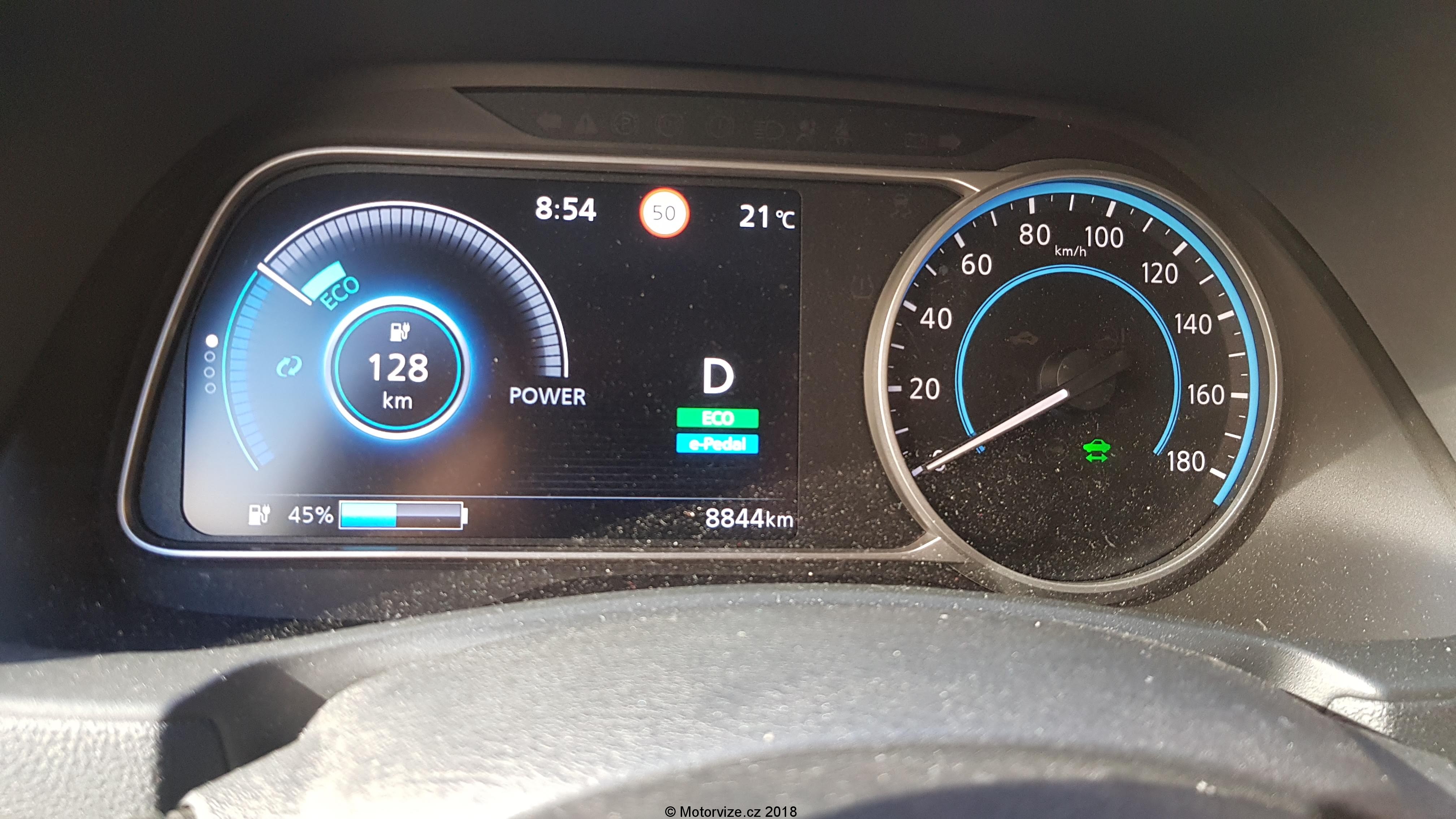 Leaf má v zásadě dva jízdní režimy – ECO a normal. ECO nedovolí řidiči žádné psí kusy s akcelerací, přiznám se bez mučení, ECO režim jsem zapínal zřídka. To samé platí i o e-pedalu, díky kterému za běžného provozu a s dostatečnou dávkou předvídavosti, stačí řidiči k jízdě pouze plynový pedál, protože při jeho uvolnění začne Leaf hned sám brzdit a rekuperovat energii z brždění zpět do baterií. To se dá velmi efektivně využívat v městském provozu při „poskakování“ mezi semafory. Ve městě jsem s Leafem najezdil cca 150km. Město je to správné místo pro elektrického Nissana. Při zapnutém ECO režimu a s využitím rekuperace za pomoci e-pedálu, se zde dá jezdit opravdu velmi úsporně. Když jsem se hodně snažil, šlo dosahovat spotřeby 12 kWh na 100Km. Za celý test jsem se držel na průměru 15,6kWh/100km. Řízení Nissana je vcelku přímé a čitelné, jen naladění tlumičů se mi zdá poněkud tvrdší, to se hodí na nějaký sportovnější hatchback. U ekoauta, se kterým většina majitelů neplánuje někde sprintovat, by se hodilo komfortnější odpružení, které by alespoň zakrylo pražské kostky a nebo tramvajové koleje. Standardem elektromobilů je úplné ticho při rozjezdech a musím se přiznat, že jsem vyděsil nejméně dva zamyšlené chodce hledající odpověď na otázku, kde jsem se tam najednou vzal.