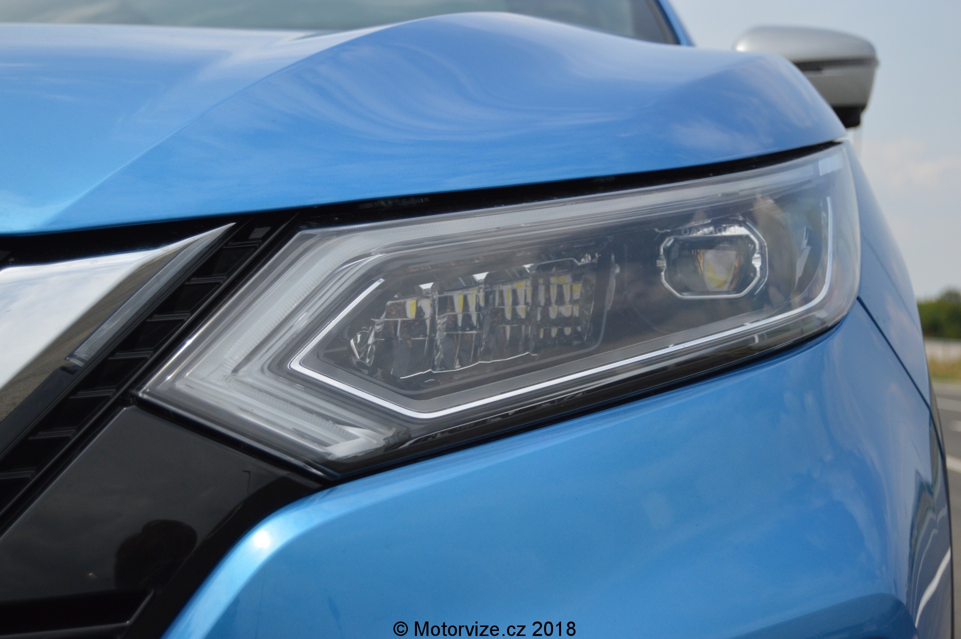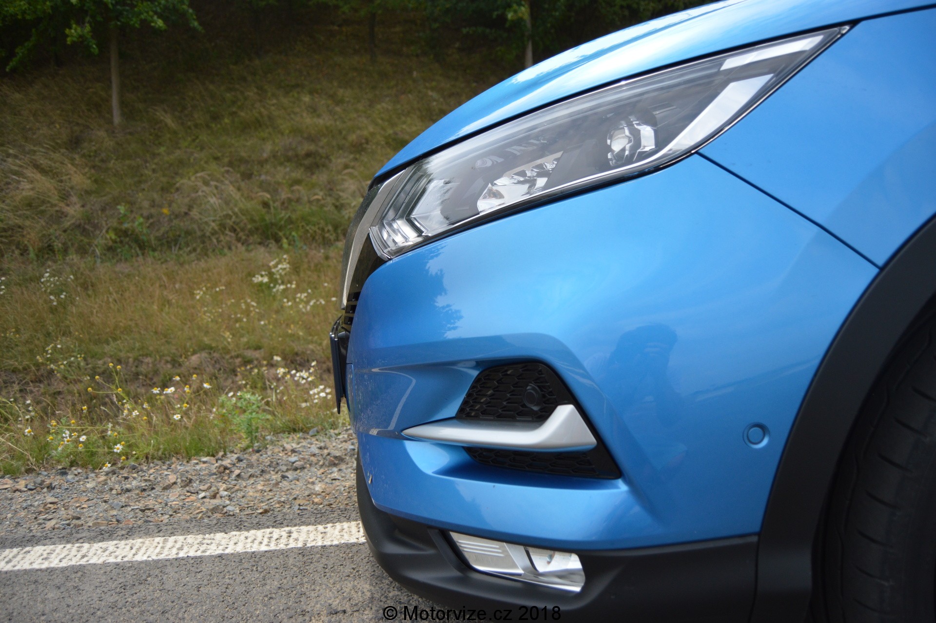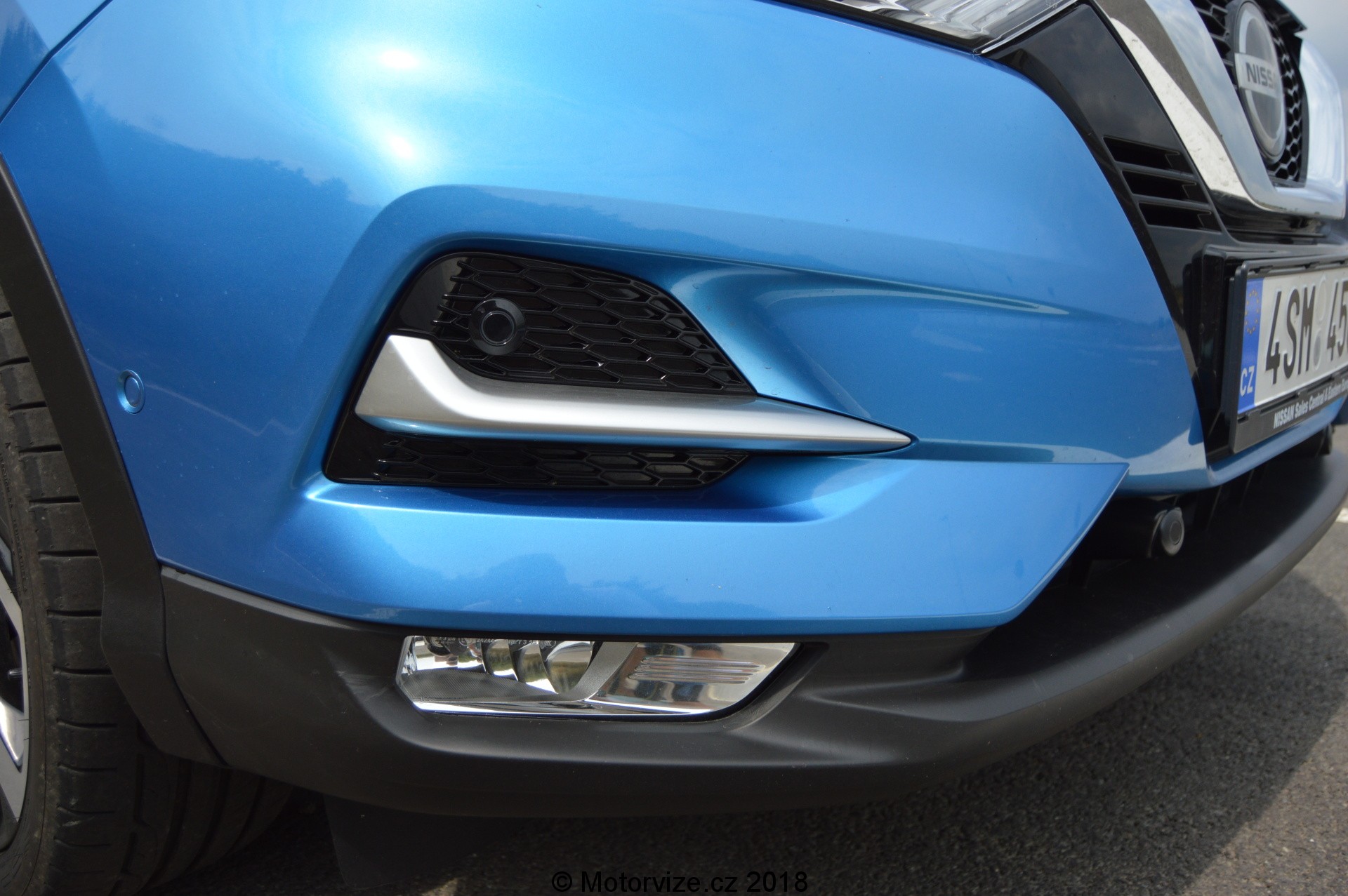 V úvodu jsem zmínil, že je Qashqai relativně nenápadné auto – to však neplatí o kusu ve světle modré barvě, ve které jsem měl vůz zapůjčený já. Ta vyčnívá z davu a pěkně vytáhne ty správné křivky, zrcátka jsou pak lakována do stříbrné barvy, ladící s doplňky masky, ohraničením oken, střešními lyžinami i pěknými 19” koly. Zajímavě je řešené přední logo vozu, které není plastické, ale pouze kruhové – nejspíše zde bude umístěn radar ProPilotu, tedy adaptivního tempomatu v kombinaci s aktivním vedením v pruhu.