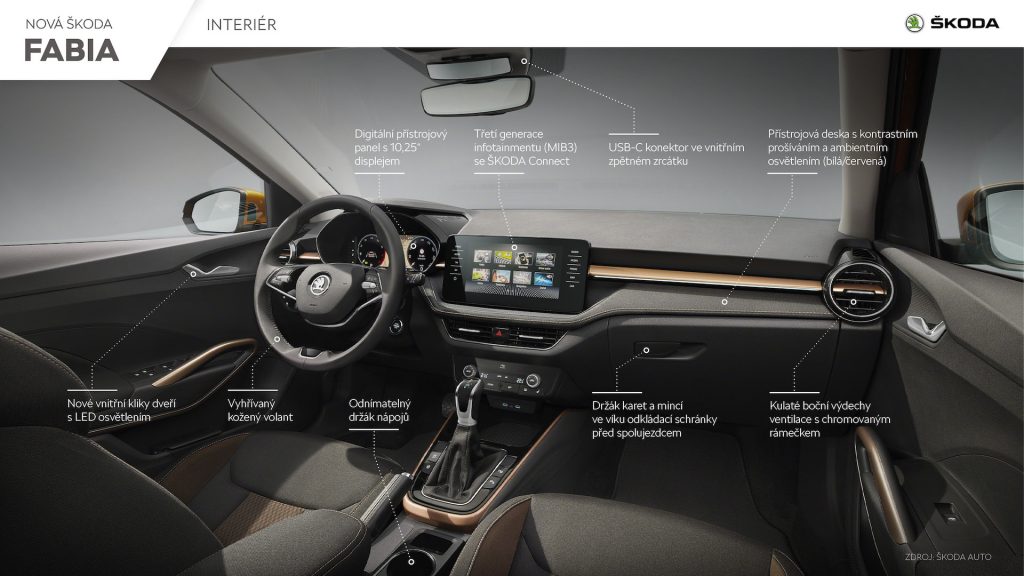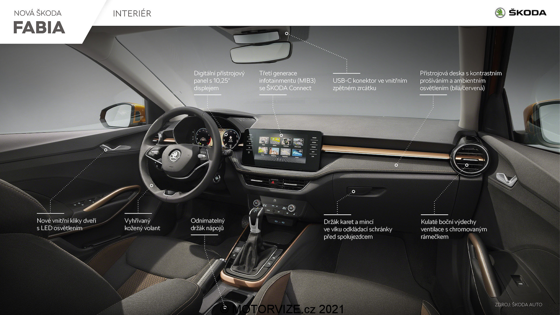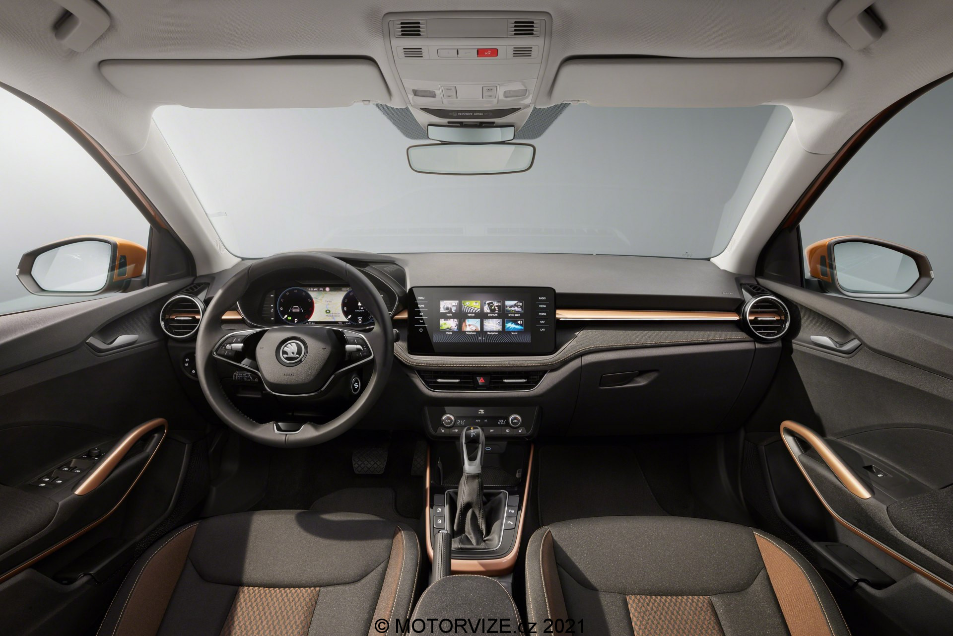 Nová ŠKODA FABIA nabízí díky rozvoru zvětšenému o 94 mm oproti předchozímu modelu ještě více místa především pro cestující na zadních sedadlech. Rozvorem 2 564 m překonává FABIA dokonce první generaci modelu OCTAVIA z roku 1996, která měla rozvor 2 512 mm. Nová FABIA bude při uvedení na trh dostupná ve dvou tradičních výbavových stupních Ambition a Style. Pocit prostornosti dále zvyšuje nový design interiéru. Šíři interiéru podtrhují symetrická přístrojová deska se samostatně stojící centrální obrazovkou a horizontální dekorační lišty v pěti různých barvách v závislosti na výbavovém stupni. Přední část přístrojové desky je čalouněna látkou s kontrastními švy. Nový design umocňují velké kulaté boční výdechy ventilace s chromovaným rámečkem a nové chromované vnitřní kliky dveří. Nové ambientní LED osvětlení, které je standardně součástí výbavového stupně Style, osvětluje dekorační lištu na přístrojové desce červenou a bílou barvou. Součástí ambientního osvětlení je také LED osvětlení středové konzoly vpředu, vnitřních klik předních dveří a LED čtecí lampičky vpředu a vzadu. Design interiéru završují volanty v novém designu. Kožený multifunkční volant a tříramenný sportovní multifunkční volant s pádly pro vozidla vybavená DSG jsou nabízeny na přání, stejně jako vyhřívaný volant a vyhřívané čelní sklo, které zaručuje dobrý výhled a vysokou úroveň bezpečí v zimních měsících.
