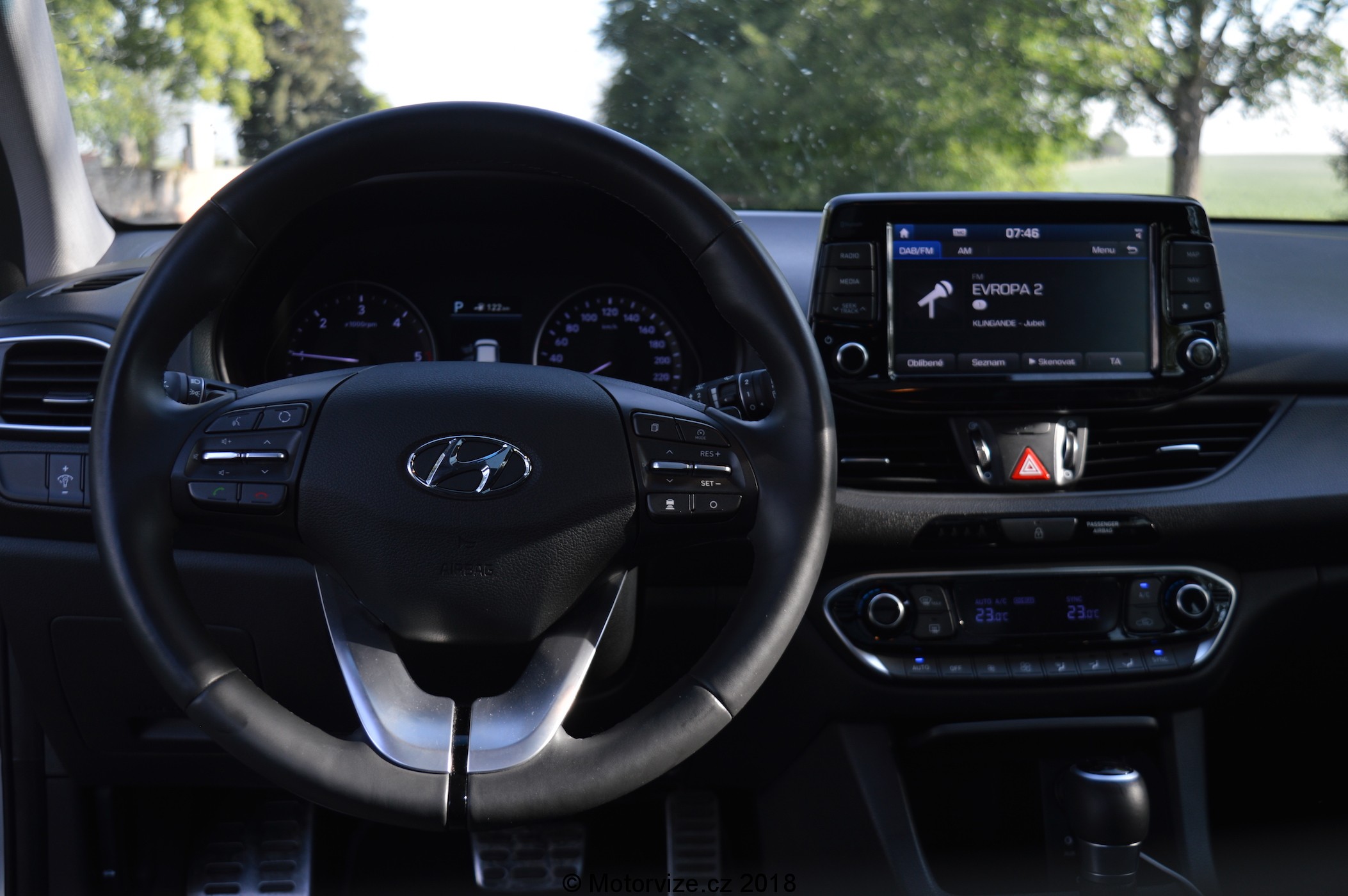 Po chvíli rozhlížení už musím vyrazit. Čeká mě cesta z Úhonic (západně od Prahy) až do Hradce Králové,tedy nějakých 135 kilometrů okresek, městských průjezdů a dálnic. Dost na to, abych hned z kraje zjistil, jak příjemně ubíhají kilometry právě v tomhle autě. Je večer a venku je už tma. Zajímá mne, jak dobře svítí komplet LED světlomety v podání Hjondé. Hned z kraje jsem byl mile překvapen přisvěcovací funkcí v zatáčkách, byť u nových aut už to je celkem běžný prvek. Já se s ní setkal poprvé a musím říci, že opravdu pomůže k pocitu jistotypři nočních, či jakkoliv temných průjezdech těsnými zatáčkami.. Hlavní světla by ale mohla být ještě možná o něco výkonější. Dálková jsou super, vůz měl dokonce i funkci jejich automatické regulace. Nicméně jsem si přesto postesknul nad absencí LED-matrix technologie, kterou Hyundai zatím nenabízí. Na dálnicích je automat velmi citlivý a často dochází k „přirozenému blikajícímu“ efektu, kdy se dálkovky konstantně vypínají a zapínají.