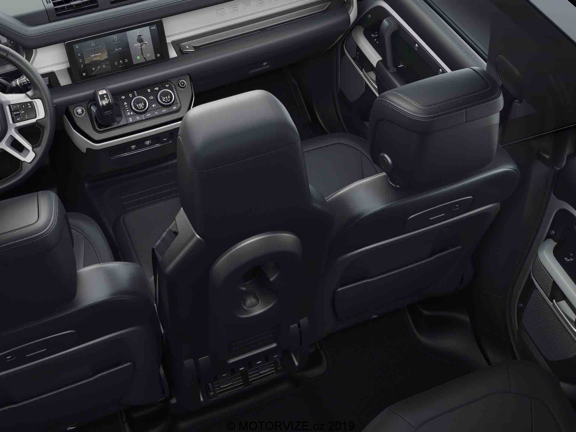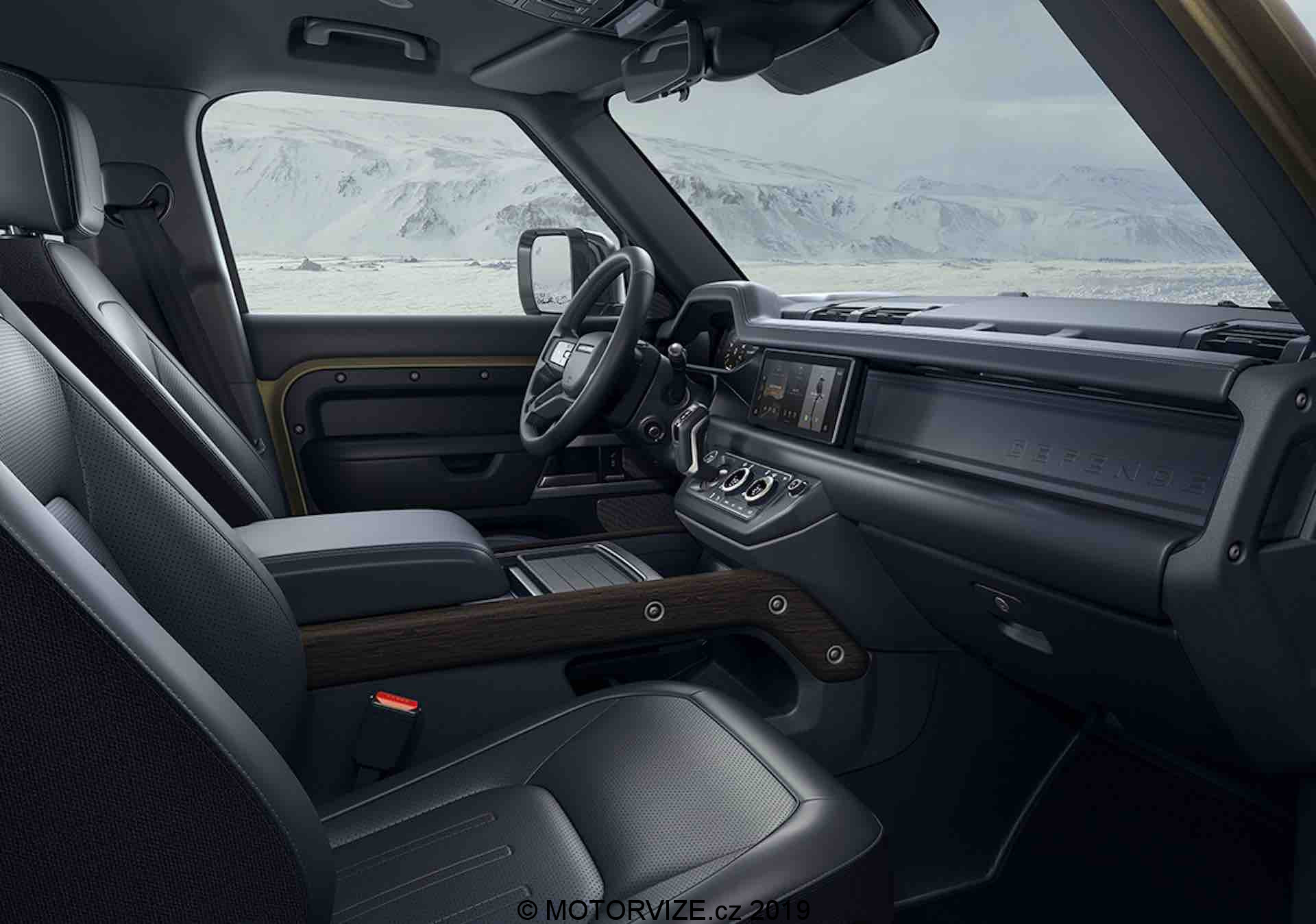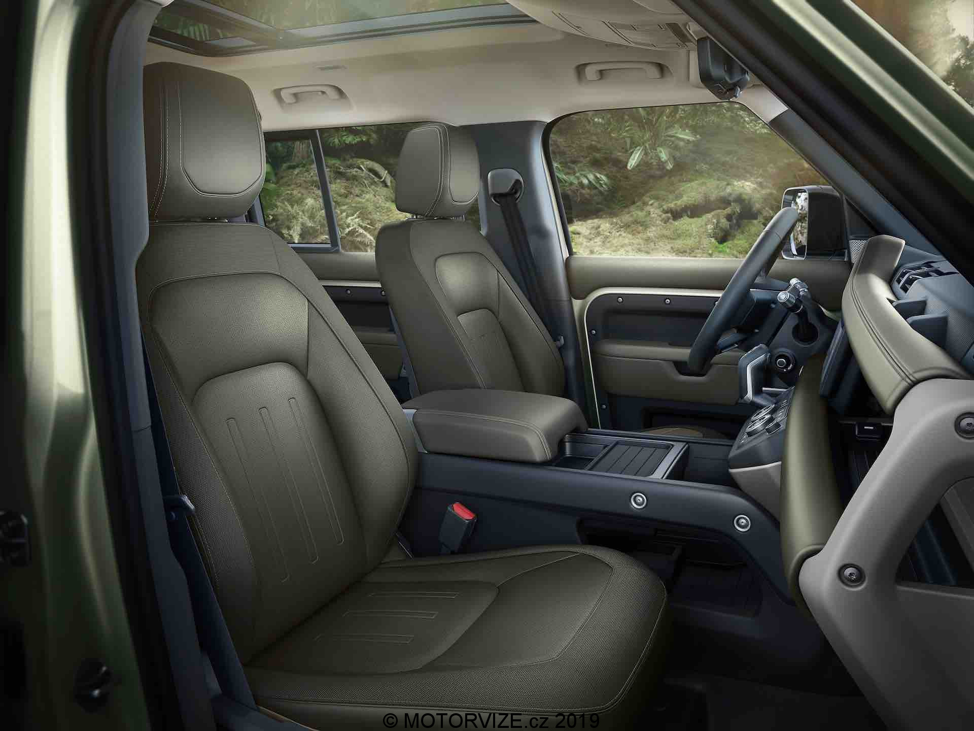 Charakter původního Defenderu byl využit také v interiéru. Běžně skryté části základní karoserie nebo šrouby jsou zde odhalené. Jednou z řady inovací je také volič převodovky umístěný na palubní desce. Díky tomu může být mezi dvojicí předních sedadel ještě třetí sklopné sedadlo. Výsledkem jsou tři místa vedle sebe, přesně jako tomu bylo u původních modelů Land Rover. Land Rover Defender 110 proto nabízí pět nebo šest míst, respektive uspořádání 5+2. Prostor pro zavazadla za druhou řadou sedadel má objem 1 075 litrů. Po sklopení druhé řady to je dokonce 2 380 litrů. Defender 90 bude schopný i při délce kompaktního hatchbacku odvézt až šest osob.
