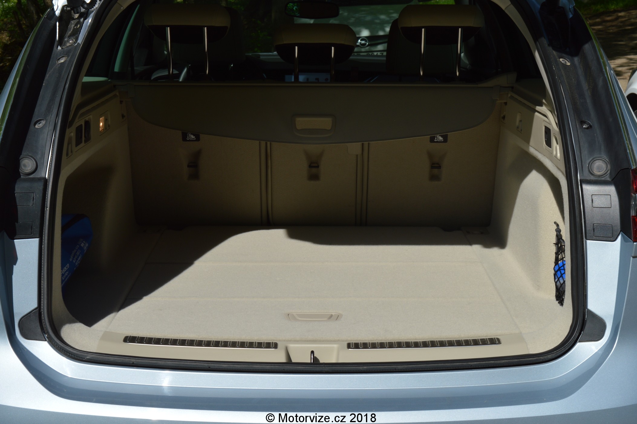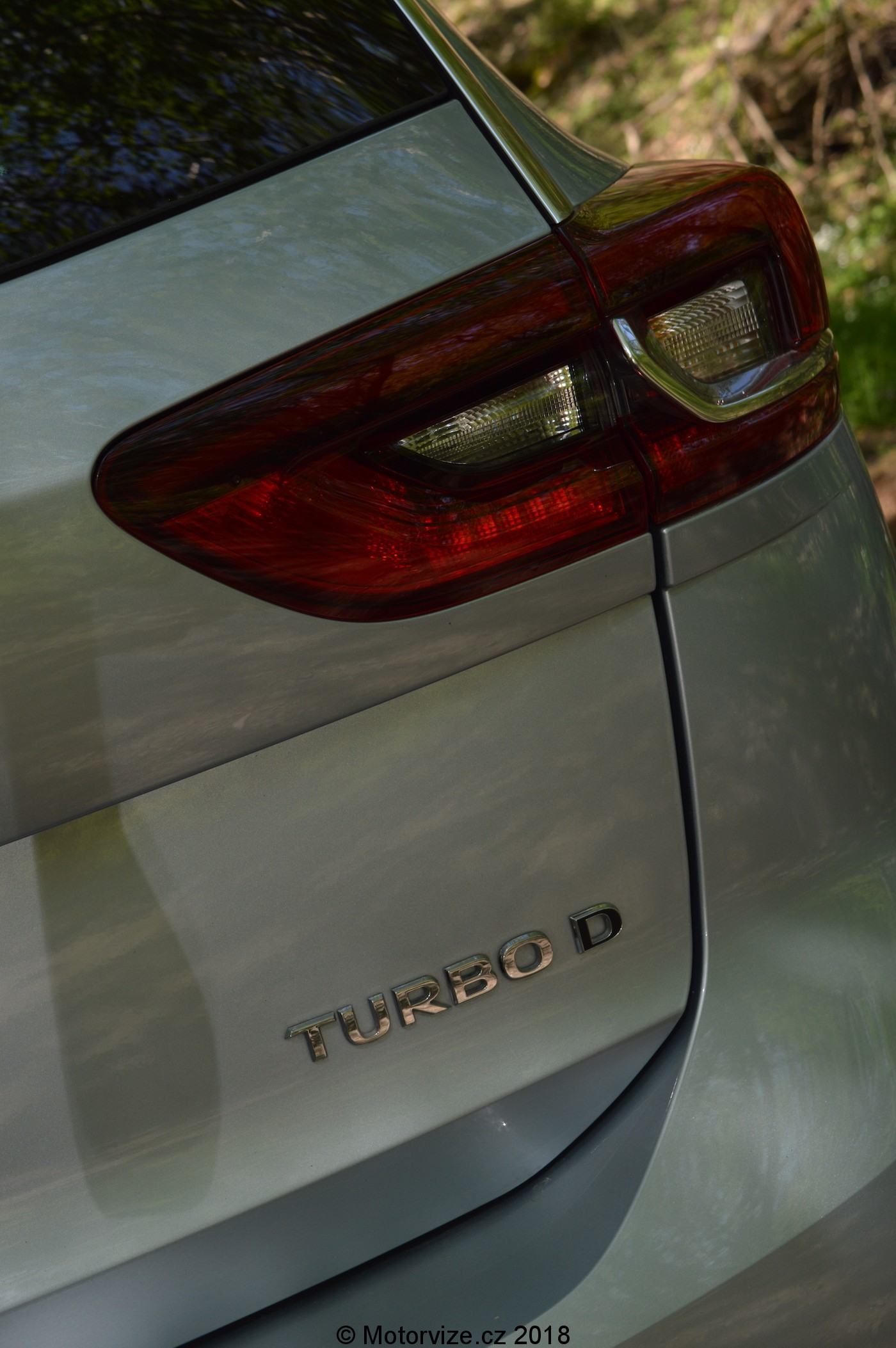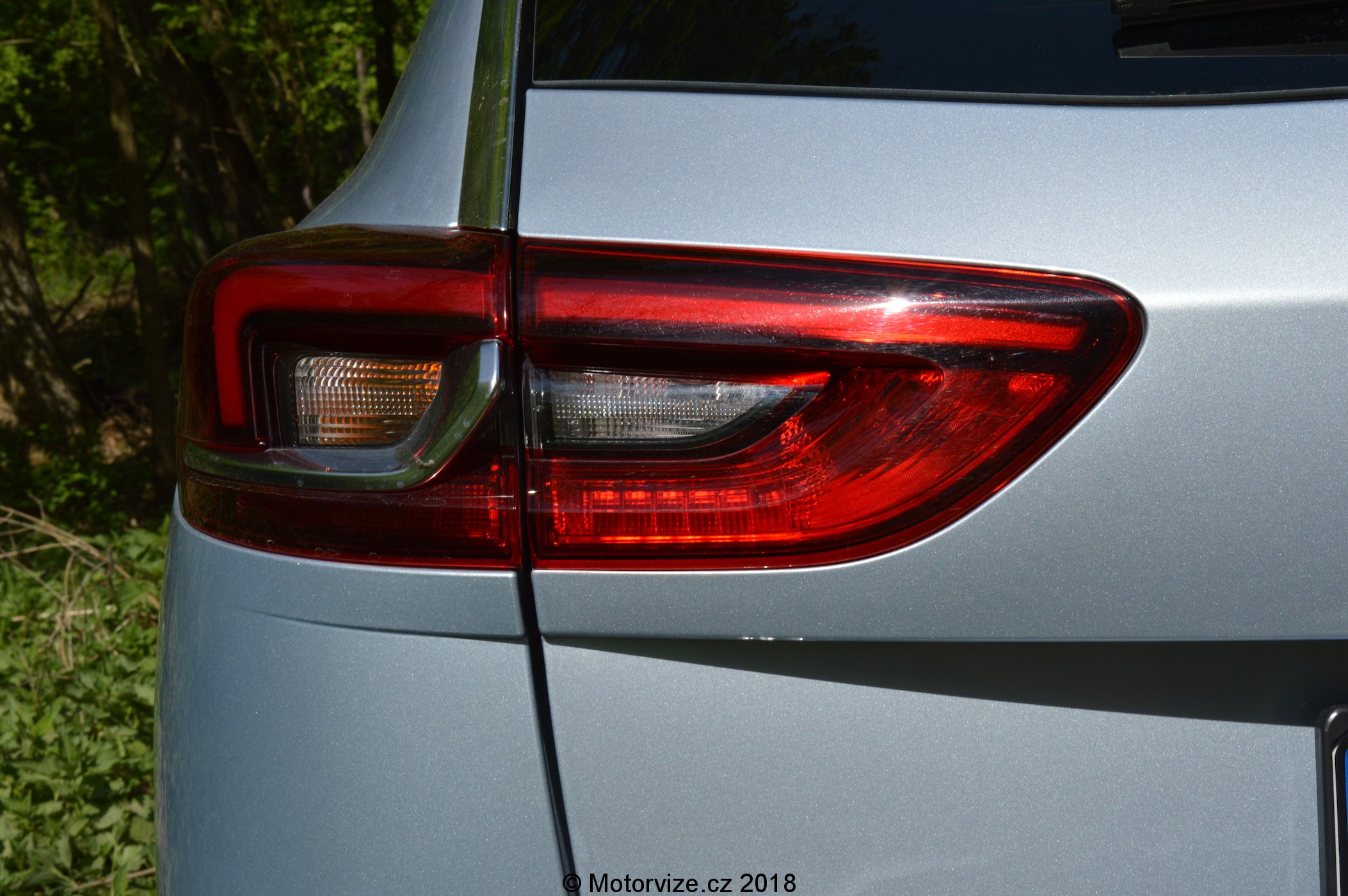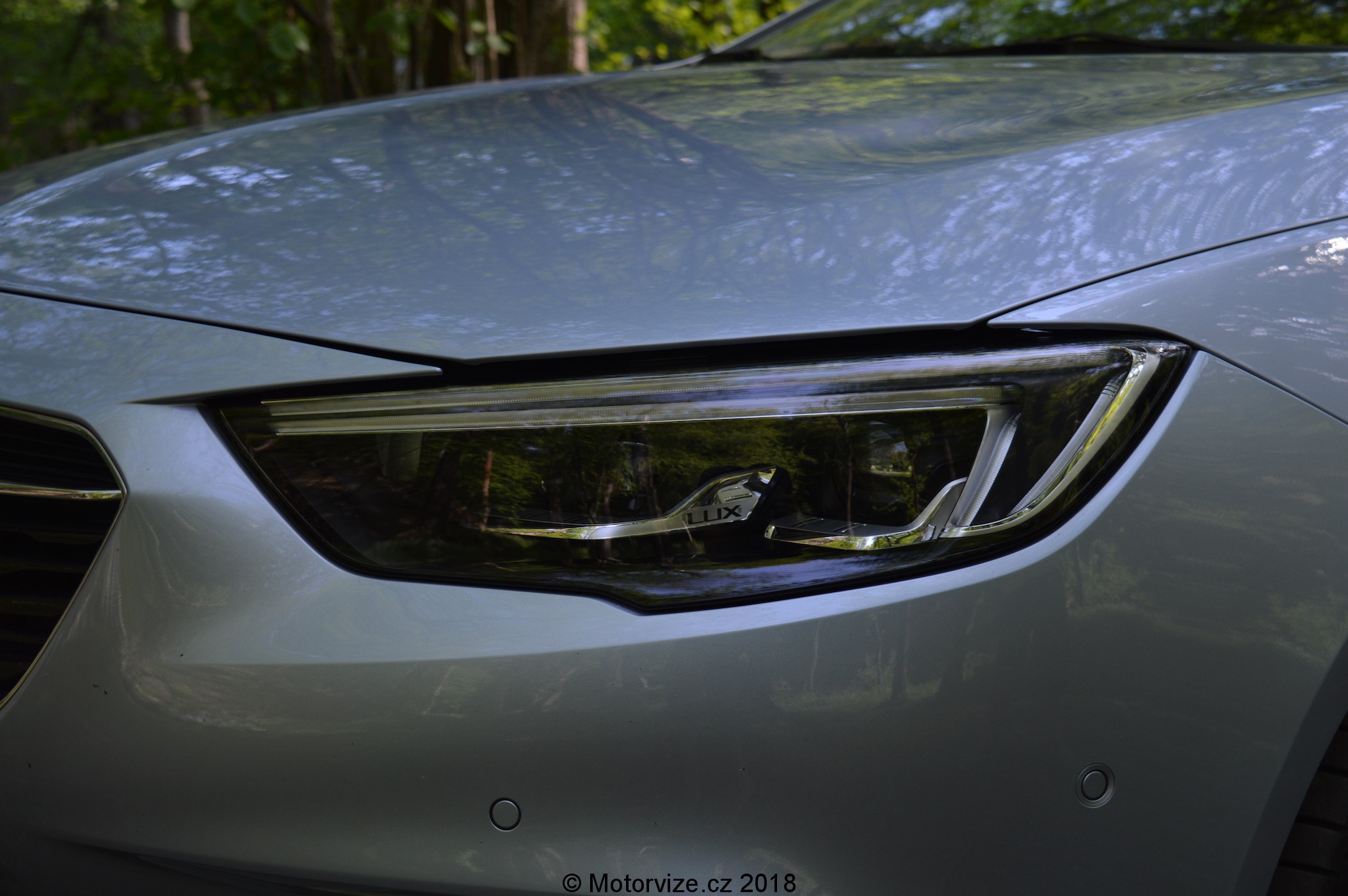 Při prvním pohledu na bok bezmála pětimetrového kombíku (4986 mm) jsem si říkal, že to auto má opravdu šmrnc. Působivá je snižující se linie oken lemovaná chromovou lištou, která se táhne až k zadním svítilnám. Naopak linie střechy se se snižujícími se okny mírně rozšiřuje. Přes oboje dveře se ve spodní části táhne prolis, jež směrem dozadu stoupá k úrovni kliky zadních dveří. Druhá designová linie vede právě v úrovni obou klik a táhne se jak do přední části předních dveří, tak přes zadní dveře a končí s linií zadní svítilny. Ty jsou rozděleny nejen opticky chromovou lištou, která vede od předních zrcátek, ale i mechanicky, linií pátých dveří, a to na dvě části. LED zadní světla jsou rozděleny na dvě části – jedna pevně na karoserii, na pátých dveřích je pak zbytek. Vrchní část zadních dveří kryje mohutné zadní křídlo s bočními ufuky pro snížení aerodynamického odporu zadní části a tím zlepšení vírů za vozem. Dnes se většina automobilek snaží vybudovat nějaký typický designový prvek. U Opelu je to dozajista tvar masky chladiče, který na mě působí rozesmátým dojmem, a potom také tvar LED denního svícení (obrácený bumerang). Novinkou současné generace Opelů jsou nově tvarované chromované lišty, táhnoucí se od znaku, umístěného uprostřed, na obě strany a mírně nahoru do rohů masky. Tvar těchto lišt designově navazuje na kryt adaptivního tempomatu ukrytého právě pod logem automobilky. Jako u každého Opelu, již od nepaměti, i u Insignie můžeme vidět na kapotě lomenou linku táhnoucí se až k přednímu oknu. Světlomety jsou dlouhé a úzké, plně vybavené LED technologií. Jako celek nová Insignia působí velmi sportovně, krátké převisy karoserie vpředu a velká, v našem případě 18 palcová kola, navíc zanechávají i velmi elegantní dojem.