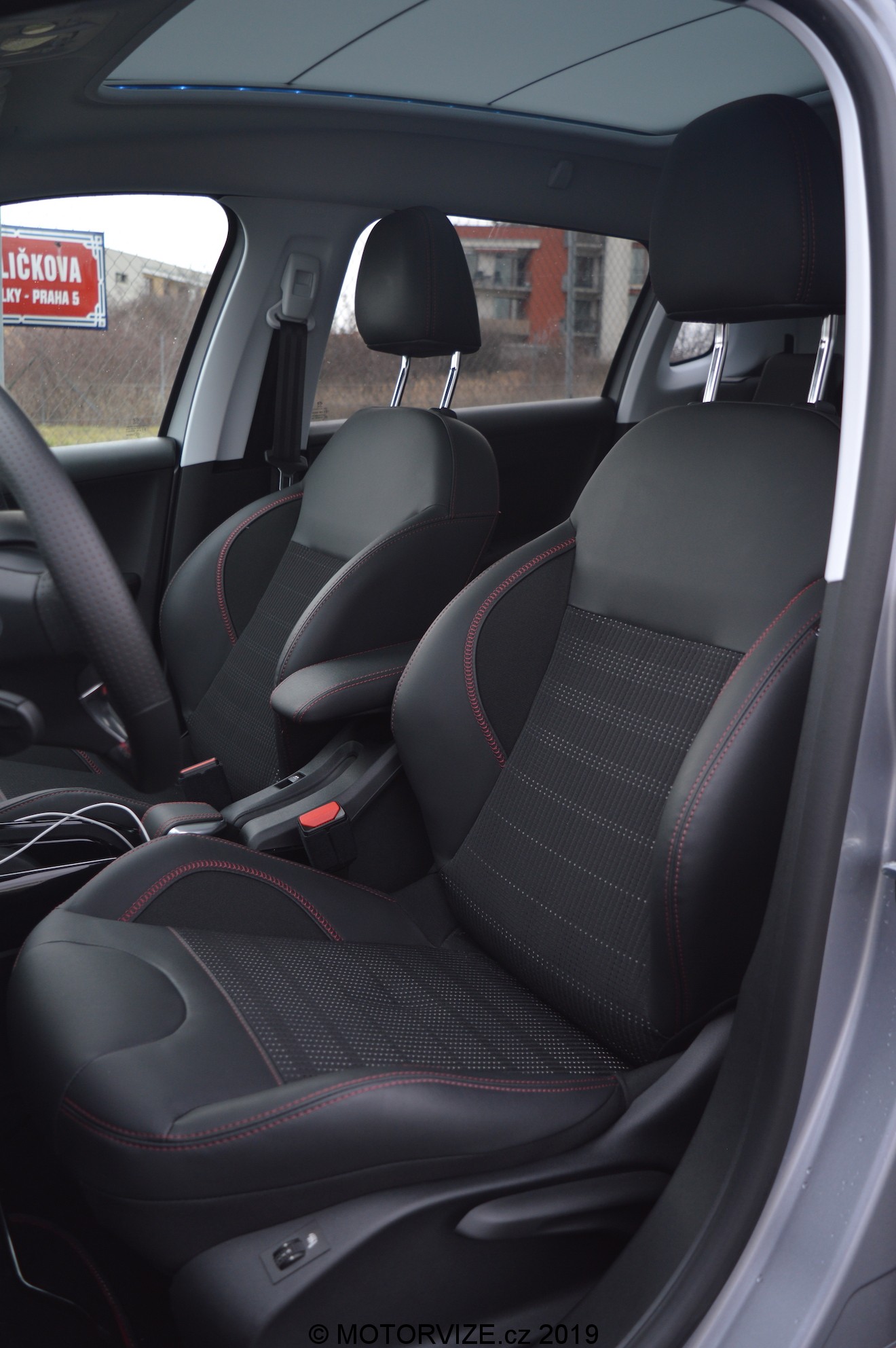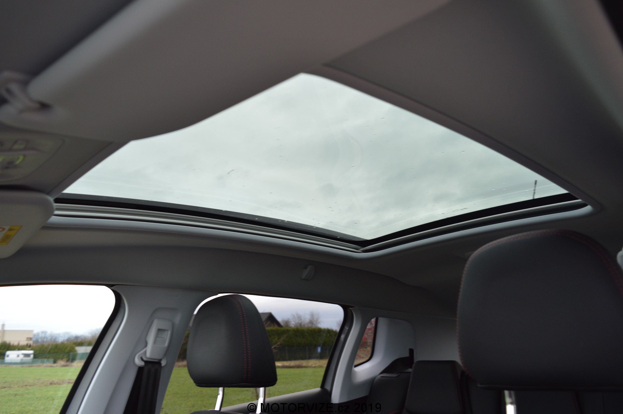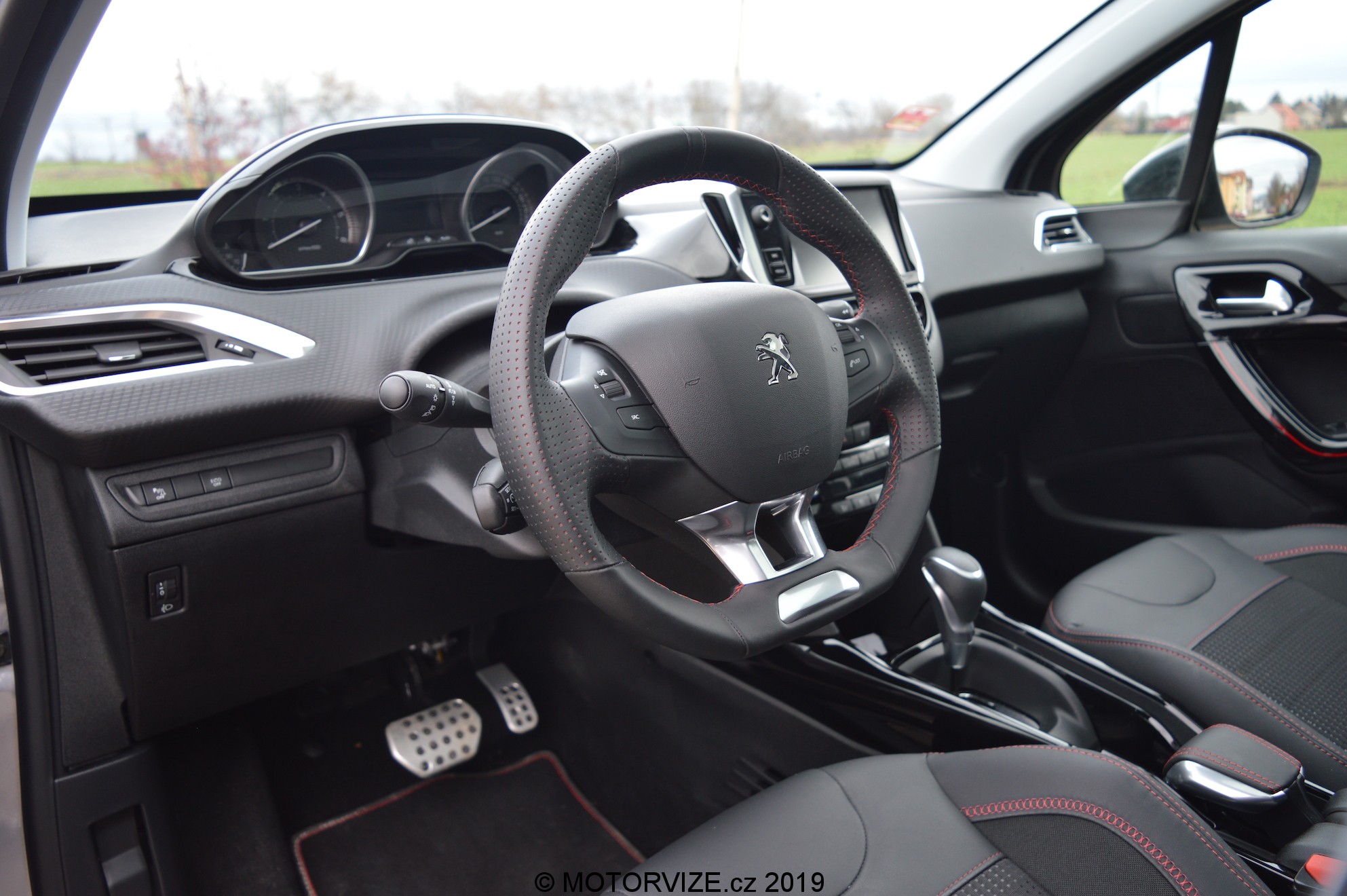 Už bylo mnohokrát zmíněno, že 2008 patří do malých SUV, je to nejmenší SUV značky a prezentuje tak i nejnižší třídu. Ačkoliv naše verze nepatří k těm vyloženě nejprodávanějším, 2008 lze v obecnosti považovat za opravdovou masovku. Však byl nedávno vyroben už miliontý kus tohoto modelu! I proto lze uvnitř zcela bez ostychu očekávat o něco levnější zpracování než v případě řad vyšších. Příkladem je tak poněkud chudší středový panel. Například takový audiosystém se musí spokojit se dvěma tlačítky a jedním titěrným kolečkem na ovládání hlasitosti. I ovládání klimatizace působí tak nějak, řekněme zastarale. Na druhou stranu ale pořád má mechanická tlačítka, což je určitě lepší než ovládání přes dotykový displej. Naopak velmi příjemně a zde i k velikosti docela přiměřeně působí tříramenný volant. V kombinaci s perforovanou kůží a červeným prošitím vypadá hodně sportovně. I uvnitř totiž najdeme prvky GT line, z nichž nejvíce kvituji sedadla. Ta mají velmi slušné boční vedení a ačkoliv bederní opěrku v ceníku nenajdete, záda z nich rozhodně nebolí. K úplné dokonalosti mi chyběl jen o něco delší sedák, v dané třídě to však nelze očekávat. i-Cockpit, koncept celého interiéru vozů značky Peugeot, je zde i v jedné ze svých vůbec prvních verzí pořád atraktivní. Na budíky umístěné výše než v případě konkurence skvěle vidím. Jejich grafika je mimochodem doplněna o působivé podsvícení v podobě červené linky. Právě díky odlišné koncepci mají mé nohy dostatek místa a kolena se tak nedotýkají nepříjemně volantu. Třešničkou na dortu je pak panoramatické střešní okno, které se rozprostírá přes celou střechu a společně s LED podsvětlením za celkových 15.000 Kč navozuje romantickou atmosféru k nezaplacení.