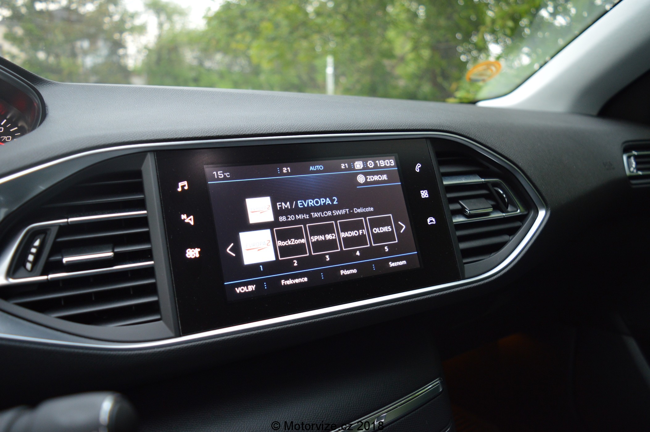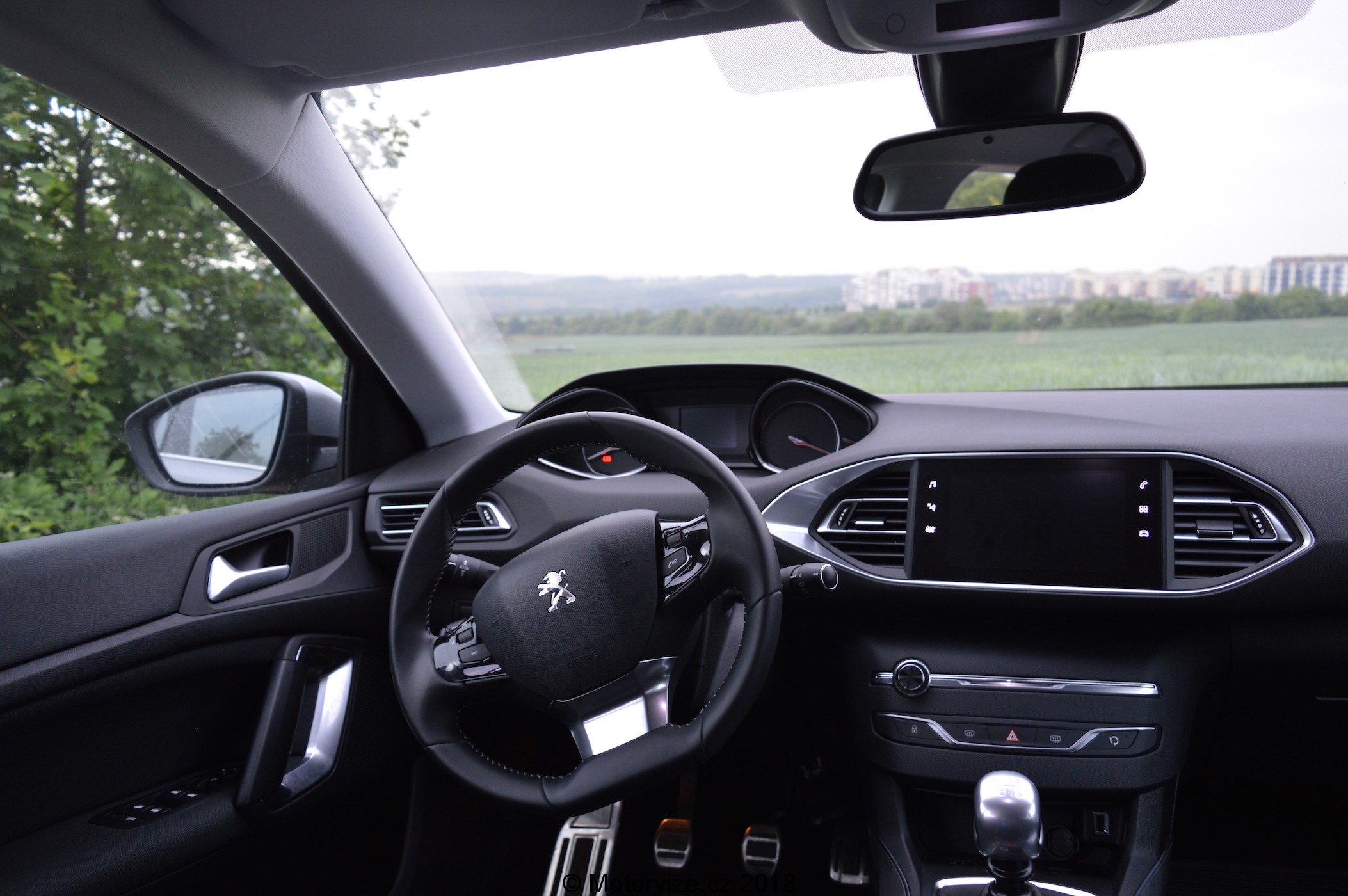 Pokud usednete za volant, možná vás samotné překvapí, kolik „čudlíků“ na vás vybafne. Myslíte si, že hodně? Zde právě naopak. Vlastně téměř všechny vozy od Peugeotu jsou, co se týče počtu tlačítek na palubní desce, jednoduché. Nemusíte se bát, že byste hledali několik hodin nastavování hlasitosti, klimatizace atd. Jednoduchost se mi právě zde líbí. Vím, kam mám šáhnout, ale k řadě řešení ovládacích prvků přichází jedna zatraceně špatná vlastnost, a tou je možná až přehnaná snaha o odstranění mechanických ovladačů. Zatímco někteří nejmenovaní výrobci dnes odstraňují kolečko na hlasitost (s čímž se asi nikdy nesmířím), Peugeot pro změnu odstranil hned všechny ovladače klimatizace (kromě vnitřního okruhu). Nejdříve na displeji zmáčknete tlačítko klimatizace, avšak teplotu pak musíte ručně ovládat na dotykovém displeji, právě zde se to už zdá být přehnané. Někdy je více méně a někdy také ne. Na druhou stranu já samotný vím, co v člověku vyvolává ten pohled, když usednete za volant vozu, který se může chlubit titulem „nejvíce otlačítkovaný vůz“ – taky to není žádná výhra. Možná je to síla zvyku. I zde si člověk musí zvolit, co od svého příštího vozu očekává. A co vlastně samotný posaz? Ten hodnotím velmi pozitivně. Na rodinné auto nižší střední třídy sedím poměrně nízko, koleny se nebouchám o volant a lokty si mohu pohodlně opřít o loketní opěrku bez žádné „úpravy“ svého posazení. Sedadlo upravené k libosti mé, lokty opřené a pravá ruka netrpělivě čeká než zmáčknu (teda spíš přidržím) startovací tlačítko. Vyrážíme.