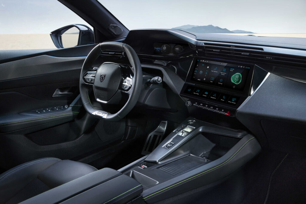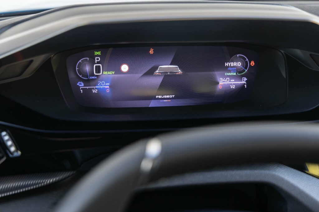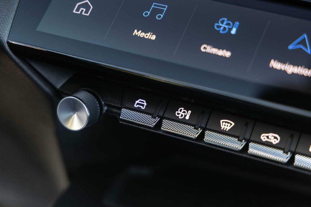 V kabině je ještě jeden displej na středu palubní desky. Jedná se o desetipalcovou dotykovou obrazovku, která je vybavena konfigurovatelnými přepínači i-toggles. Každý přepínač představuje klávesovou zkratku pro nastavení klimatizace, telefonního kontaktu, rozhlasové stanice či spuštění aplikace, nadefinovanou podle potřeby uživatele. Středový displej běží opravdu rychle. Líbí se mi, že se dá nastavit několik oken s widgety nebo zástupci na obrazovce. Pracuje prakticky jako menší tablet. Kromě toho disponuje stálým horním panelem, kde se zobrazuje nastavení klimatizace a také venkovní teplota, včetně času. Navíc nabízí funkci zrcadlení, kdy propojuje chytrý telefon se systémem infotainmentu a to bezdrátově. V případě použití Bluetooth je možné připojit hned dva telefony. Na čem se podepisuje moderní doba, je fakt, že v celém autě naleznete pouze USB-C zásuvky. Jako každodenní spojenec slouží pak povel „OK Peugeot“ s funkcí pro rozpoznávání hlasu. Tento povel zajišťuje přístup ke všem funkcím infotainmentu.