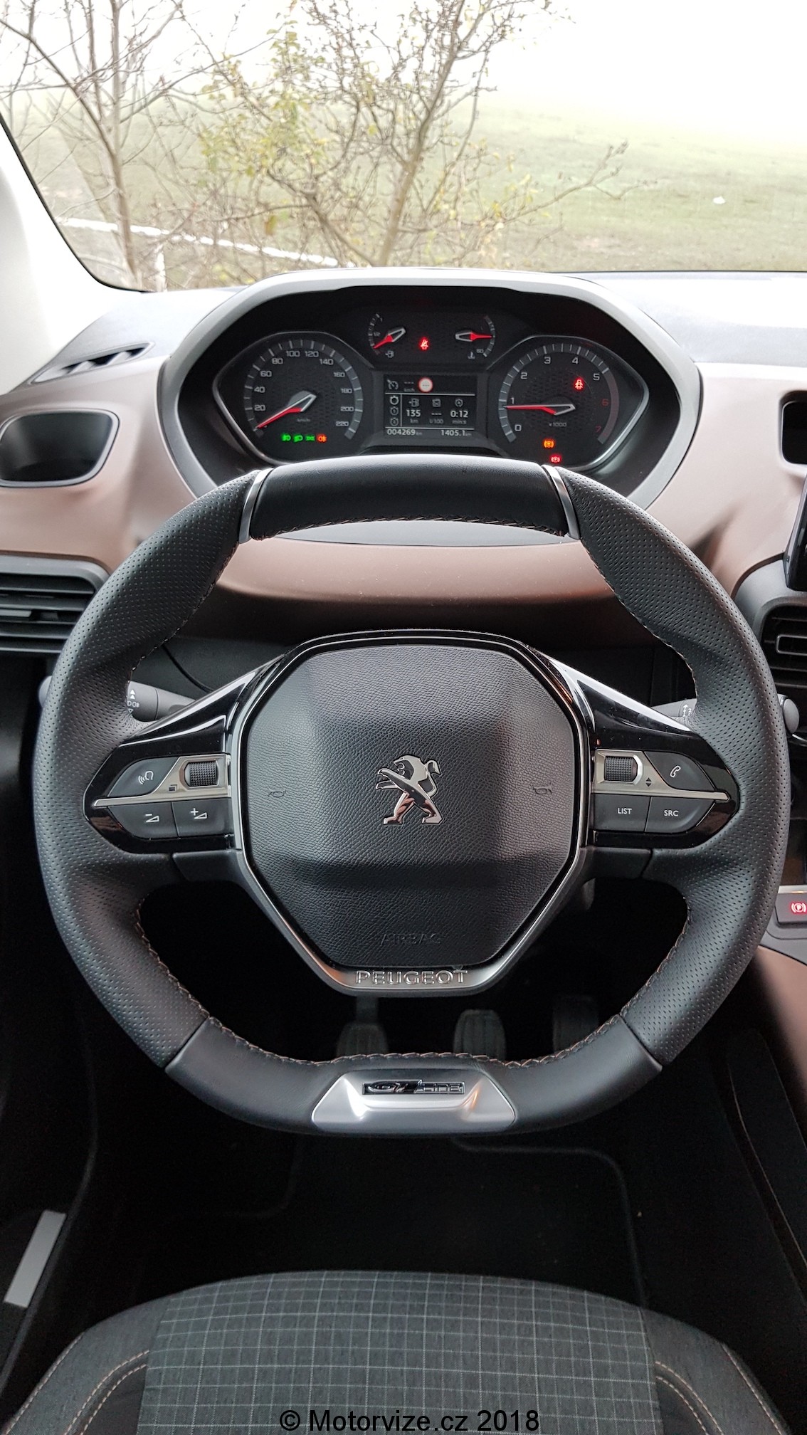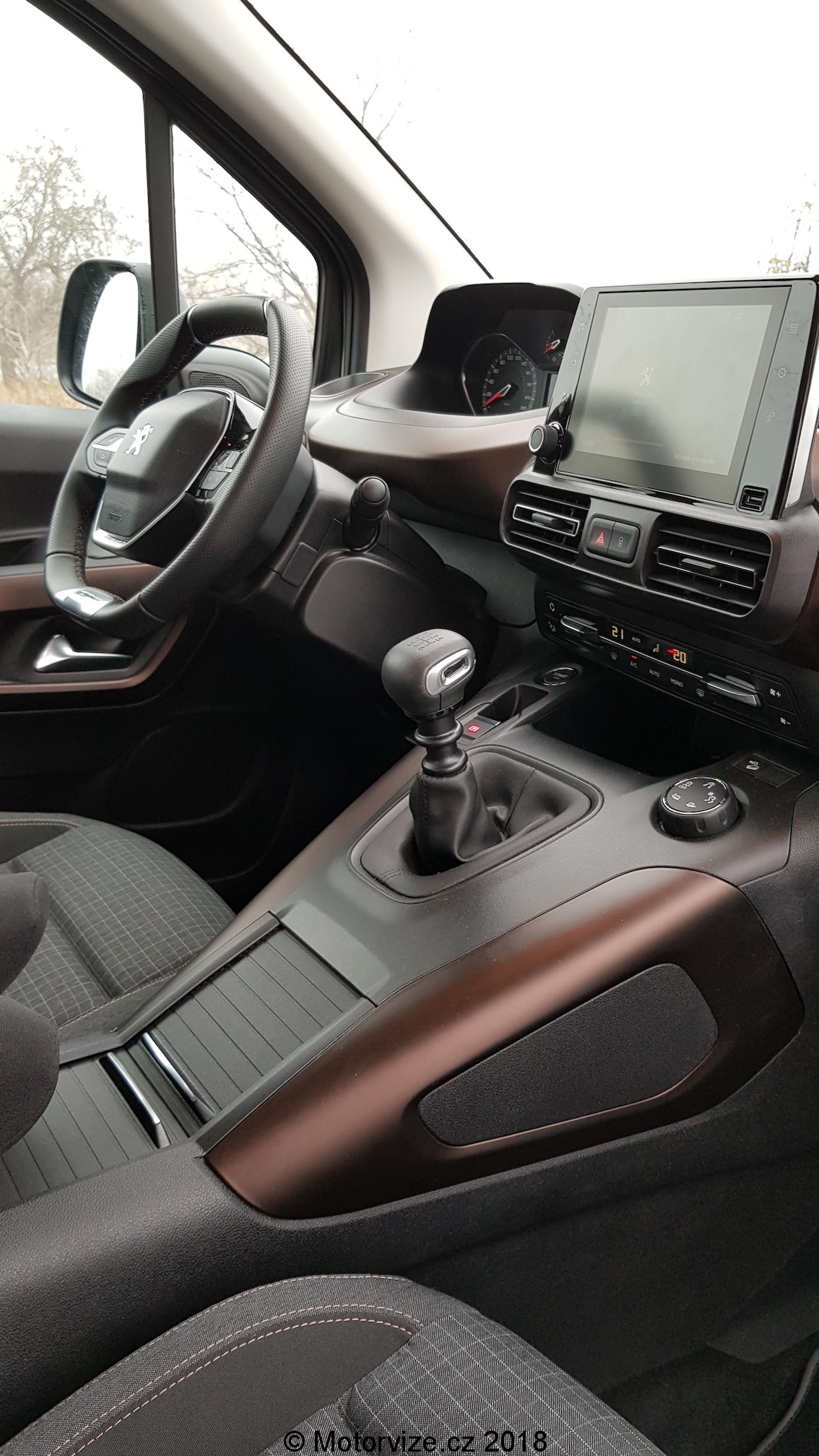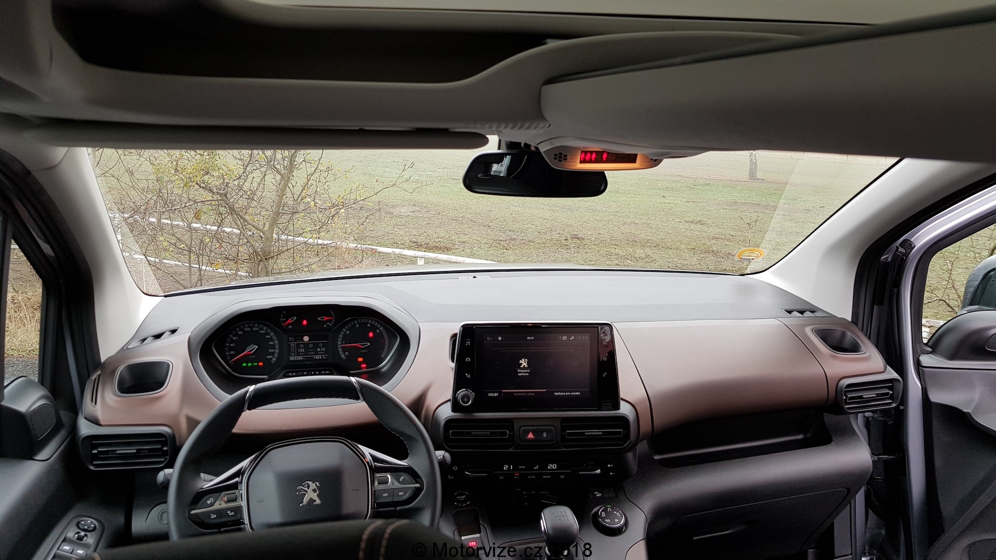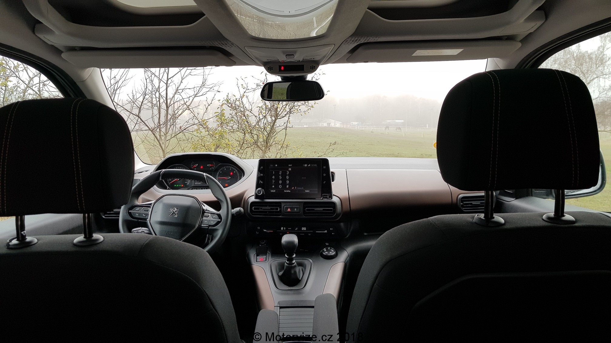 Celému interiéru dominují tři výrazné prvky. Prvním z nich je u Peugeotu i-Cockpit, již tradičně řešená kaplička přístrojů, která je oddělena od volantu a zbytek moderně pojatého interiéru. Volant je vcelku malý a má zploštělou spodní a vrchní hranou. Je takový rádoby sportovní, i když podle mého názoru se do takovéhoto typu auta moc nehodí. S rozmístěním i-Cockpitu mám já osobně bohužel vcelku problém. Když si nastavím volant a sedadlo tak, abych seděl, jak potřebuji, u ostatních modelů si stíním na část přístrojů. U Riftera tomu tak ale není, dokonce musím říci, že to je Peugeot, ve kterém se mi za poslední dobu sedělo asi nejlépe, a to i přes to, že jde o hodně vysoký posez. Přístrojová deska je opticky rozdělena na čtyři části. Na stranách jsou velké kulaté ukazatele rychlosti a otáček, uprostřed nad nimi je oválný prostor, kde se nachází ukazatele teploty motoru a stavu paliva v nádrži. Uprostřed mezi budíky je malý displej zobrazující zbytek informací pro řidiče. Druhým dominantním prvkem interiéru je opravdu mohutný středový tunel, který se směrem dopředu rozšiřuje do stran i nahoru. Na tunelu se nachází pouze řadící páka, volič jízdních režimů, ovladač elektronické brzdy, tlačítko start / stop a přihrádka. Na můj vkus je zbytečně veliký a prázdný. Je pravda, že je uvnitř umístěn velký úložný prostor. Na vrchní hranu středového panelu navazuje sada mechanických ovladačů na ventilaci s obdélníkovými výdechy, mezi kterými jsou umístěna dvě tlačítka. Zbytek ovládání je již přes displej umístěný nad výdechy. Barevná kombinace černých a hnědých plastů je decentní, bohužel jsou všechny plasty tvrdé. Posledním výrazným prvkem, kterého si můžete všimnout až když jste uvnitř, je panoramatická střecha s velkým osvětlovacím panelem uprostřed. Ta propouští přes látkovou zástěnu velké množství světla, a tím za dne dělá interiér velmi vzdušný. Naopak osvětlovací panel zase pomáhá s podsvícením za tmy, a to v několika úrovních. Musím podotknout, že děti z toho byly opravdu nadšené. Ve druhé řadě se nacházejí tři samostatně sklopná sedadla, kde každé z nich má vlastní ISOFIX pro dětské sedačky. Bohužel jednotlivá sedadla nelze posouvat v žádném směru.