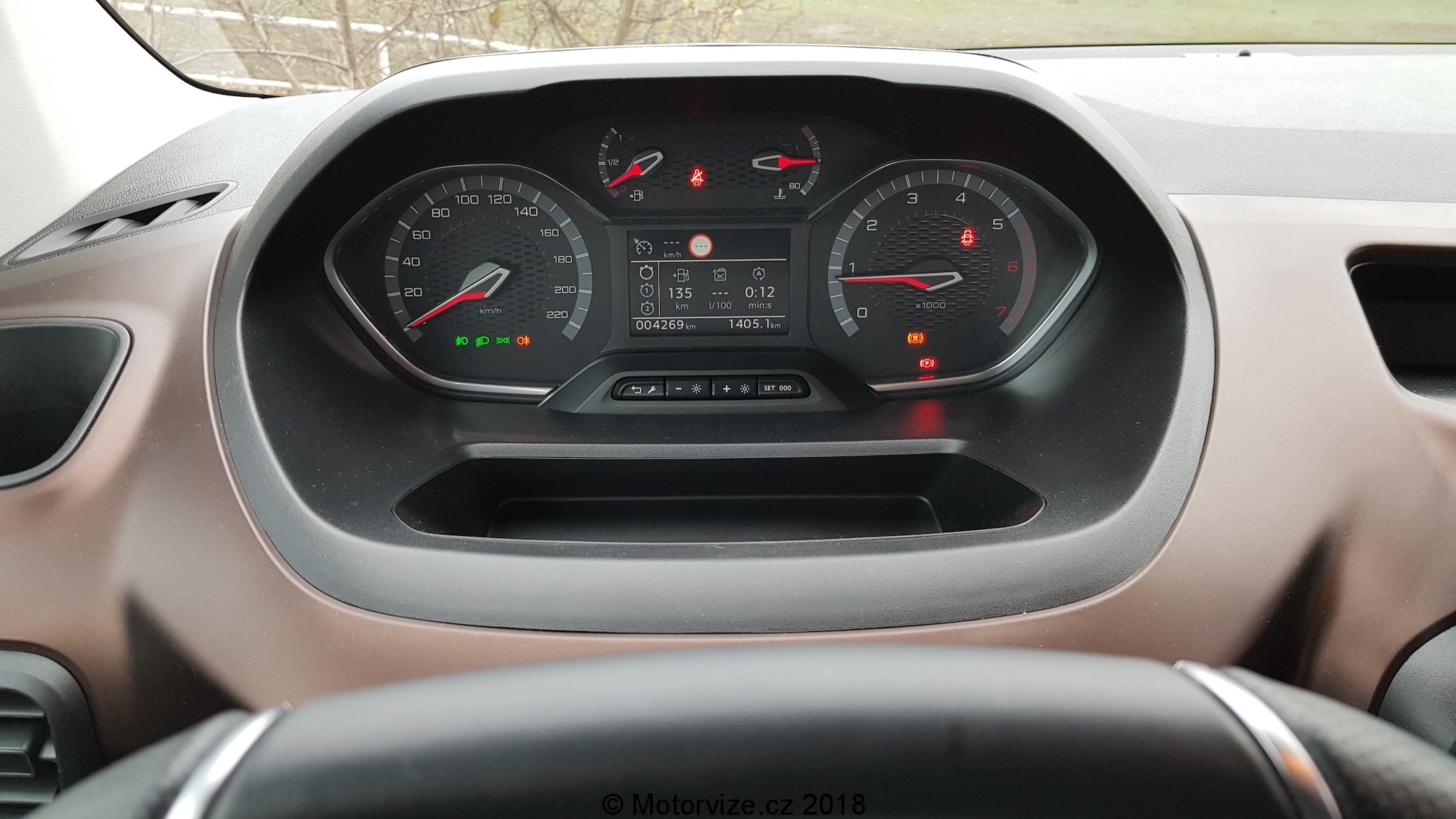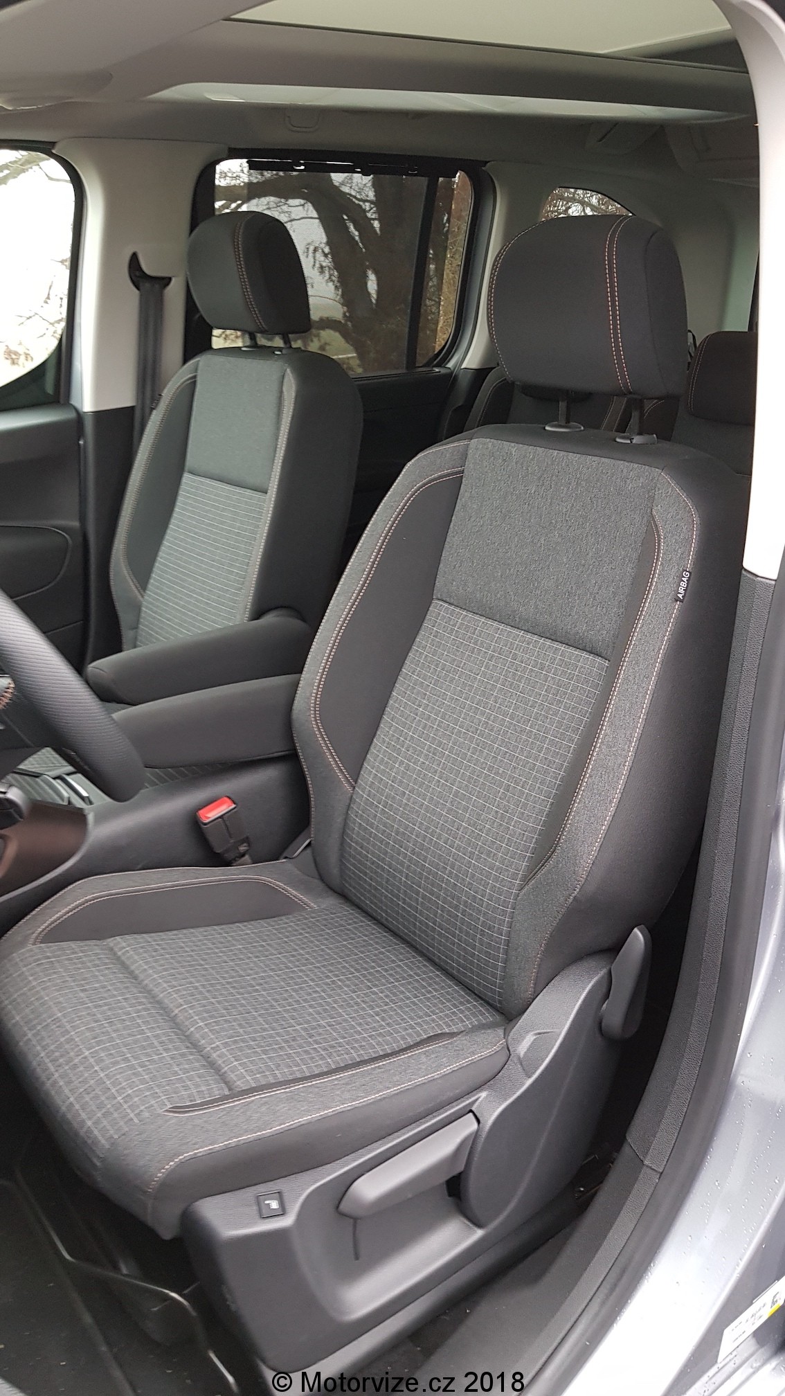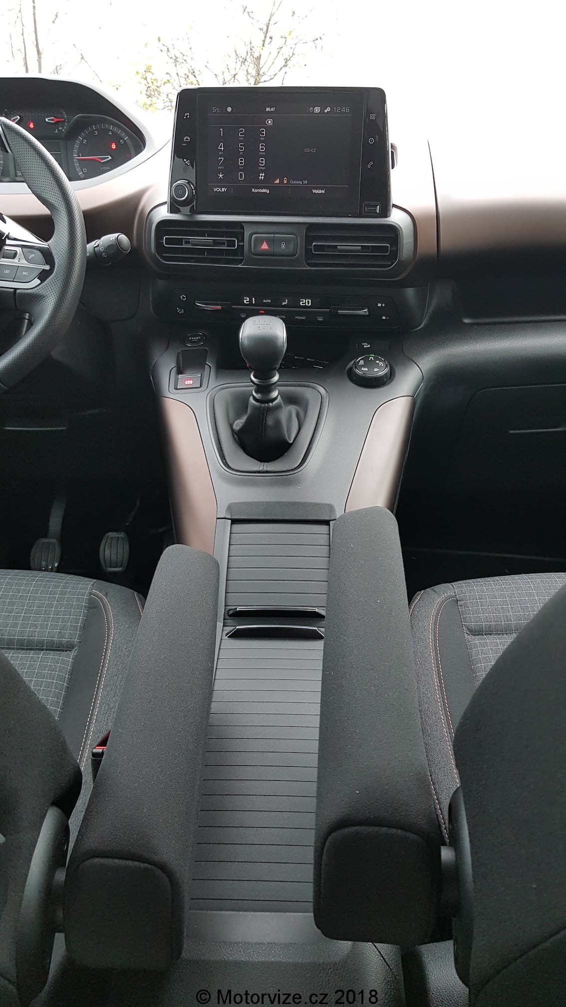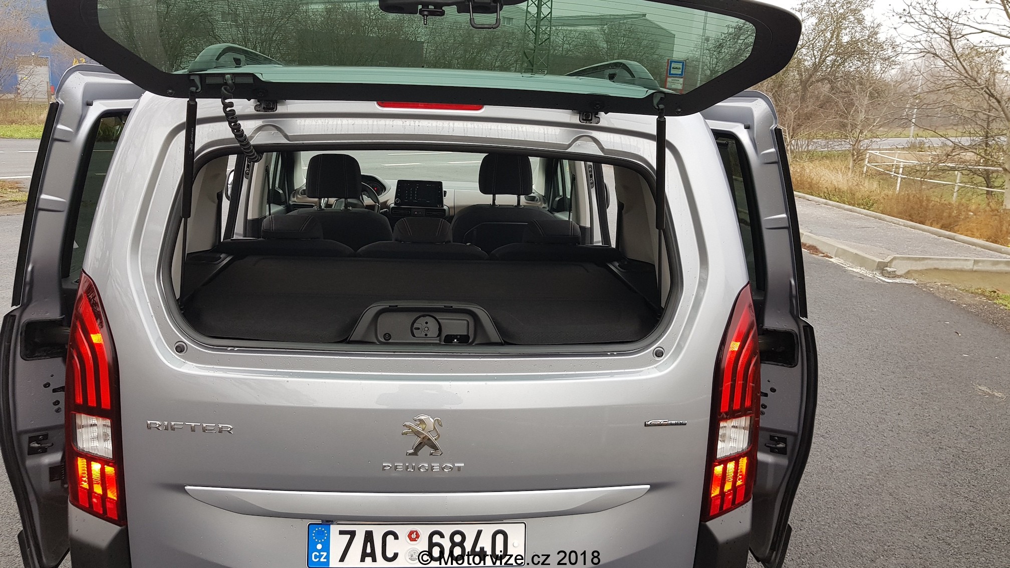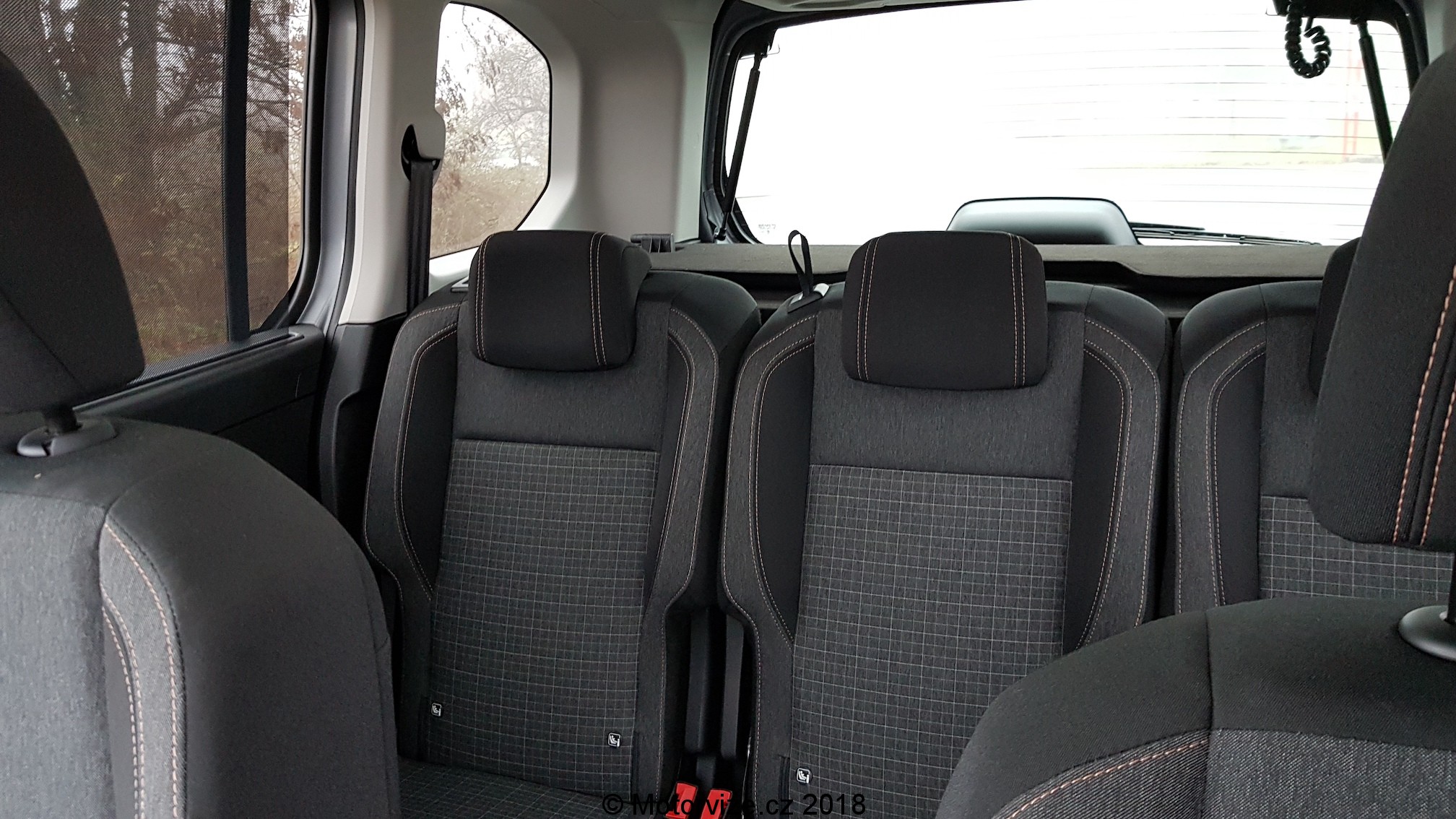 Celému interiéru dominují tři výrazné prvky. Prvním z nich je u Peugeotu i-Cockpit, již tradičně řešená kaplička přístrojů, která je oddělena od volantu a zbytek moderně pojatého interiéru. Volant je vcelku malý a má zploštělou spodní a vrchní hranou. Je takový rádoby sportovní, i když podle mého názoru se do takovéhoto typu auta moc nehodí. S rozmístěním i-Cockpitu mám já osobně bohužel vcelku problém. Když si nastavím volant a sedadlo tak, abych seděl, jak potřebuji, u ostatních modelů si stíním na část přístrojů. U Riftera tomu tak ale není, dokonce musím říci, že to je Peugeot, ve kterém se mi za poslední dobu sedělo asi nejlépe, a to i přes to, že jde o hodně vysoký posez. Přístrojová deska je opticky rozdělena na čtyři části. Na stranách jsou velké kulaté ukazatele rychlosti a otáček, uprostřed nad nimi je oválný prostor, kde se nachází ukazatele teploty motoru a stavu paliva v nádrži. Uprostřed mezi budíky je malý displej zobrazující zbytek informací pro řidiče. Druhým dominantním prvkem interiéru je opravdu mohutný středový tunel, který se směrem dopředu rozšiřuje do stran i nahoru. Na tunelu se nachází pouze řadící páka, volič jízdních režimů, ovladač elektronické brzdy, tlačítko start / stop a přihrádka. Na můj vkus je zbytečně veliký a prázdný. Je pravda, že je uvnitř umístěn velký úložný prostor. Na vrchní hranu středového panelu navazuje sada mechanických ovladačů na ventilaci s obdélníkovými výdechy, mezi kterými jsou umístěna dvě tlačítka. Zbytek ovládání je již přes displej umístěný nad výdechy. Barevná kombinace černých a hnědých plastů je decentní, bohužel jsou všechny plasty tvrdé. Posledním výrazným prvkem, kterého si můžete všimnout až když jste uvnitř, je panoramatická střecha s velkým osvětlovacím panelem uprostřed. Ta propouští přes látkovou zástěnu velké množství světla, a tím za dne dělá interiér velmi vzdušný. Naopak osvětlovací panel zase pomáhá s podsvícením za tmy, a to v několika úrovních. Musím podotknout, že děti z toho byly opravdu nadšené. Ve druhé řadě se nacházejí tři samostatně sklopná sedadla, kde každé z nich má vlastní ISOFIX pro dětské sedačky. Bohužel jednotlivá sedadla nelze posouvat v žádném směru.