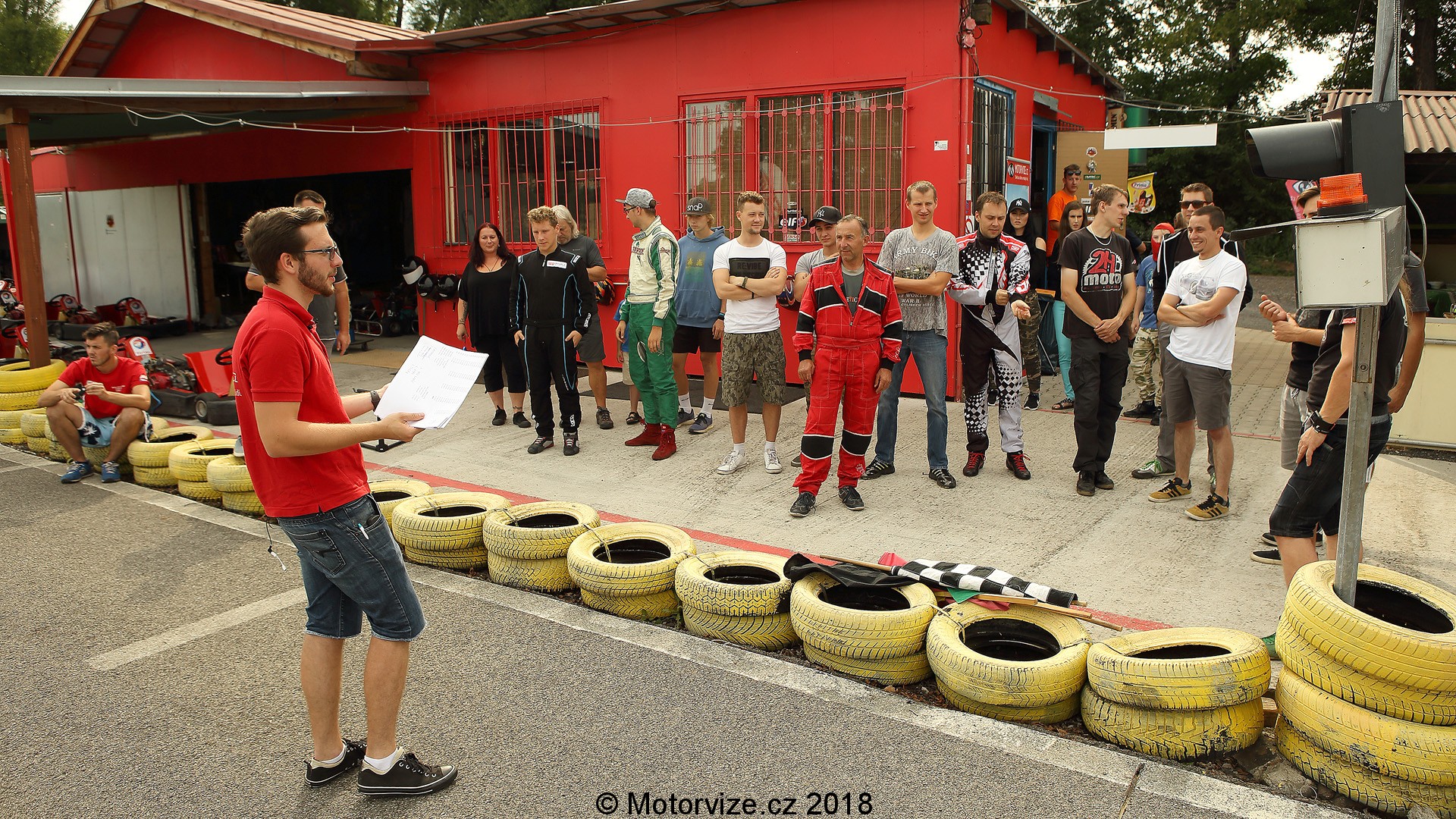 Nemám ani v nejmenším chuť rozepisovat vám vše, co se děje před startem. Jistě chápete, že jako promotéři vstáváme brzo ráno a chystéme vše na závod. Věřím, že máme i mezi řadou z vás nějaké ty obdivatele. To ale ponechme stranou. Rozprava s dnešními jezdci je naplánována na 13:30, řada z nich se ale shromažďuje u dráhy už dlouho před požadovaným příjezdem. To zas musím ocenit já. V každé pozvánce zvu naše milé závodníky a nabádám je, aby dorazili co nejdíve, vyzkoušeli pořádně trať a doladili strategii. Tomu se tak děje i tentokrát. Na rozpravě si jednou zahraji na „ředitele závodu“ a zejména prosím všechny přítomné, aby se stali takovou malou velkou motoristickou rodinou, která drží spolu a nepotřebuje přehnanou rivalitu mezi jednotlivými členy. Nezdžujme. Přichází čas na kvalifikaci. Málem bych zapomněl. Ještě nám chybí vylosovat motokáry. Ano, slyšíte dobře. Čísla motokár se i letos losují tak, aby nikdo nebyl zvýhodněn. Všichni totiž víme, že někomu může vyhovovat 1 a druhému 2. Na závod pak každý tým sedá do motokáry s číslem o jedno vyšším, než bylo to v kvalifikaci. Cílem je samozřejmě snaha o co možná největší objektivnost. Do kvalifikace se pak rozjíždí všech šest týmů. Výsledek asi nikoho nepřekvapí, první se na start postaví lonští i předlonští vítězové z Pardubic, s novým jménem se vevedení Honzy Starého představil tým Fast & Furios.