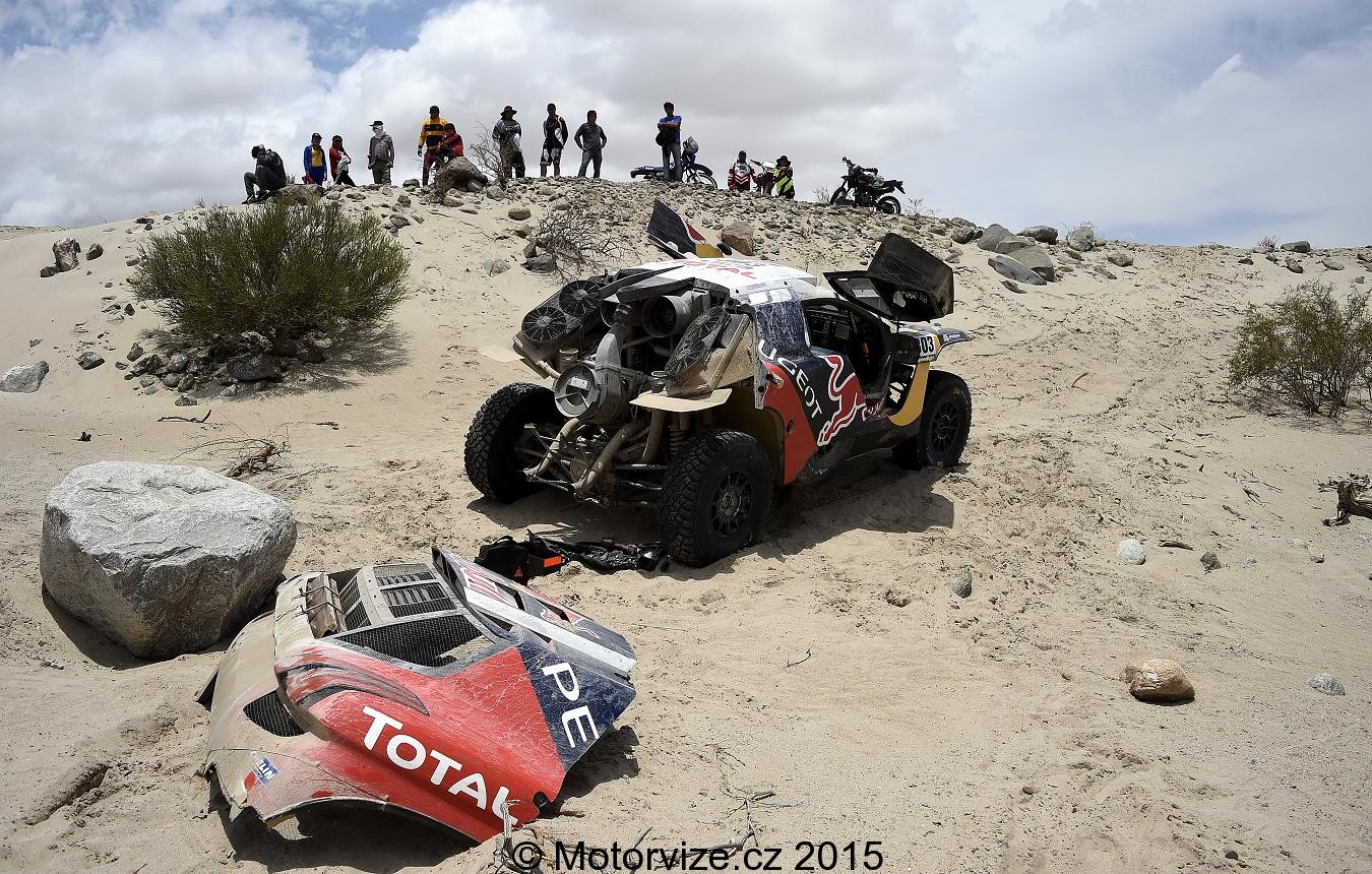 Do začátků osmé etapy suveréní favorit Sebastian Loeb se se svým Peugeotem dostal nyní do problémů, když 510 km před cílem havaroval a svůj automobil zahrabal. Na pomoc mu museli přispěchat domorodci s lopatami. Loeb nabral hodinovou ztrátu a propadl se až na průběžné osmé místo.