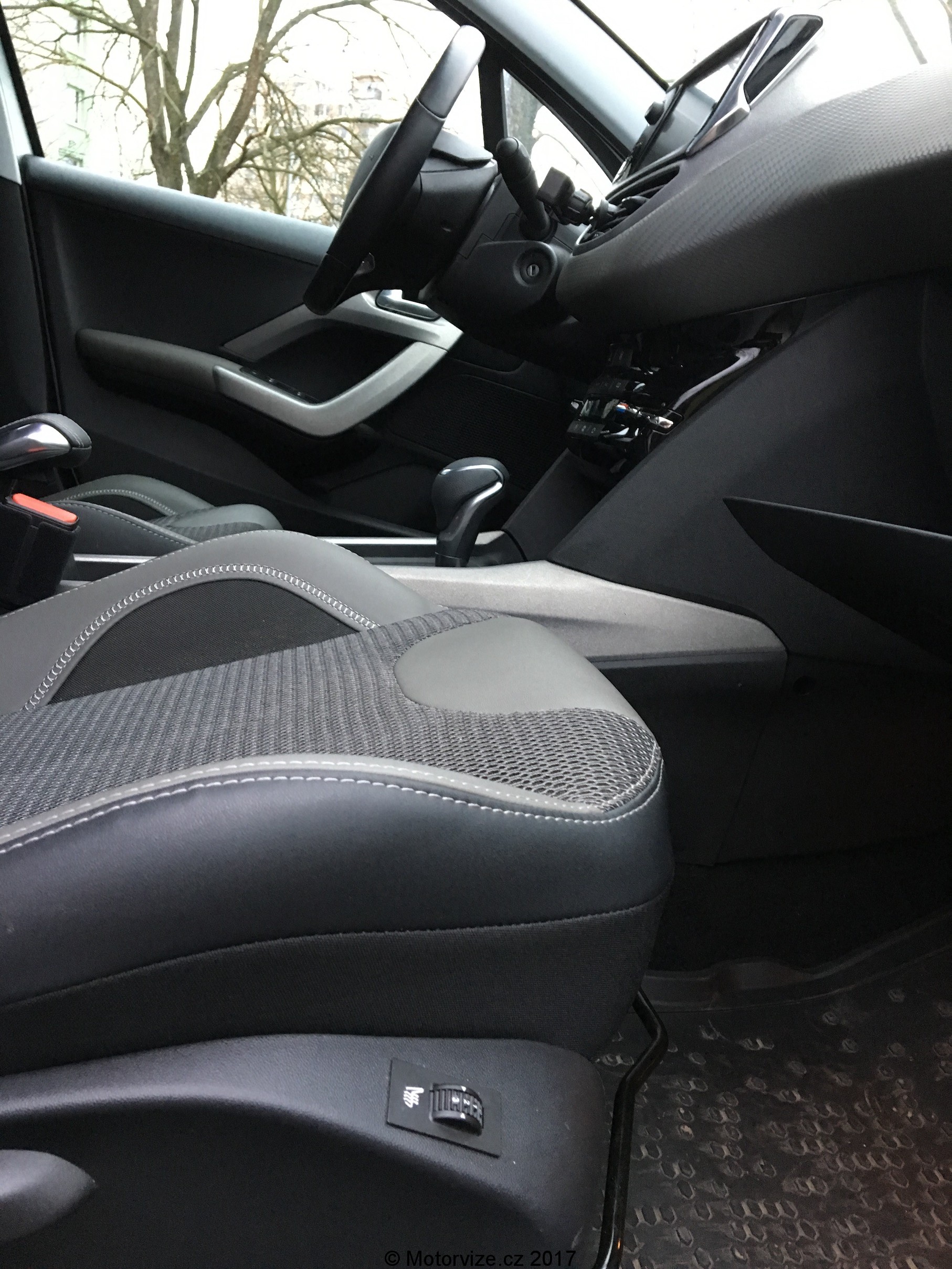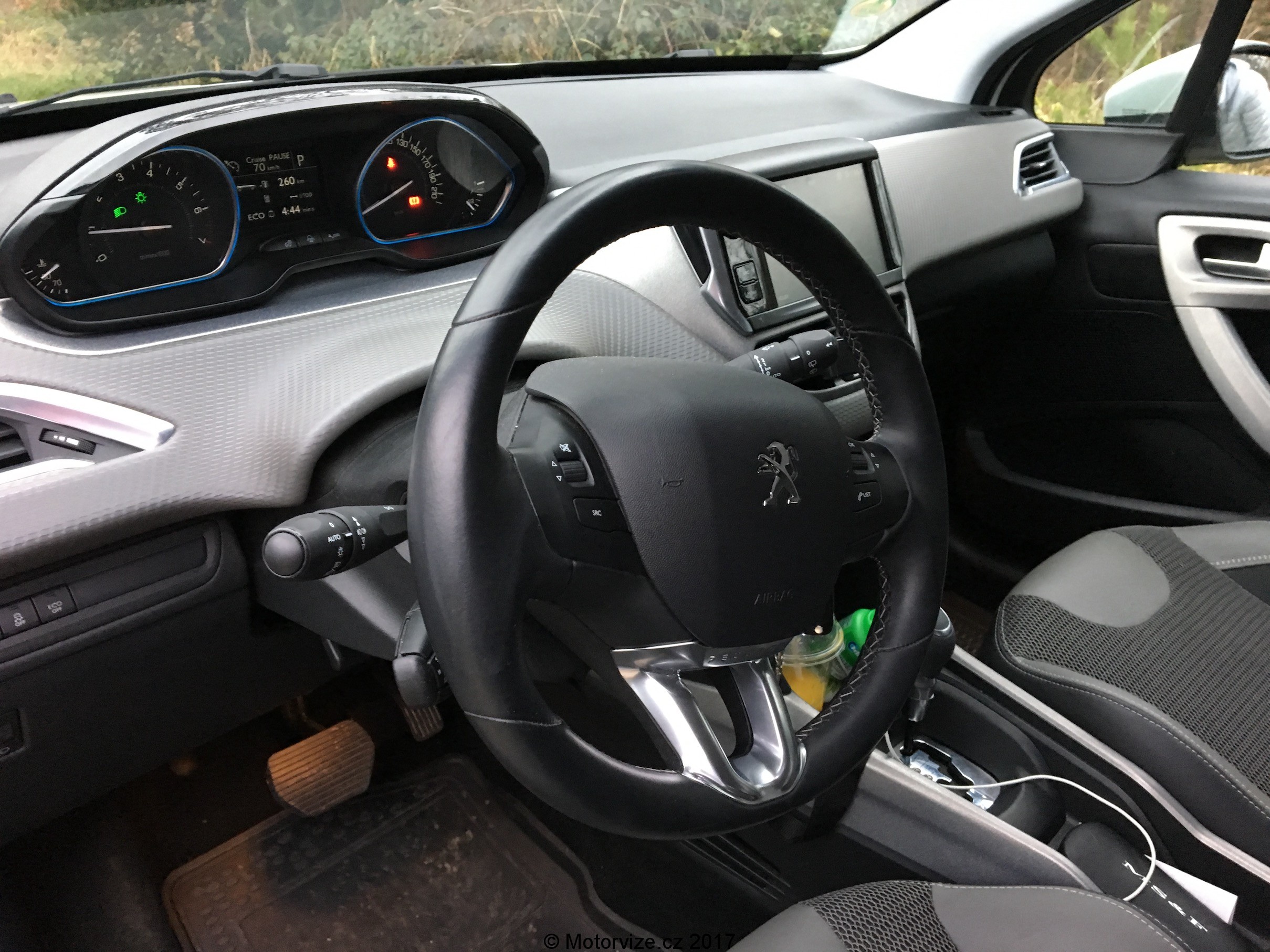 Při pohledu do interiéru není 2008 tak „ufo“ (míněno jako z vesmírné lodi), jako jsou jeho větší sourozenci 3008 a 5008, je spíše funkcionalistický a vládnou v něm levnější plasty. Nicméně na pohled vypadají velmi příjemně. Asi nejvýraznějším prvkem interiéru je oddělená kaplička přístrojů od volantu. Vypadá to pěkně, jen já jsem si při své výšce nenašel polohu volantu tak, aby mi bylo řízení pohodlné a zároveň jsem viděl vše potřebné. Nakonec jsem objevil kompromis, který mi jakž takž vyhovoval. Toto je ale obecně problém mnoha výrobců a modelů – počítá se s řidičem o maximální výšce 190 cm (já ji překračuji). Posaz za volantem je z principu kategorie vozu vyšší a i při mé velikosti jsem měl všude místa tak akorát. Ještě zpátky k volantu, ten je vcelku malý, ale s dostatečně masivním věncem a pouze pár ovládacími tlačítky. Drží se velmi pěkně a do malé 2008 se i hodí. Za volantem vlevo dole je masivní „páka“ na ovládání tempomatu. Zajímalo by mě, proč se Peugeot stále drží této koncepce, když na ramenech volantu je dostatek místa pro případná tři tlačítka k jeho ovládání.