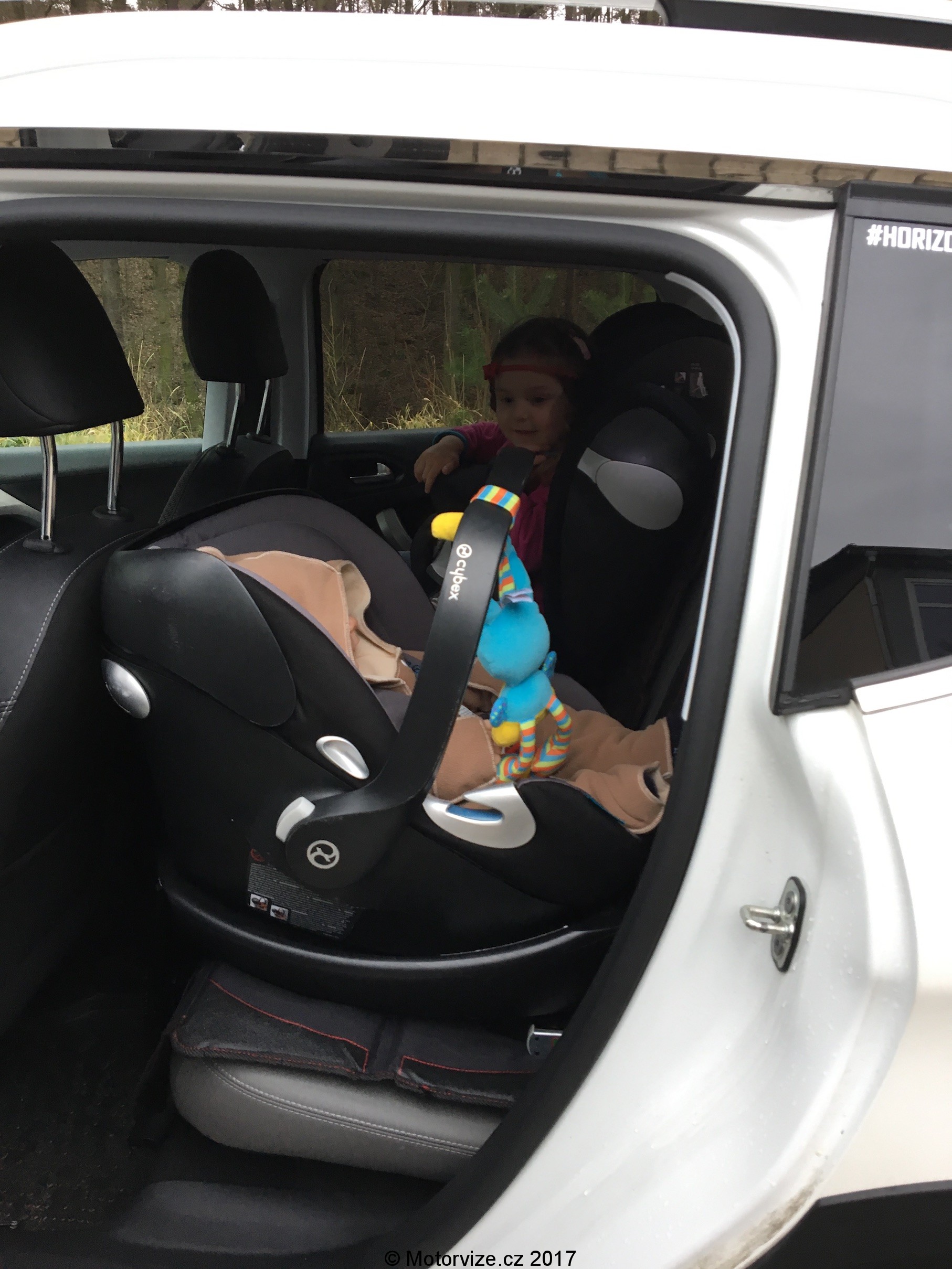 elikož mám děti ve věku půl roku a tři a půl roku, potřebuji v autě vozit dvě odlišné dětské sedačky. První je takzvané vajíčko pro děti do cca 1,5 roku a to včetně základny, která zapadá do úchytů isofix a dítě je usazeno proti směru jízdy. Druhá je již pro větší děti se stolečkem, také upevněnou do isofixu. Obě sedačky byly vybírány s ohledem na nejvyšší bezpečnost, protože trávíme s dětmi na cestách docela dost času, a tím pádem jsou rozměrově vcelku masivní. Samotná instalace sedaček u většiny rodin probíhá jednou za dobu životnosti auta nebo potřeby dané sedačky. I proto asi není úplně problém, že umístění vyžaduje trošku síly, protože vstupní otvor zadními dveřmi není vzhledem ke kategorii malého crossoveru úplně veliký (takže by pánové neměli nechávat tuto činnost na svoje drahé polovičky). Samotné připoutání dětí vyžaduje trošku akrobatický výkon hadího muže / ženy z důvodu již zmiňovaných menších zadních dveří. Usazení prcka je vlastně OK, jen se pak dostat k zapnutí bezpečnostního pásu. Pokud před juniorem ve velké sedačce, sedícím po směru jízdy, neusadíte čahouna, má i dostatek místa na nohy před sebou. Na druhé straně vložení vajíčka do předpřipravené základny je bezproblémové. Pro takovouto čtyřčlennou rodinu je v 2008 asi jediný částečně limitující prvek, a to prostor v kufru. Pro umístění složeného podvozku kočárku jsem musel kompletně vyjmout krycí plato kufru, které není kam ve voze schovat a postavit podvozek na výšku jako v malém hatchbacku. Na budku pro miminko jsem musel zapomenout úplně. Ale protože můžeme připevnit vajíčko přímo na podvozek kočáru, tak to není až takový problém. Budku s sebou nepotřebujeme vozit po městě úplně často a navíc, když miminko sedí, není budka potřeba vůbec, v tu chvíli vlastně žádný problém neexistuje. Takže děti usazeny, kufr plný a zavřený, takže hurá kupředu.