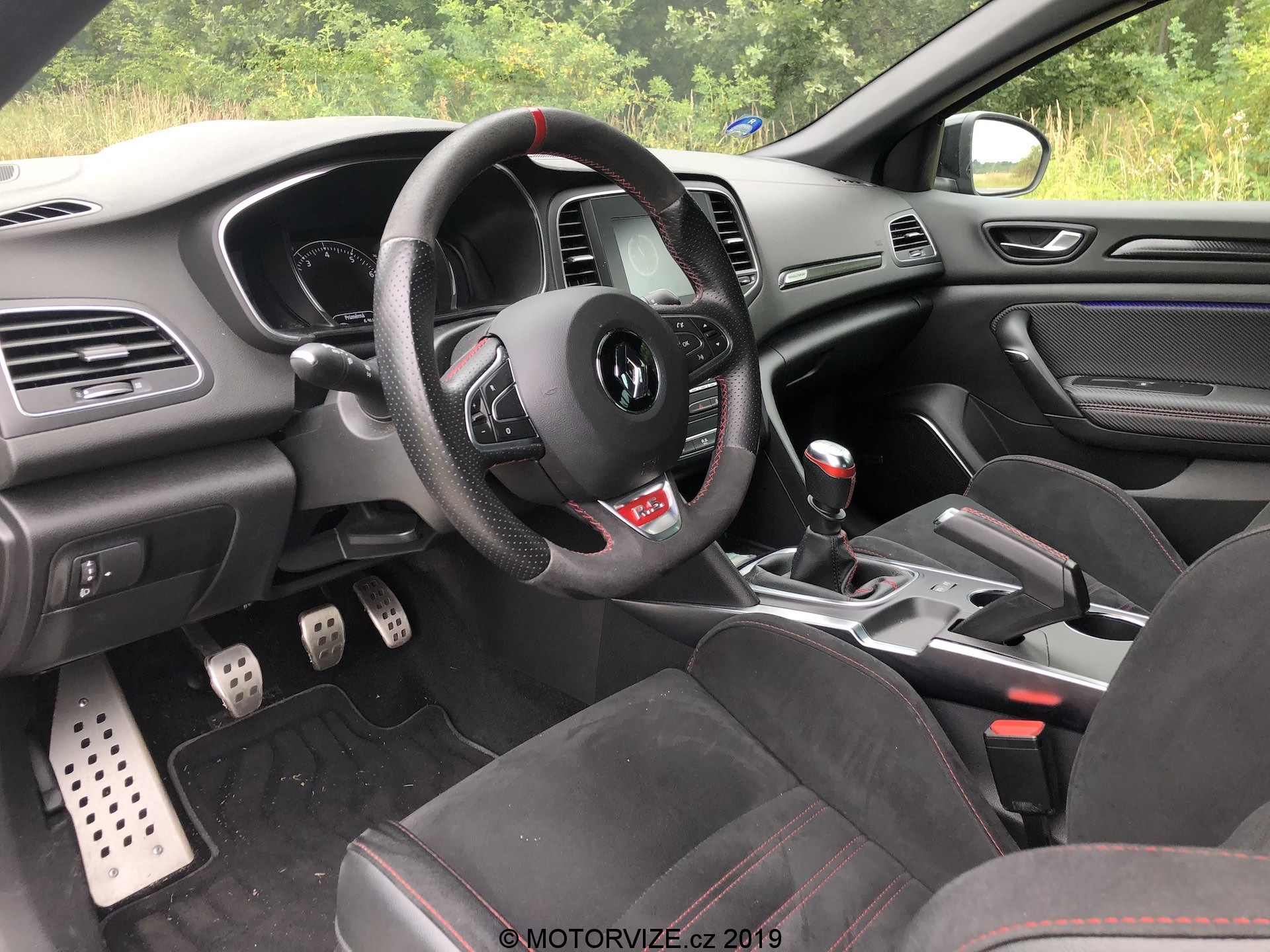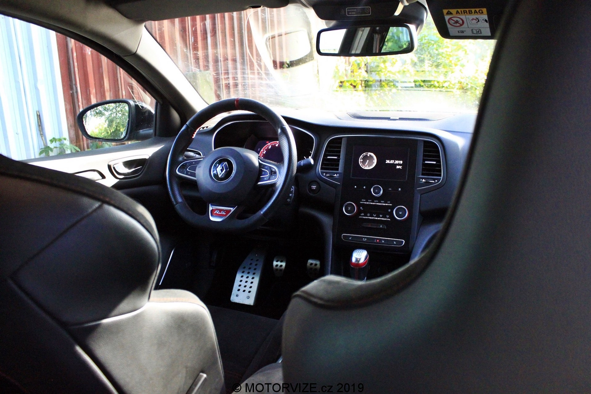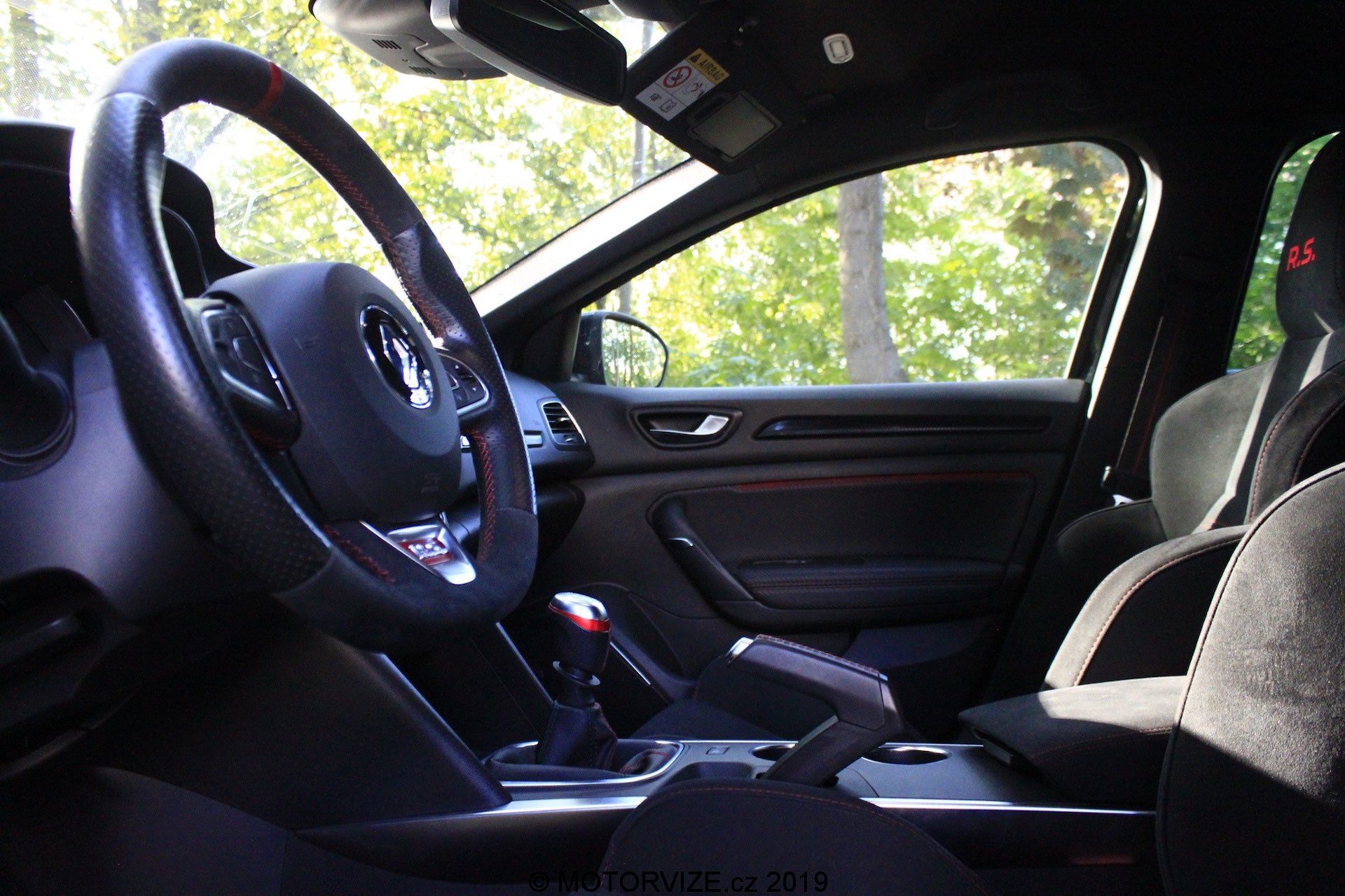 Při samotném pohledu do duše tohoto hothatche jsem byla utvrzena, že se jedná o sportovní vůz. Sedačky, jaké se zde nachází, jsou v gustu každého gurmána. Při posazení do těchto sportovně laděných křesílek s obřími bočnicemi si rázem přijdete jako Ken Block číslo dvě. I na sedačkách nám je jasně řečeno, že se jedná o R.S., a to právě tím správným emblémem. I když jsem do nich prvně zapadla jak voják do zákopu, pocit byl nepopsatelný a natěšenost z jízdy dvojnásobně větší. Celý tmavý interiér v Meganu byl v námi testované verzi obohacen příplatkovou alcantarou, která vyjde na 26 000 Kč. Kombinace černého exteriéru a interiéru byla v těchto tropických dnech trochu těžší, jelikož zde chyběla odvětrávané sedadla, které nejsou bohužel ani v nabídce. Ani tento malý nedostatek mi však nesnížil radost z tohoto černého ďábla. Ani multifunkční volant, který nacházíme uvnitř auta není obyčejný. Sportovní prvek v podobě červeného proužku přesně v horní polovině a stejnobarevné obšití dávají opět najevo sportovní život. K usnadnění manipulace s rádiem při jízdě máme k dispozici pod volantem ovládání hlasitosti a přepínání hudby a stanic. K hudbě nám zase slouží 8 reproduktorů značky Bose, díky kterým se cítíte jako na živém koncertě. Opět zde máme dotykový displej, který nabízí spoustu funkcí využitelných pro spokojenost každého z nás. Je zde i dotykové ovládání klimatizace, které vzhledem k velikosti tlačítek moc uspokojivé a ovladatelné není na místě, natož pak při jízdě a řízení. Jako bonus, který ocením a jistě nebudu jediná, jsou zatmavená zadní okna, jejichž přítomnost dodá soukromí celé posádce. Když už je řeč o posádce, nemůžeme si přeci myslet, že zde bude místo pro nespočet lidí. Pří řízení mou osobou se za řidiče vešel téměř kdokoliv, avšak řídil by někdo vyšší, jen stěží by se za řidiče nalodil dospělý chlap nebo někdo vyššího vzrůstu. V poslední řadě je zde jedna věc, která by trápila každého z nás. Tou „drobností“ je zámek vozidla. Při vypnutí motoru a provedení pár kroků se Megáne automaticky zamkne. Je velmi nepříjemné, když jedete například z nákupu, kdy v kufru máte věci, které chcete vyndat ven, ale než k němu stačíte dojít, auto se zamkne. U této příležitosti jsem zrovna slušným slovníkem nepřekypovala. Tato jediná problematika mi na autě opravdu vadila, ale jinak musím uznat naprostou všestrannost a osobitost auta. Po konzultaci s kolegy navíc musím uznat, že půjde dost možná na problém jen jediného kusu – u jiných aut s touto funkcionalitou jsme podobné nedostatky nezaznamenali. Hold prostě jednou myšlenka dobrá, provedení slabší.