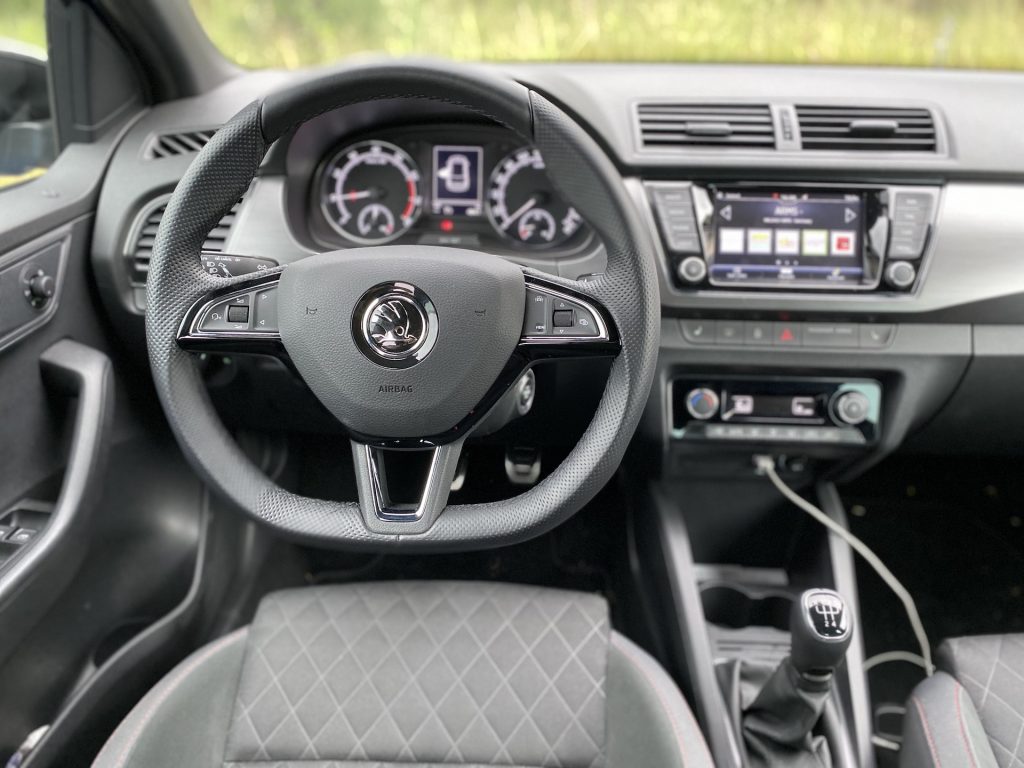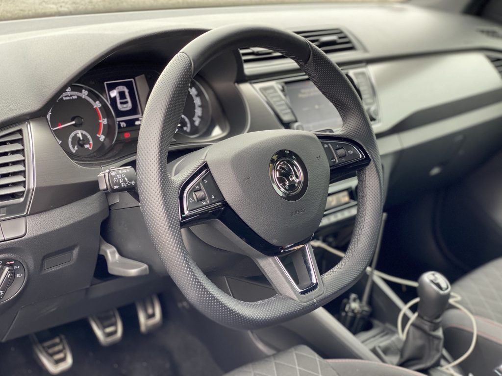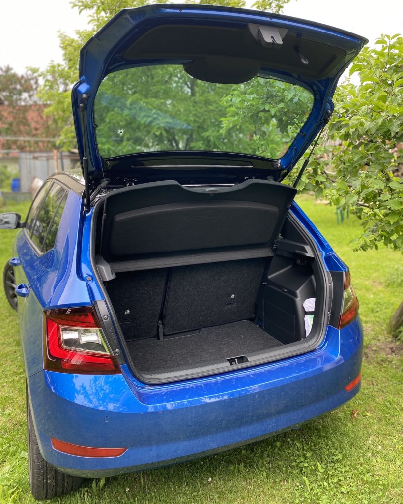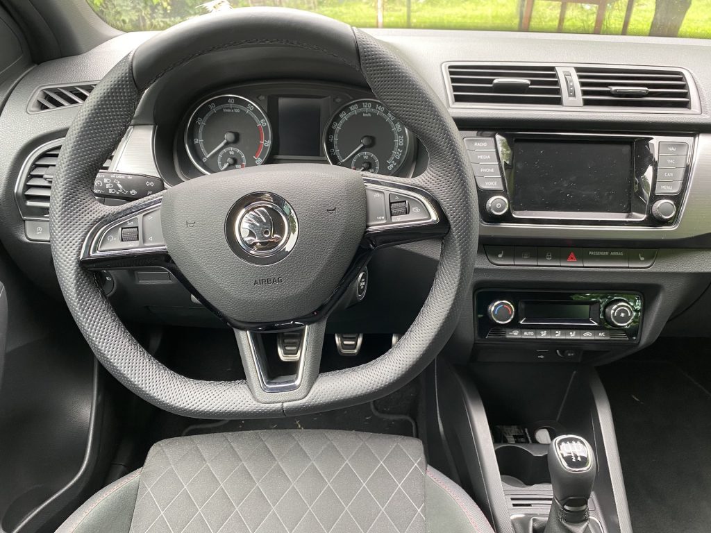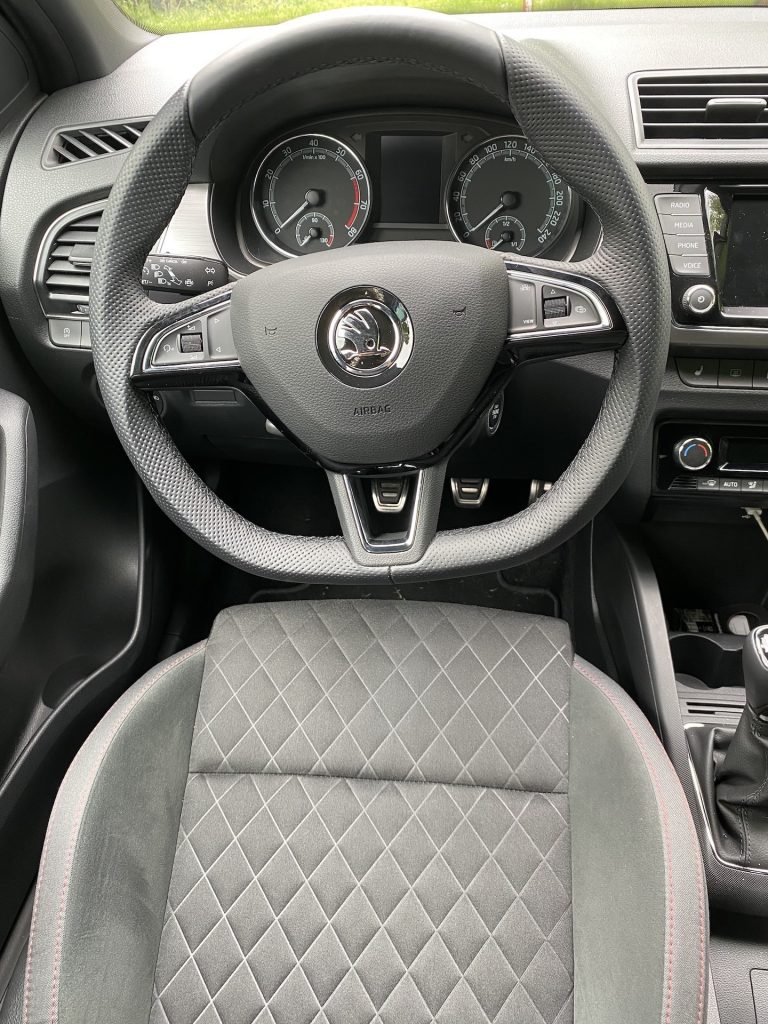 Co se týče interiéru, není zde nic, co by mohlo být na obtíž. Pro mne, jako menší osobu, byly možná trochu nepohodlné sedačky, a to díky vyšší výšce opory v oblasti nohou. Naopak každý spolujezdec, který měl možnost ve Fabii jet, si sedačky vychvaloval, tudíž prostě jen nejsem vlastníkem průměrné postavy, na níž byla Fabia konstruována, haha. V ostatních měříkách se sedadla prokázala nad očekávání slušnými vlastnostmi, ať se týče bočnic či materiálu. Sluší se poznamenat, že šlo o příplatkovou „sportovní“ variantu, v níž se kromě výraznějšího bočního vedení skrývá i integrovaná hlavová opěrka – skoro by jeden řekl, že jde o klasické škořepiny hodné závodním vozům. Pojem v jednoduchosti je krása se dá říci i o vnitřku, neb zde nic nepřekáží, ale ani nechybí. Jednoduchý, funkční a hlavně pohodlný je multifunkční volant, jenž se naučí ovládat každý během pár sekund. Nechybí kompatibilita Apple CarPlay, základní ovládání přes dotykový displej a sound systém, který na tak malé auto hraje až překvapivě dobře. V letních dnech je potřeba klimatizace, kterou zde samozřejmě najdeme – automatickou a hlavně díky mechanickým tlačítkům i příjemně ovladatelná. V poslední řadě je nutné zmínit prostornost, která se může jevit jako průměrná, avšak na poměry třídy je tomu ve skutečnosti spíše naopak. Do auta se vejde relativně bez problému čtyřčlenná posádka dospělých mužů. Namítat bychom mohli po přesunu k zavazadlovému prostoru. Ten není tvořen zrovna na cestování do Chorvatska, ale na víkend na chatě opět pro čtyři lidi hravě zvládne. Základní objem 315 litrů je ale spíše nadprůměrem, který se vyrovná i některým hatchbackům o třídu výše. Dnes už absolutní anomálií se zdá být verze kombi, která nabídne až těžko uvěřitelných 530 litrů základního objemu kufru.