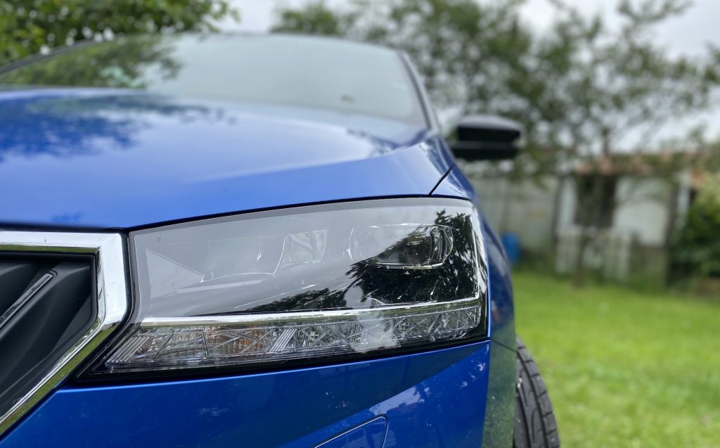 Škoda Fabia je auto, které každý moc dobře známe a nejednomu z nás dokonce stálo před barákem. Fabie je většinou jedním z prvních vozů čerstvě začínajících řidičů a bohužel i častým terčem útoku tuningářů. Utekla však dlouhá doba a tento model se z jedničkového vajíčka vyklubal do dospělé trojky. Nebude tedy žádným překvapením, když hned na první dobrou řeknu, že Fabie je klasikou v moderním kabátu, která nemůže urazit absolutně nikoho. Po chvíli obhlížení musím konstatovat, že v té jednoduchosti, kterou toto malé a praktické auto vykazuje, je vlastně i krása. V kombinaci s královskou modří, černou střechou a černými alu koly vypadá i v uvozovkách obyčejnější auto dravě. Líbivý vzhled podporují i FULL-LED světlomety, jenž současná Fabia dostala po modernizaci a na takto malém autě působí velmi luxusně. Dopodrobna popisovat exteriér vlastně vůbec nemusím, protože každý z nás ví, jak taková Fabie vypadá. Ráda však vytyčím pár detailů, které stojí za pohled a posouvají auto o level výš. Už třeba díky zmíněným předním světlometům celkově přední maska nabrala ráz sportovnějšího auta. Spolu s lízátkem, které je rozhodně prvkem velkým si dokáži představit černé orámování grilu místo stříbrného, které působí trochu obyčejněji. Avšak tento malý detail se ztrácí v sympatii relativně velkých černých litých kol podtrhujících dominanci již tak elegantního auta.