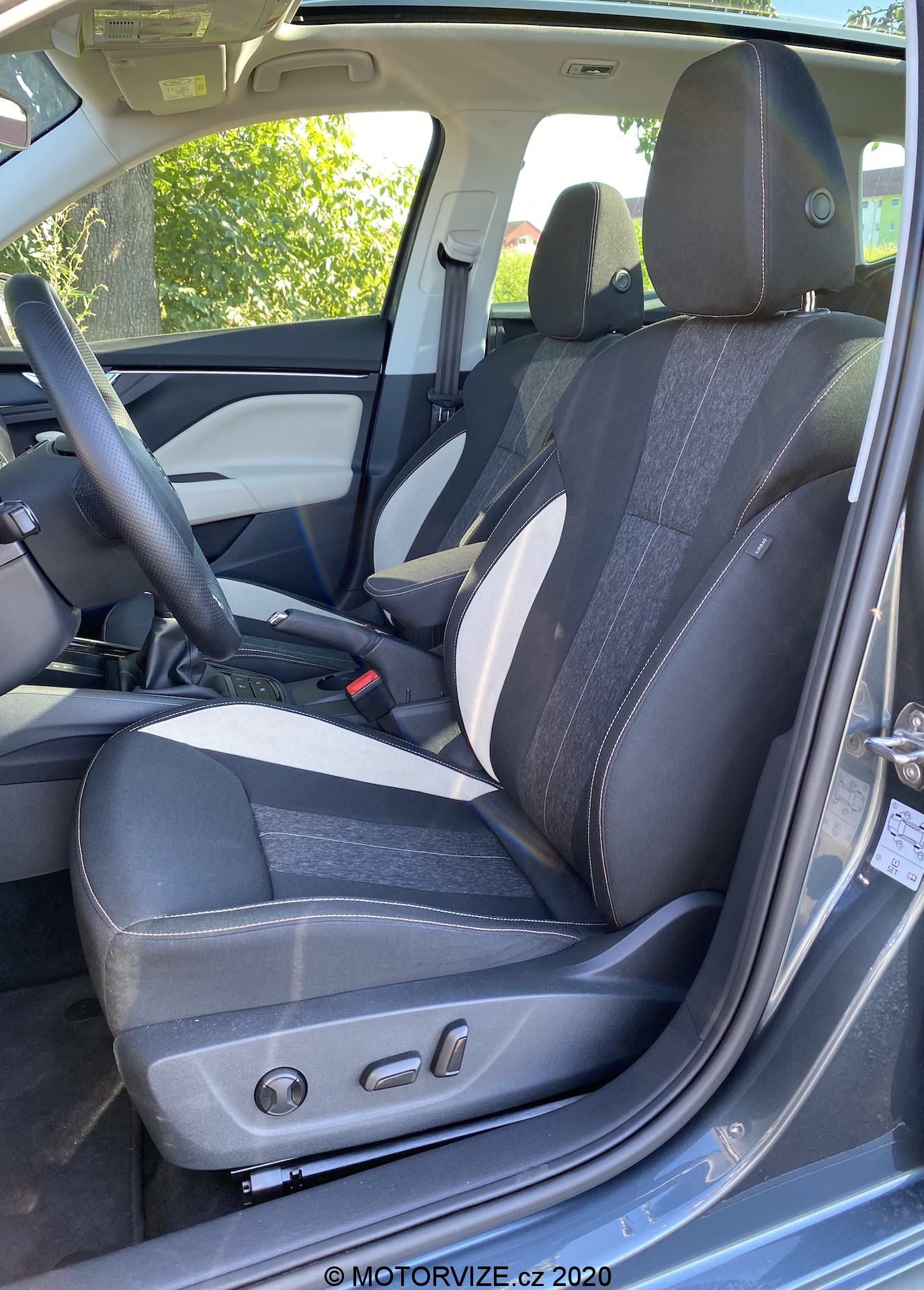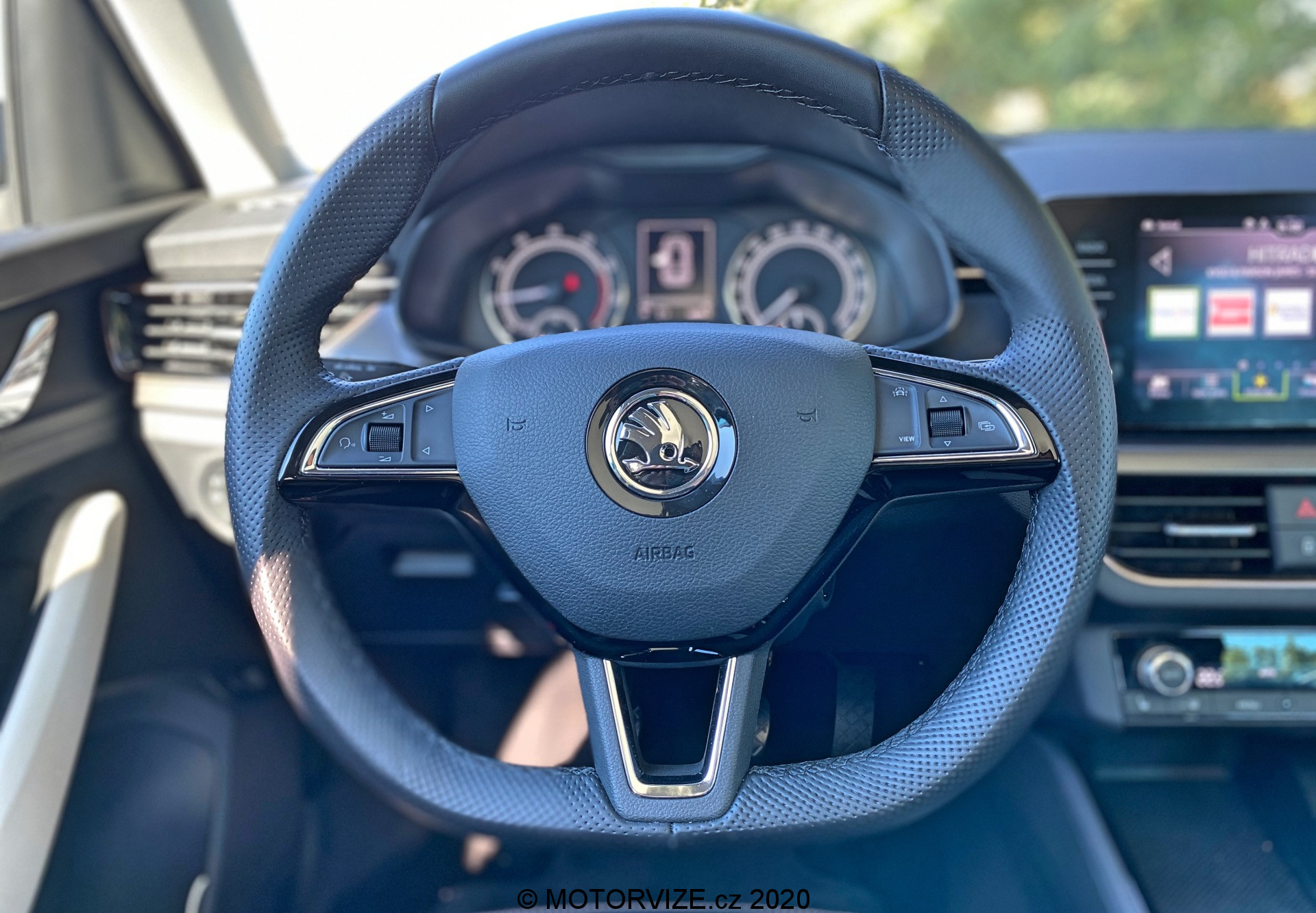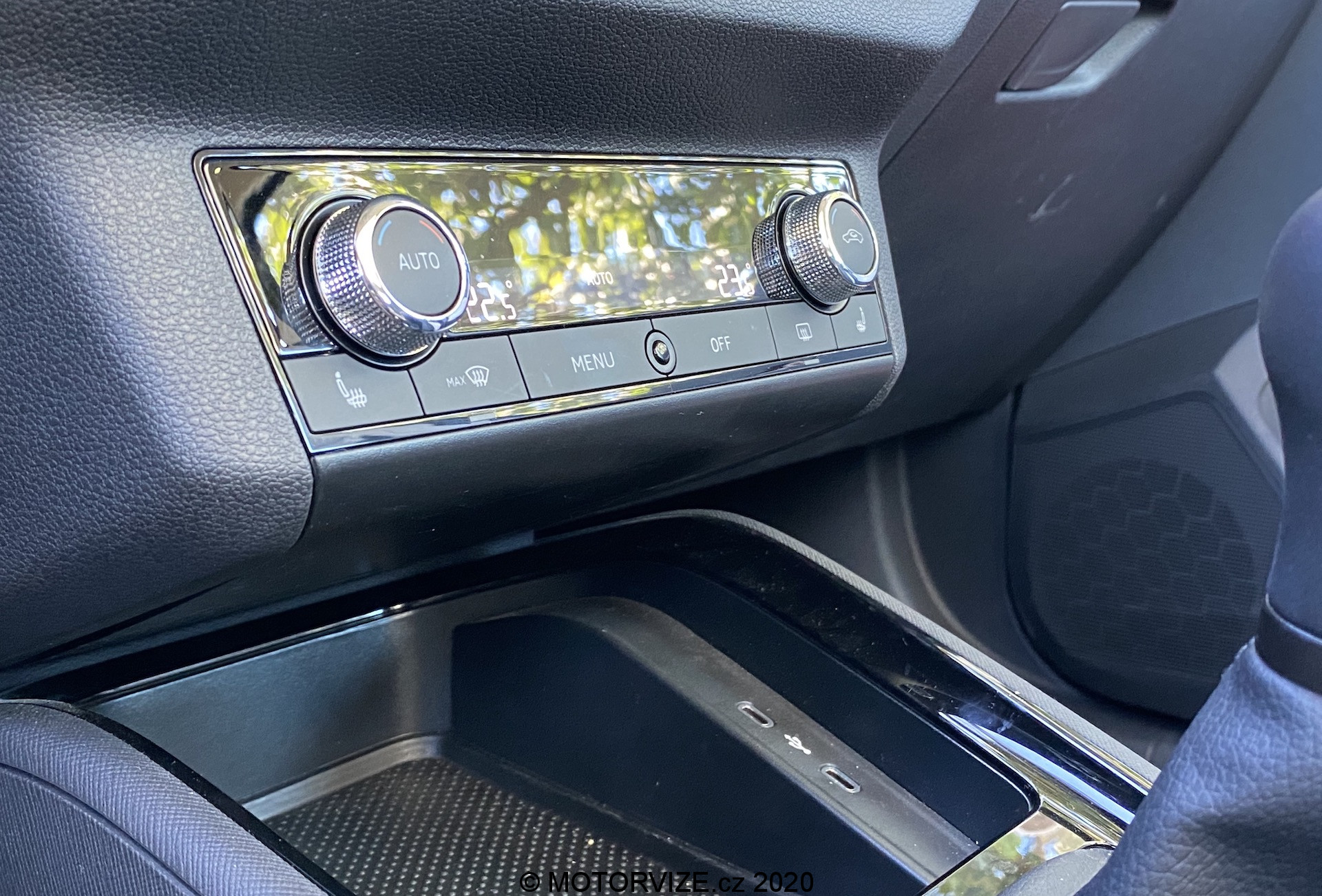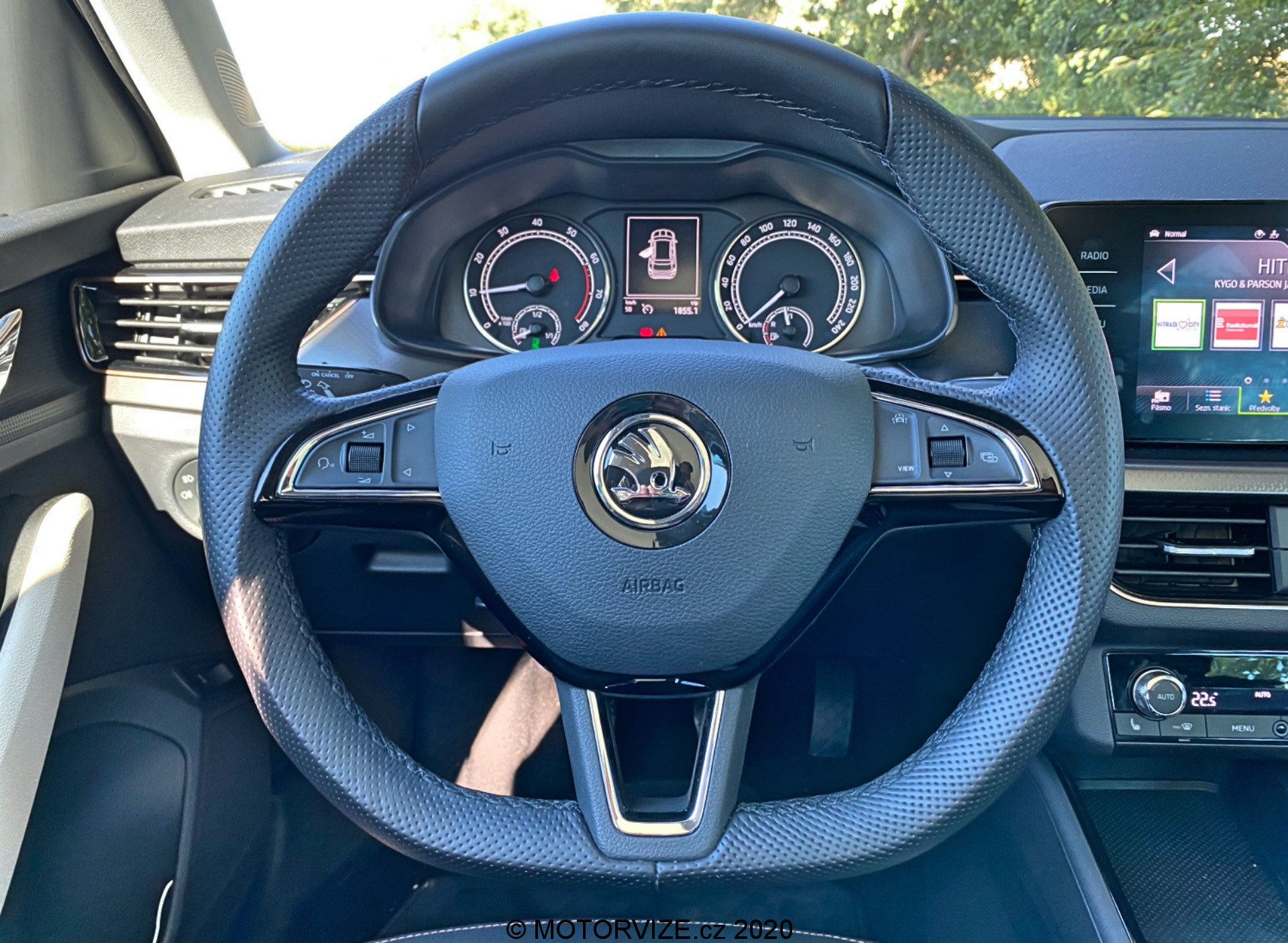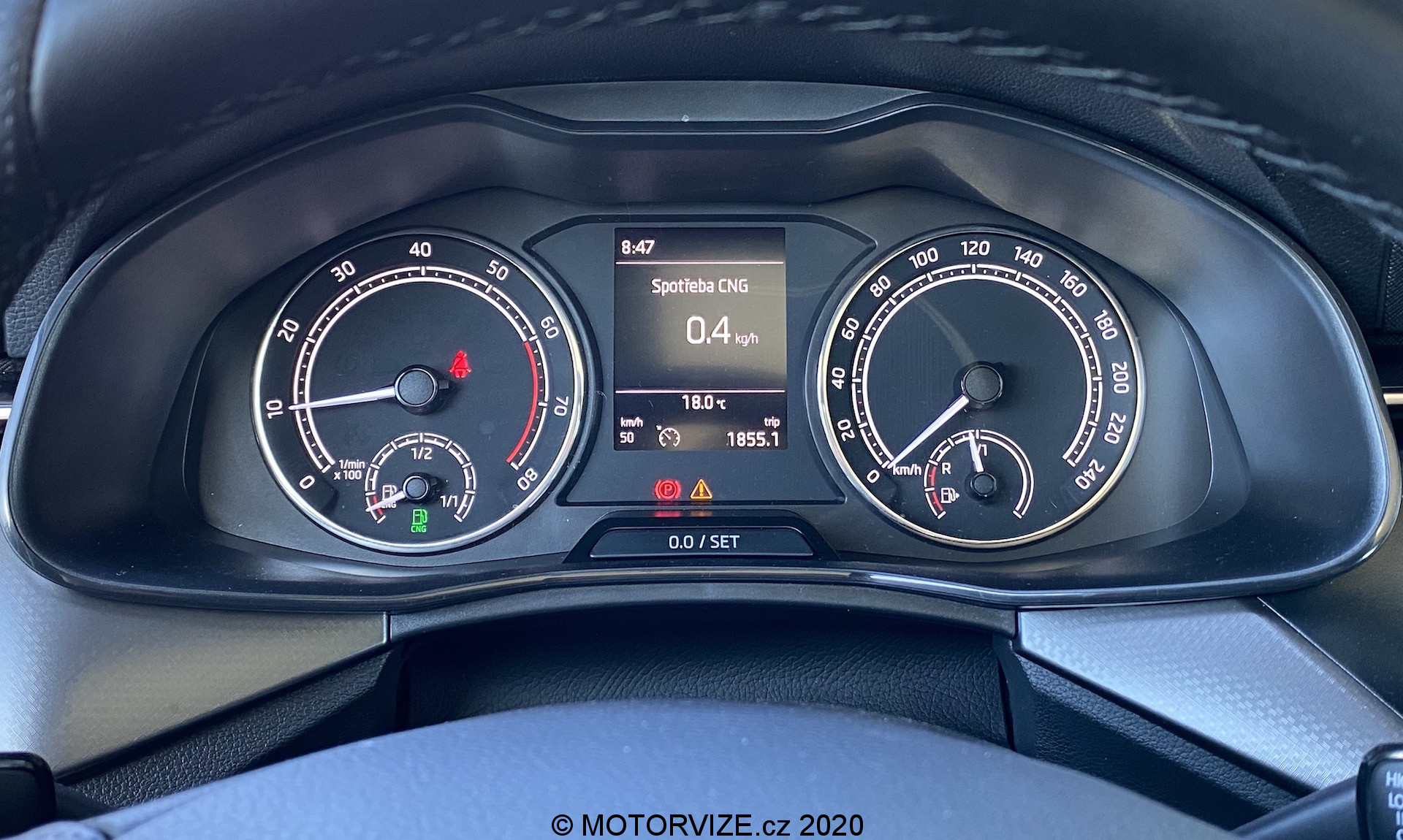 O vnitřním prostoru zástupců značky Škoda snad není potřeba se ani dlouze rozepisovat. Na druhou stranu, pokud si vzpomenu na mé dosavadní zkušenosti s novou Octavií, musím uznat, že už jde spíše o klišé. Jestli za základní a dlouhé roky standardní hodnoty škodováckých interiérů platí prostornost, funkčnost a jednoduchost, pak kromě prvního zmíněného došlo právě v případě Octavie čtvrté generace více či méně k odchýlení. Zpět ale k námi testovanému vozu, který tradiční zásady automobilky ještě stále ctí. Na své vnější rozměry je uvnitř pořád překvapivě prostorný. Co se velikosti týče, nejvíce mě překvapilo, kolik místa se nachází za mnou. Se svou spíše lehce podprůměrnou výškou (178 cm) se i po komfortním řidičském posazení za sebe v klidu posadím a umím si představit v druhé řadě i více hodin na cestě. Slabší by to samozřejmě bylo v případě plného obsazení 5 dospělými, to ale asi každý čeká. Zavazadlový prostor vyloženě přemírou objemu netrpí, i tak mu ale nelze příliš vytýkat, a to ačkoliv díky zástavbě plynové nádrže chybí prostor pod podlážkou nebo rezervní kolo. Zbytku interiéru vévodí mnou tolik opěvovaná přehlednost. Že jsem si kdysi stěžoval na absenci digitalizace a stárnoucí budíky přístrojového štítu, jejichž design se za poslední dekádu či dvě moc nezměnil, dnes si zpívám. V jednoduchosti je krása, a to platí právě tady bez diskuze. Monochromatický palubní počítač sice působí poměrně lacině, jeho ovládání prostřednictvím tlačítek na volantu je ale bezchybné. Vyhovuje mi i prostřední varianta audiosystému označovaná Bolero. 8“ dotykový displej dneska není vyloženě hitparádou, poměrně výrazný nevyužitý rámeček nelze považovat za zcela estetický a na absenci standardního USB 3.0 (pouze 2 konektorů USB-C) jsem si ještě nezvykl, za to ponechání dvou „standardních“ koleček na hlasitost a např. ladění rádia velmi hlasitě kvituji. Z moderních technologií pak potěší bezdrátová konektivita Apple CarPlay, která však v rychlosti a vybíjení baterie telefonu ještě není schopna plně nahradit zapojení přes USB. Konkrétně v našem kusu navíc chyběla bezdrátová nabíječka, což frustraci z absence standardního USB jen umocňovalo. Zcela jistě bych si za ni připlatil radši než třeba za luxusně vzhlížející, avšak reálně takřka nepoužitelnou panoramatickou (neotevíratelnou) střechu, jejíž velmi tenké zastínění nezajišťuje plnohodnotnou tepelnou izolaci. Ať ale povídání o interiéru nezakončuji negativně, pochválím ještě sedadla, která se ukázala jako příkladně komfortní. Navíc vypadají až překvapivě luxusně, a to i díky barevné kombinaci v provedení černá a světlá (béžová).