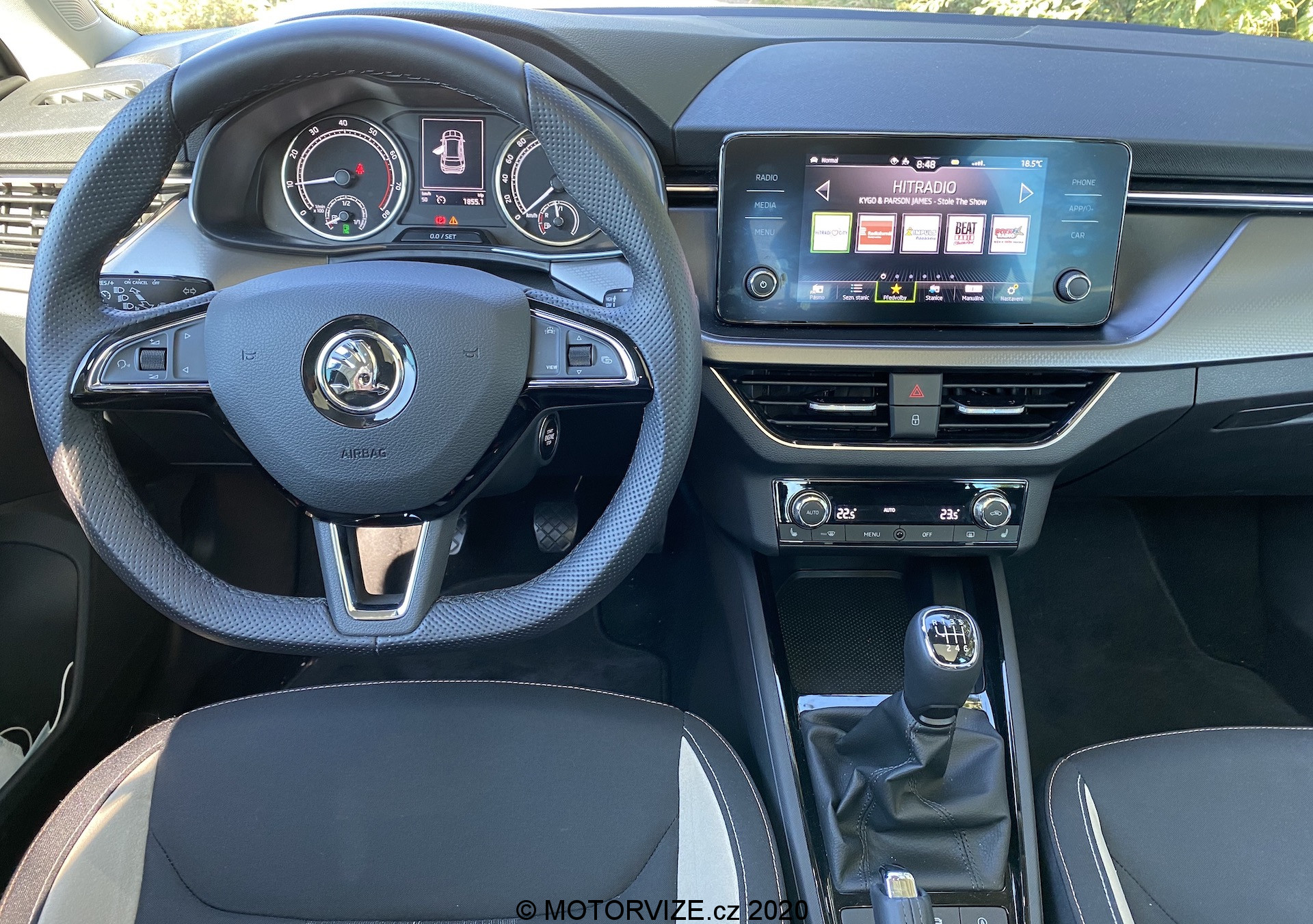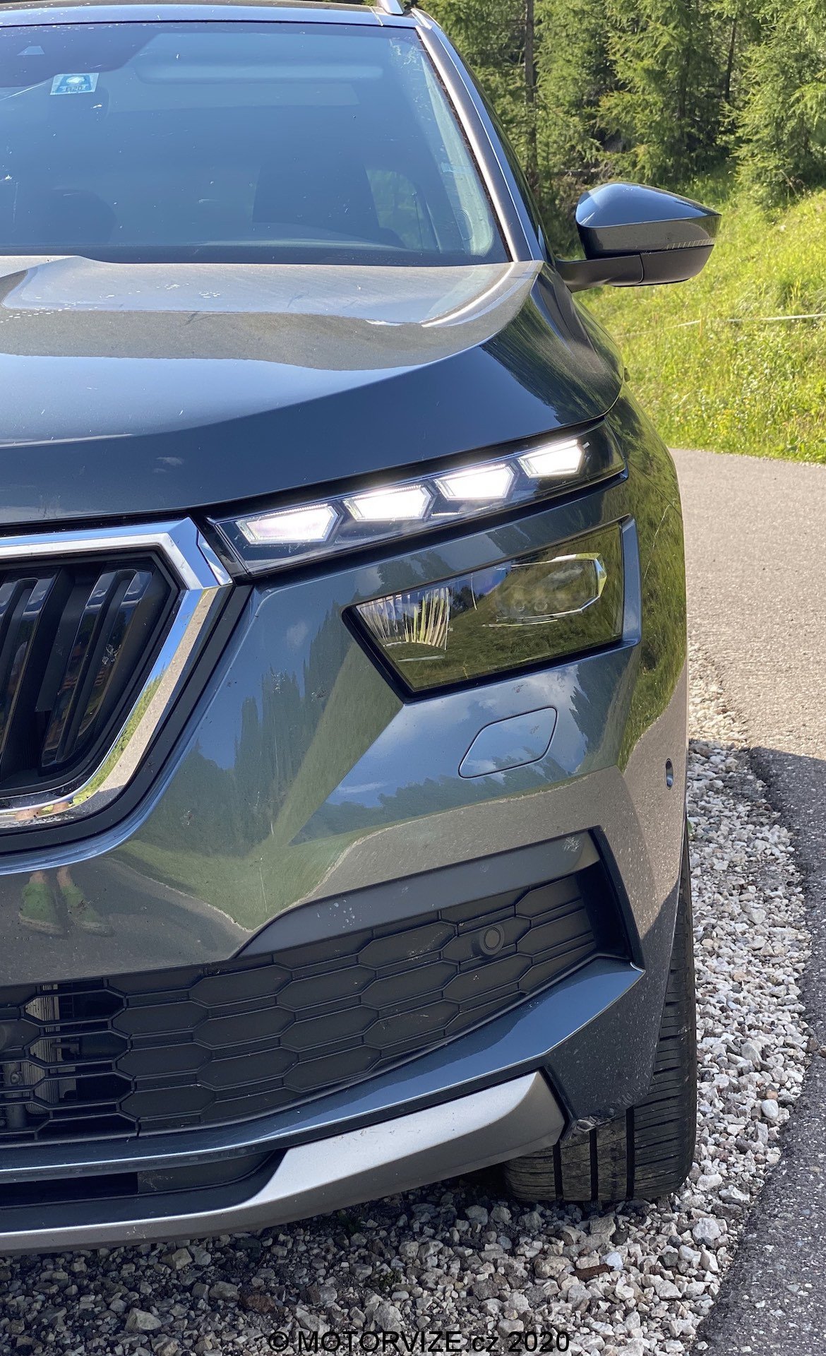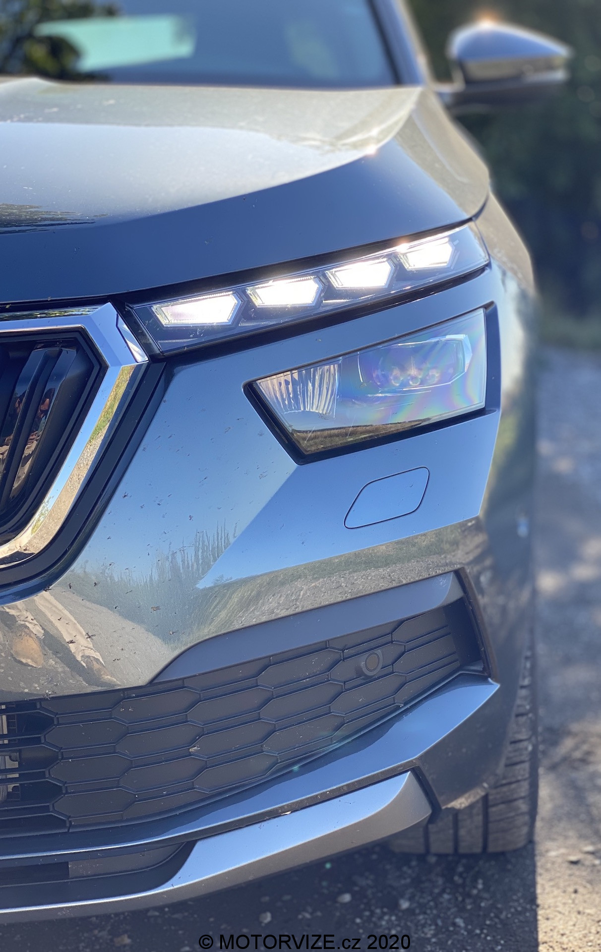 O třetí generaci Octavie, která dostala svou čtyřokou podobu po modernizaci v roce 2017, toho bylo (především v rámci negativních dojmů spojených právě s rozdělením předních světlometů) napsáno už hodně, a tak jsem si toto malé rýpnutí na úvod povídání o designu auta, které nabízí podobný prvek, prostě nemohl odpustit. Troufám si ale tvrdit, že tentokrát dané téma už není tak žhavé. Ať jsme si jen zvykli nebo se oddělené světlomety designérům z Boleslavi povedli tentokrát o dost lépe, na triko čtyřokého designu si jen tak někdo nestěžuje. A ostatně bylo už i o vzhledu nejmenšího českého SUV napsáno hodně. My konkrétně jsme dostali k dispozici provedení Style s šedou metalízou, a tak by se na první pohled mohlo zdát, že jde o nějakou šedou myš. Troufám si ale tvrdit, že to minimálně tomuto kusu vůbec neškodí. I díky kombinaci s líbivým ač poměrně výstředním designem kol v převážně černém lakování (s exkluzivním detailem v podobě hliníkových „čepiček“ ventilků s logem Škoda) náš Kamiq nevypadá vůbec špatně a rozhodně ne lacině. Celkový dojem dotváří i LED technologie osazená všude, kam se podíváš. Kamiq je mimochodem zcela prvním vozem značky (a prozatím i jediným), který nabízí dynamické (tekoucí) blinkry vpředu i vzadu. Dost možná i díky povedené kombinaci denního svícení řešeným bodovými LED diodami právě se signalizací odbočování nepůsobí „čtyřočko“ vůbec špatně. Zadní část je pak o něco uhlazenější. Celkově ale, pokud Kamiq máme definovat jako zástupce segmentu B-SUV, snad mohu lehce namítat, že spíše než plnohodnotný crossover působí jako nafouklá a jen lehce zvýšená Scala nebo první dojmem velikostně snad i jako větší Fabia. To ale není nic vyloženě výjimečného, právě tento segment poslední dobou hodně roste, a to po stránce prodejů i co se počtu zástupců týče. Stačí si připomenout třeba veleúspěšného ASX, Dusteru, Kony, Arony, S-Cross, 2008 a řady dalších. Všechna tato auta jsou spíše jen vyvýšenými deriváty zástupců nižších segmentů, jejichž hlavní devízou je vyšší posez a s ním spojený pocit bezpečí nebo dobrý rozhled.