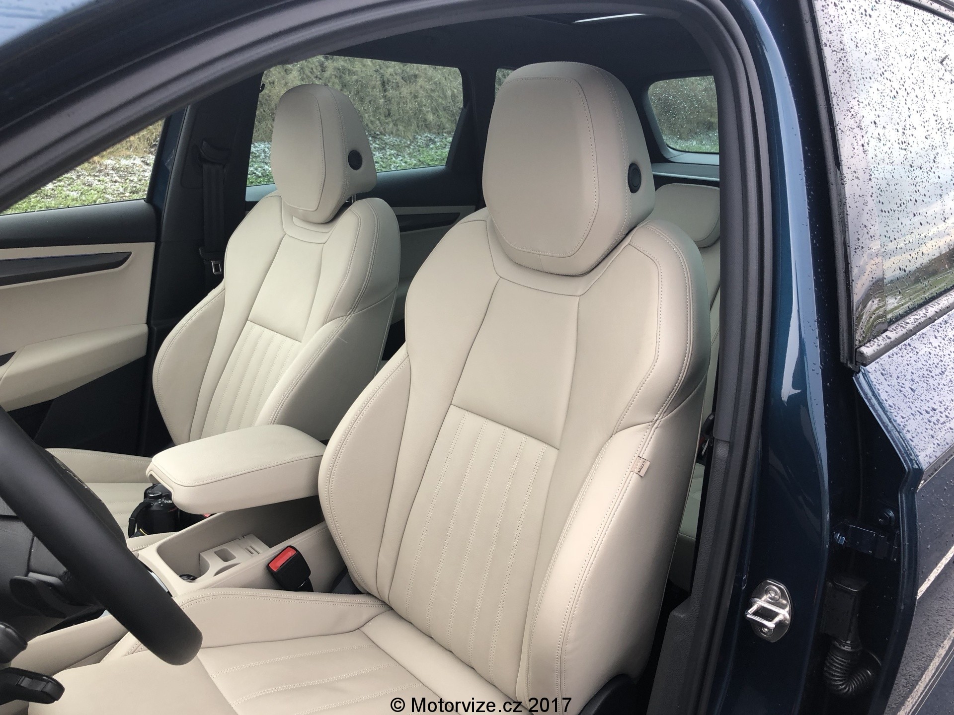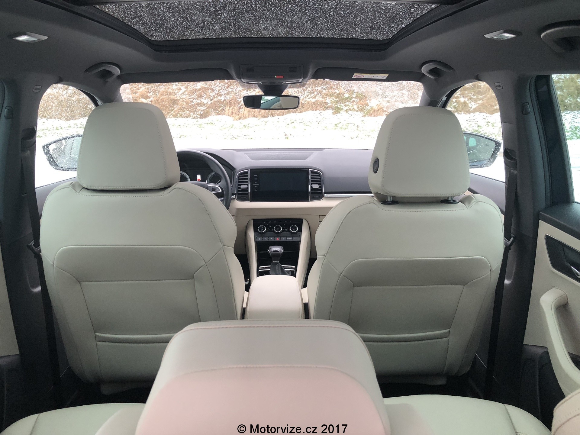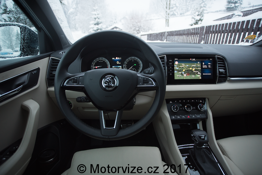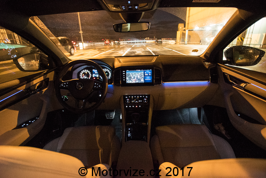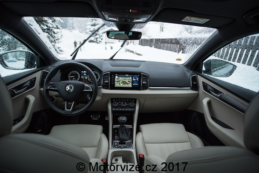 Dojem z interiéru je na první pohled velmi dobrý. Béžová barva spolu s hliníkovou dekorací na dveřích a lesklým plastem na středové konzoli působí prémiově, tento dojem umocňuje i na tuto třídu obrovský 9.2” palcový displej. Co však interiér kazí, jsou klasické budíky značky Škoda, které se k zbytku vozu příliš nehodí. K vozu však nyní už lze přiobjednat digitální přístrojový panel za celkem rozumných 8900Kč, který bude k interiéru ladit už více. Velmi dobrý je i příplatkový systém Columbus, který dostanete právě se zmiňovaným velkým displejem.