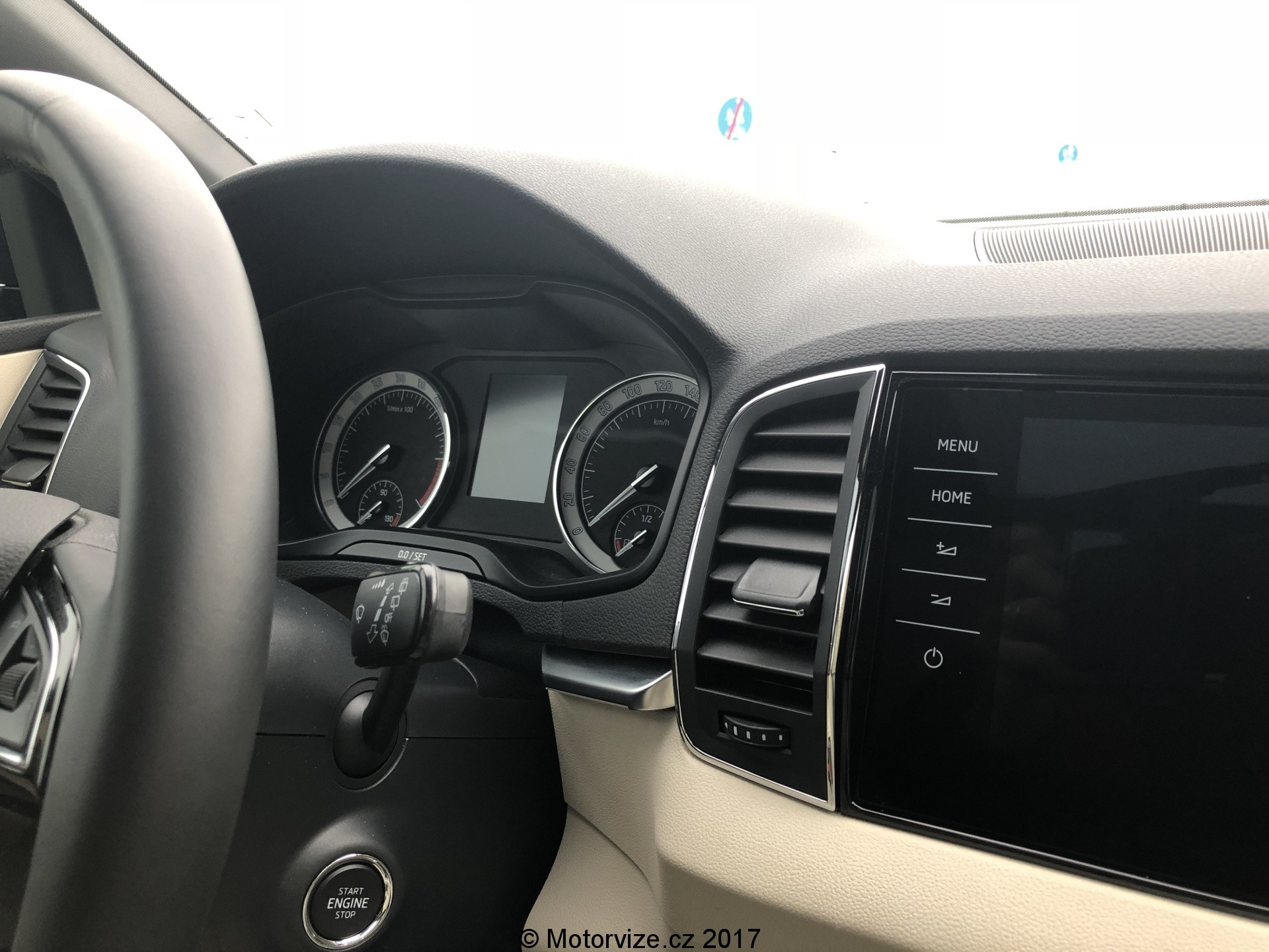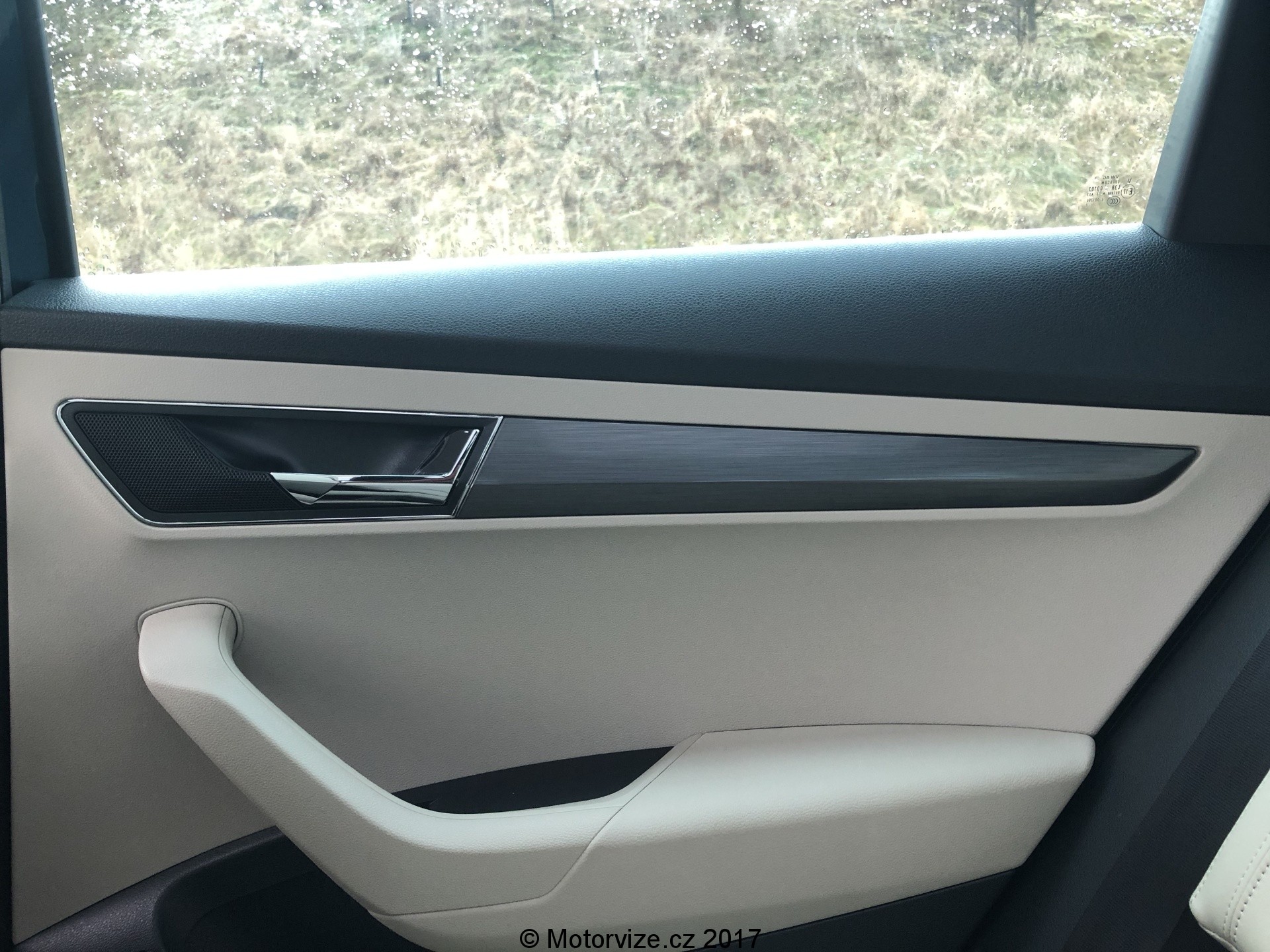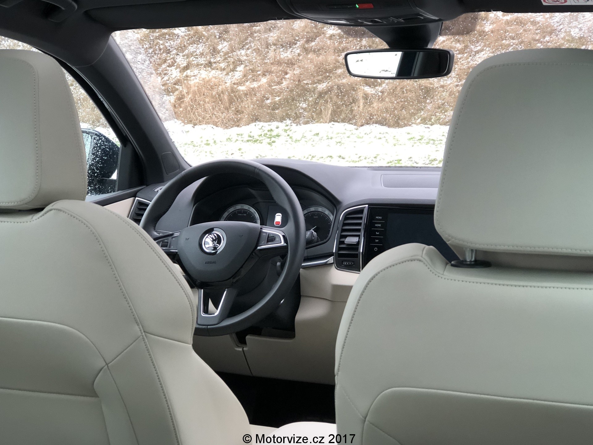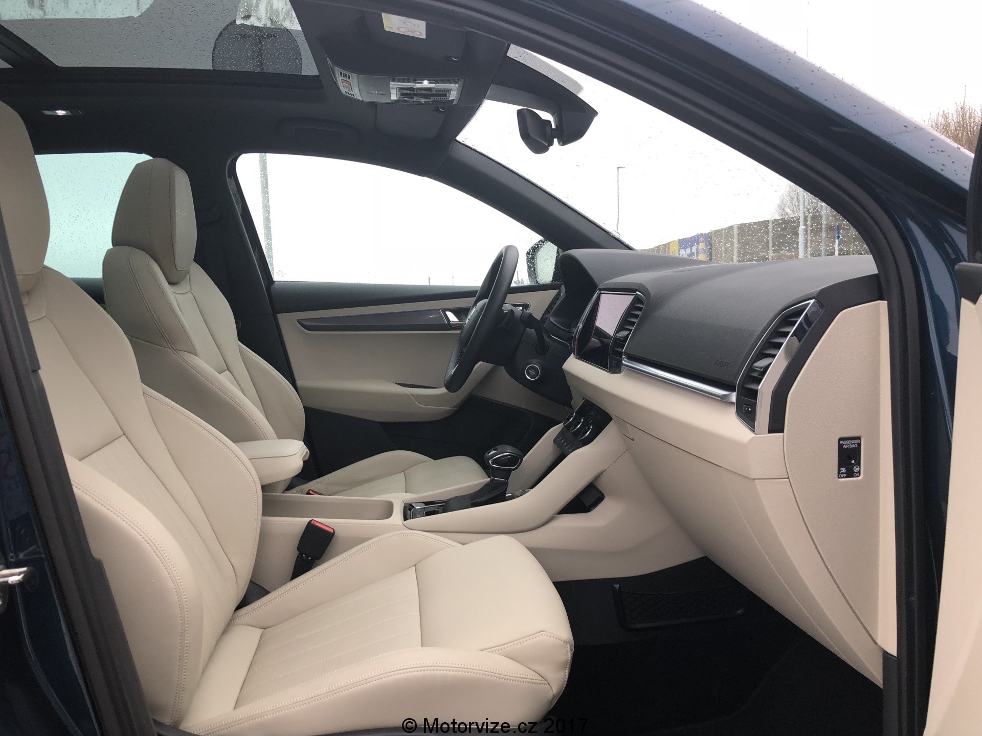 Dojem z interiéru je na první pohled velmi dobrý. Béžová barva spolu s hliníkovou dekorací na dveřích a lesklým plastem na středové konzoli působí prémiově, tento dojem umocňuje i na tuto třídu obrovský 9.2” palcový displej. Co však interiér kazí, jsou klasické budíky značky Škoda, které se k zbytku vozu příliš nehodí. K vozu však nyní už lze přiobjednat digitální přístrojový panel za celkem rozumných 8900Kč, který bude k interiéru ladit už více. Velmi dobrý je i příplatkový systém Columbus, který dostanete právě se zmiňovaným velkým displejem.