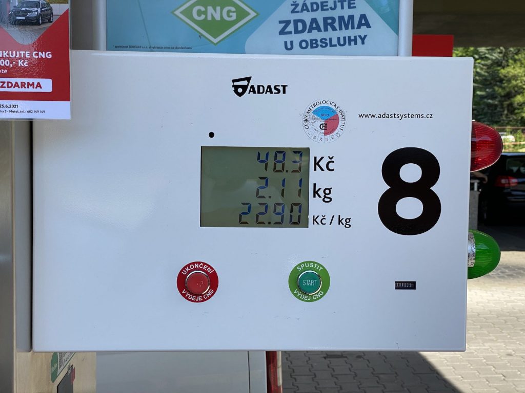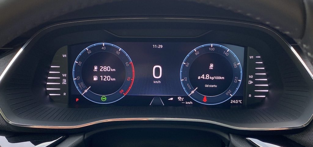 A teď tedy k těm reálným hodnotám. Průměr za celý týden se mi podařilo udržet do 4,2 kg na 100 km, což odpovídá cca 0,96 Kč na 1 km v ceně paliva, a to považuji za skvělý výsledek s ohledem na to, že jsem s Octávkou jezdil prostě normálně – žádné loudání, standartní rychlost přesunu a žádné omezování. Maximální spotřebu na delší cestě jsem zaznamenal těsně pod 6 kg na 1 km a to byl dálniční daleko nad v Česku maximální povolenou rychlostí. To nám pořád dává náklady na 1 km okolo 1,30 Kč. Tohle jsou hodnoty, na které nedosáhne ani na dlouhé cesty tolik milovaný diesel. S elektromobilem to bude také těžké dosáhnout, a to především s ohledem na cestovní rychlost, dobu tankování a případnou nutnost využití veřejné nabíjecí sítě v souvislosti s delším nájezdem. V obou případech jsem se celý týden opravdu nemusel omezovat nebo nadměrně zabývat dojezdem. Tímto směrem mi přijde CNG jako opravdu zajímavá alternativa. Provoz auta není mě nijak neomezuje. Nemusím zásadně přizpůsobovat svoje běžné chování danému vozu, nemusím si lámat hlavu s dojezdem a chování Octavie G-TEC je zkrátka standartní. Dynamika je odpovídající, i když pár koníků navíc pro předjetí na okresce by to sneslo, nevnímejte to ale prosím jako kritiku. Jak už jsem naznačoval výše, rozhodně je 130 plynových koníků o dost příjemnějších než těch 110 v jednolitru, který prostě a jednoduše moc nejede. Na 150 koní plnohodnotné benzínové verze to sice není, ale opět musím připomenout, že se nacházíme hluboko pod jejími provozními náklady (na palivo). Škoda jen, že pocitově Octavia G-TEC jede o něco lépe právě na benzín. Největšího rozdílu vnímám v nižších otáčkách, kde při provozu na CNG Octavia jako by se trochu zadýchávala. Při přepnutí na benzín jsme ale spotřebou daleko za CNG, a tak i já velmi rychle hledám nejbližší čerpačku CNG, kterých mimochodem v Čechách není vůbec málo a jdu dále šetřit svou peněženku. Pro řidiče zaměřené na náklady a ekologii je výkon G-TECu jednoduše odpovídající a rodinný jízdní styl asi dokáže ještě více uspořit.