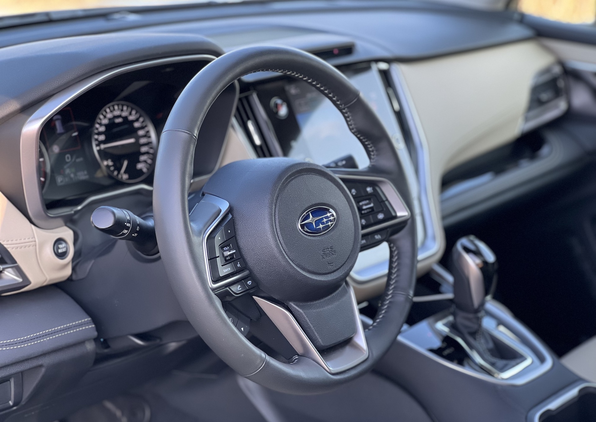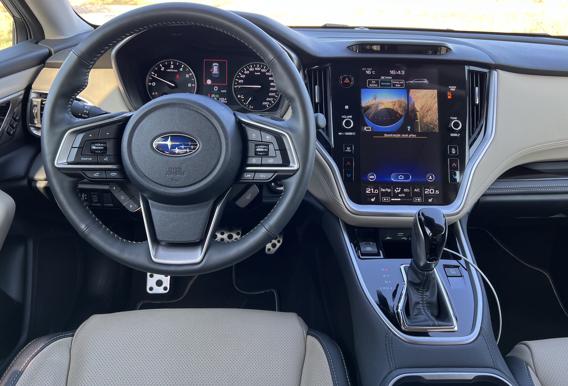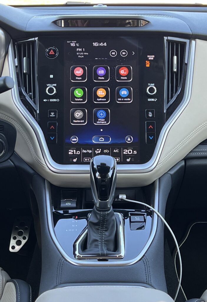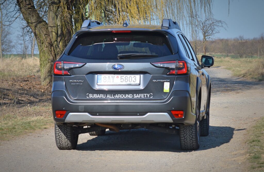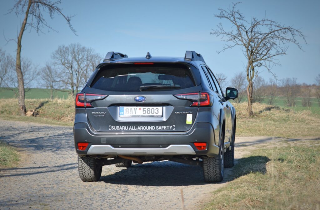 Ihned po nasednutí do Outbacku mě mile překvapily použité materiály. Kam jenom oko dohlédne, tam vidím dvoubarevné čalounění, které potěší oko i další smysly. Prostoru na předních „křeslech“ je také dost. Ono s tím místem v Outbacku není problém naprosto v žádném směru. Vpředu i na zadních sedadlech je ho dostatek. Outback je ostatně docela velkým autem. Co potěší i naše „chalupáře“, bude zavazadlový prostor, který nabídne minimálně 560 l a po sklopení zadních sedaček je z něj skoro malá dodávka. Tak to ale bylo u tohoto vozu v podstatě v každé generaci. Ta současná se chlubí především novým infotaimentem, umístěným uprostřed palubní desky na výšku. V jiných vozech už se s takovým řešením setkáváme delší dobu a Subaru si až do představení nového Outbacku drželo takovou kombinaci několika ovládacích panelů s dotykovým displejem, která je dnes minulostí. Vše je seřazeno do jednoho přehledného a intuitivního celku. Osobně bych ještě přivítal trochu estetičtější zpracování funkčních tlačítek a stejně tak nejsem zrovna příznivcem lesklých černých povrchů, ale na funkci tyto atributy samozřejmě nemají vliv. A jak to tedy funguje? Upřímně velmi dobře. Jednotlivé ikony systému jsou dostatečně velké. Zobrazení i odezva příkladná a na takovou komplexní skoro „prvotinu“ je to velmi dobře odvedená práce, díky které působí kabina Subaru Outback současně. To je možná trochu v kontrastu s kapličkou přístrojů, která se drží „tradice“ a zůstává analogová. To je pro mě mezi novými vozy vždy trochu překvapení, protože se nám tu napříč trhem rozmohl takový nešvar – dostat displej, kam to jen trochu jde, a to už i vozů nižších tříd. Ale překvapení to bývá ve skrze pozitivní. Na dobře provedené kombinaci analogových budíků s klasickým palubním počítačem vprostřed toho není moc co vytknout. Čitelnost ukazatelů je v každé chvíli vynikající. Člověk si rychle „zvykne“ na jednotlivé ukazatele a dokáže se orientovat letmým pohledem. Máme tu tedy kombinaci klasiky a moderny, kterou si dnešní doba žádá. Subaru se tahle varianta podařila a věřím, že jeho zákazníci budou s takovým řešením spokojeni. Testovaný vůz je zároveň velmi bohatě vybaven – prakticky vším, co dnes můžeme ve vozech najít – adaptivní tempomat, udržování v jízdním pruhu, vícezónovou klimatizaci, vyhřívaná sedadla a tak dále. Zajímavostí ale je i nový systém EyeSight, který v současné generaci získal ještě lepší „oči“ a naladění. Díky tomu zabírá širší zorný úhel, je přesnější a uživatelsky příjemnější. I já jsem mělmožnost ho párkrát vyzkoušet proti překážce v kontrolovaných podmínkách a městské rychlosti. A věřte tomu, nebo ne, ale vždy překážku vyhodnotil a zastavil před možnou srážkou. Stejně tak spolehlivě si Outback ohlídá i svou zadní část a v případě hrozící srážky vůz zastaví. Tohle se Subaru vážně povedlo a v současném stále hustším provoze vám může ušetřit nepříjemné starosti z městské džungle.