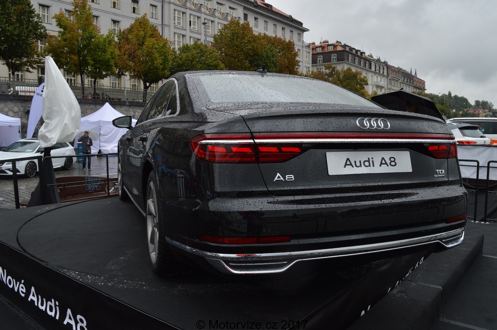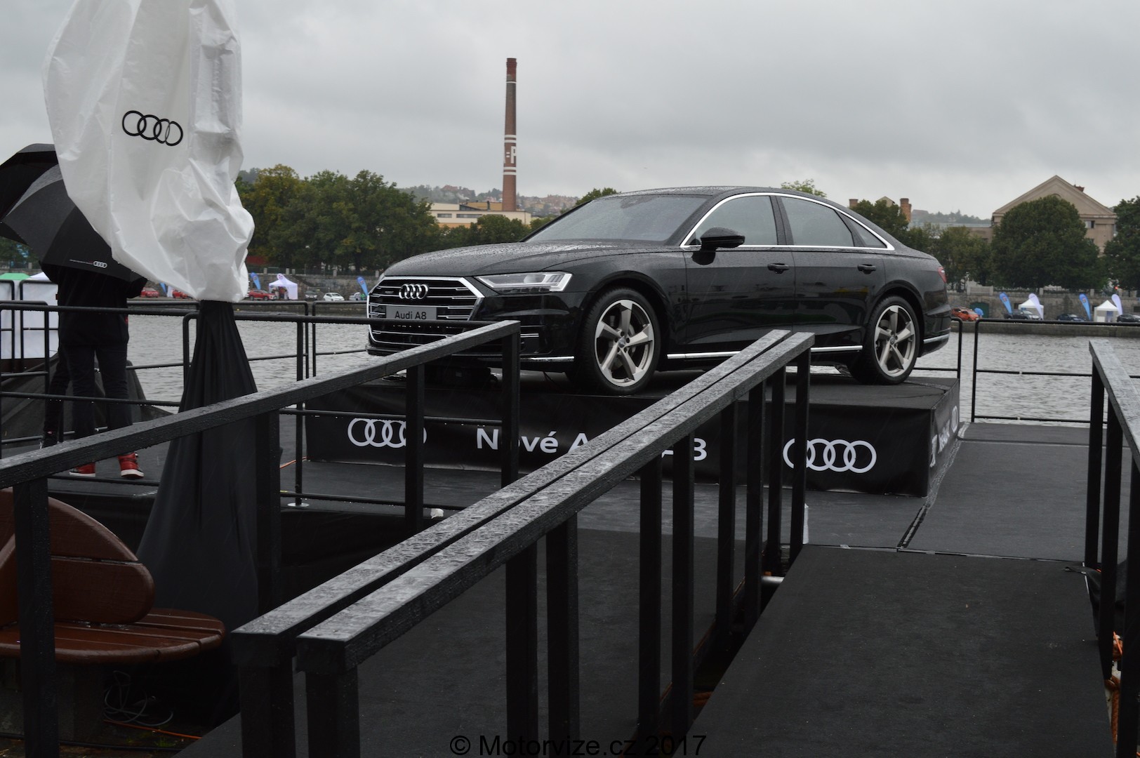 Hned za ním, směrem k Železničnímu mostu, byla hojná výstavka vozů Audi. Zde jsme si měli možnost povšimnout zajímavého rozvržení představovaných vozů. Většina stávajících aut, těch, co mají svou premiéru již delší dobu za sebou, byla na pevné zemi-na dlažebních kostkách. Ty nové a extravagantní modely měly na Náplavce místo na plovoucích platformách. Já osobně jsem se, upřímně řečeno a snad i pochopitelně, těšil na mé první tváří v tvář s novou Audi A8. Právě ta stála na plovoucím pontonu, konkrétněji na kruhovém otočném (leč v dané chvíli se neotáčejícím) piedestalu. Kolemstojící „muži v černém“ s deštníky v ruce bedlivě střežili tento vůz a kdokoli si „dovolil“ vystoupit na platformu, aby snad „Aachhh“ chtěl nahlédnout přes okno do interiéru, byl poměrně rychle vykázán ze své pozice. Tak či tak, Audi A8, soudě podle vlastní zkušenosti, se velmi povedlo a vypadá, alespoň dle mého názoru, opravdu luxusně a elegantně.