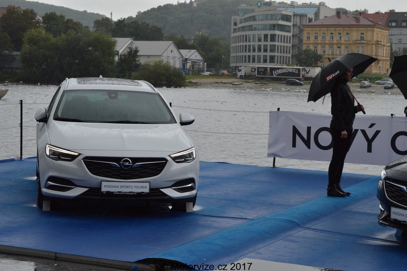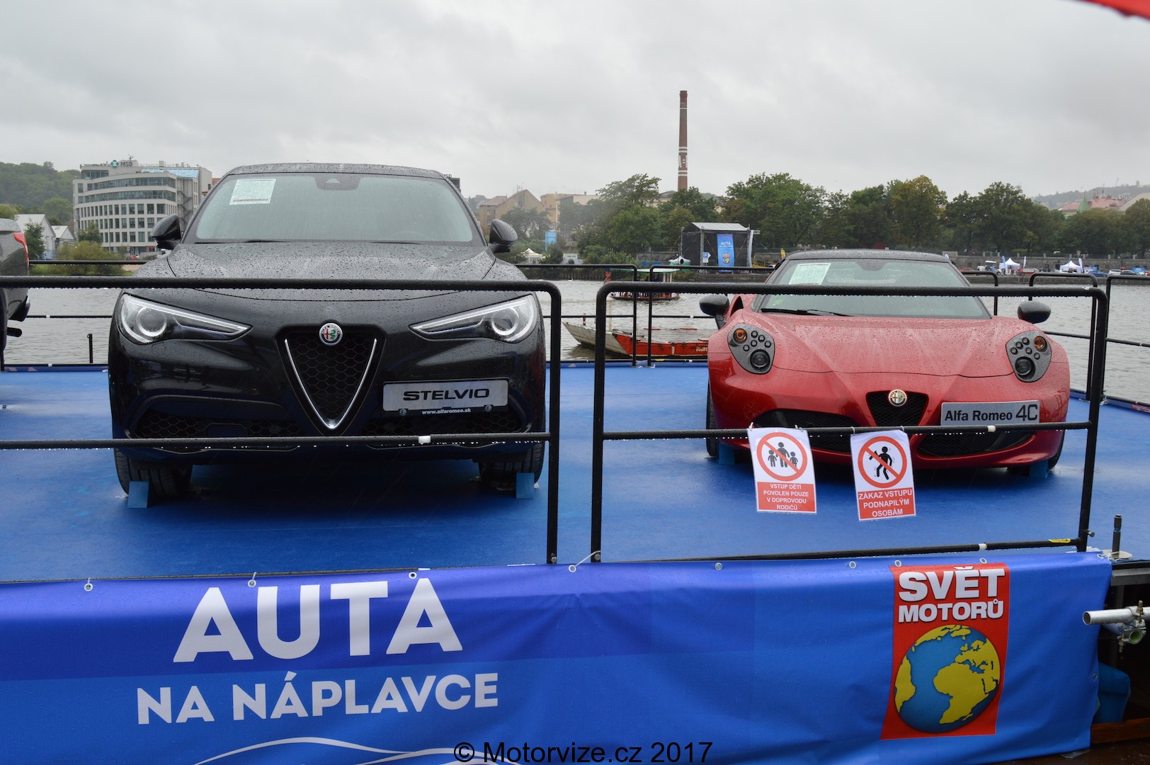Z časových důvodů především (i když nebudeme zapírat, že počasí nebylo také zrovna vynecháno z rovnice), jsme osobně druhý břeh, druhou část výstavy, nenavštěvovali. A tak jsme se museli spokojit s pouhým vzdáleným pohledem přes řeku. I tak bylo ale dost dobře vidět, jaké značky tam mají své místo a bylo zde na dohled i pódium. Druhý břeh byl domovem pro auta od Reanaultu (premiéru si tu pro ČR slavil model Zoe: pěkné, elektické vozítko do města), Subaru, Lada, Mistubishi či Tesla anebo také automobilka Kia, která se rozhodla využít této akce, aby zde představila světu svůj nový model Stonic – sympaticky vyhlížející vůz, řadící se do segmentu malých SUV.