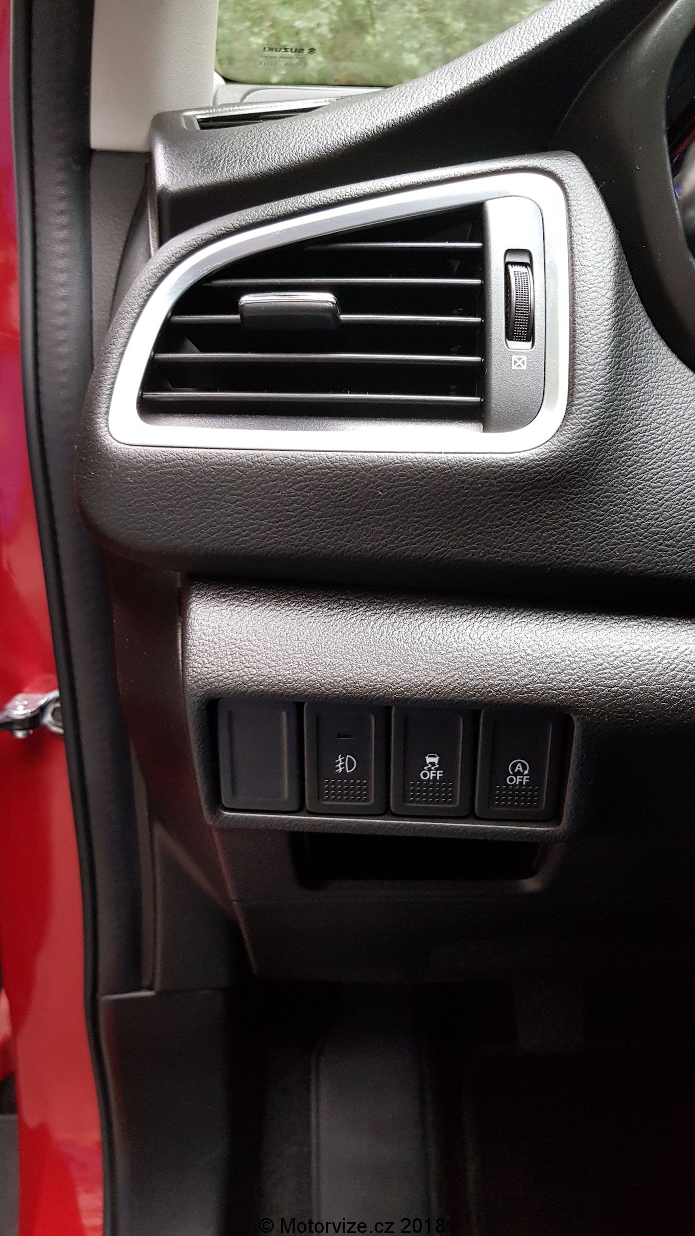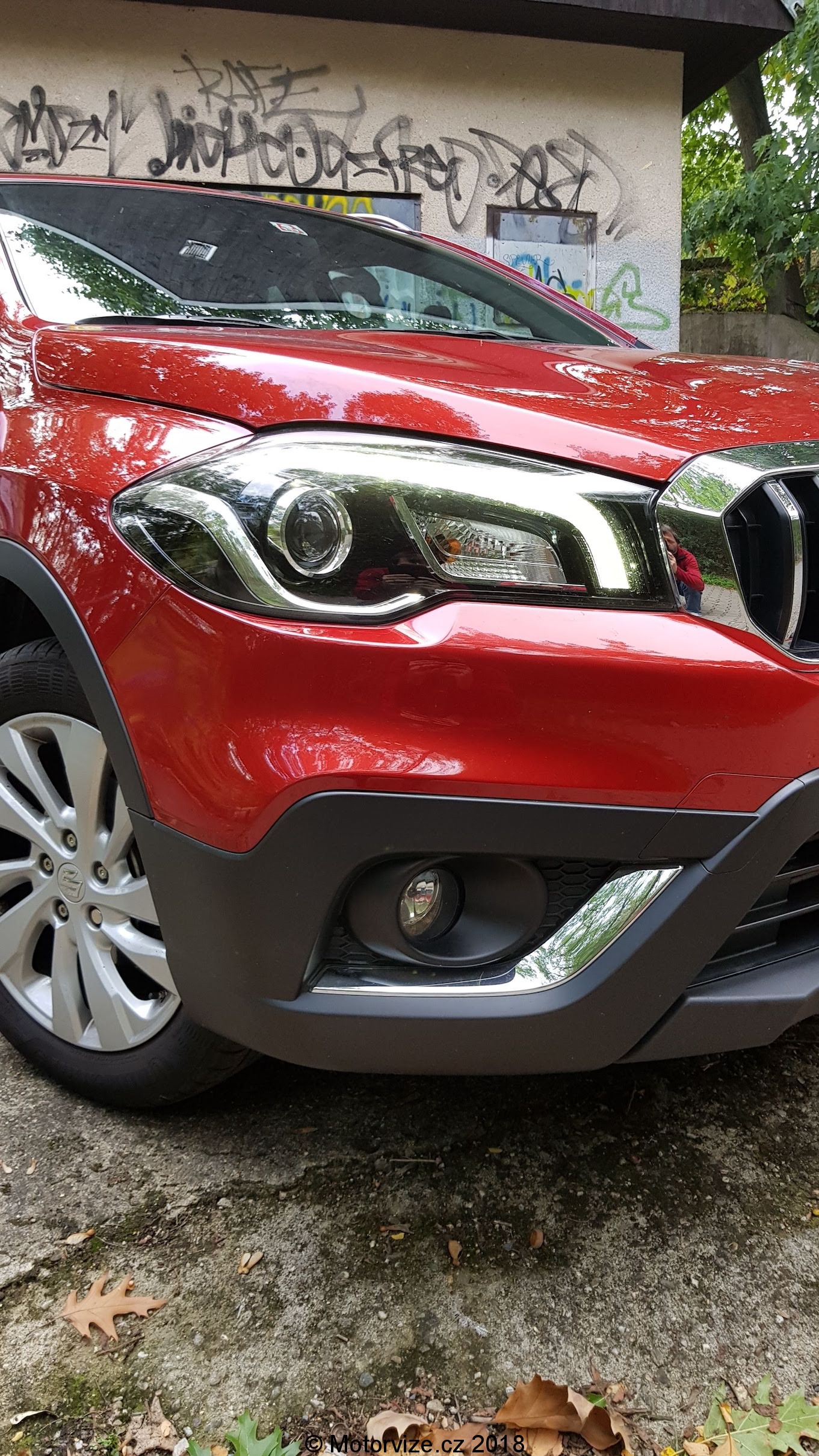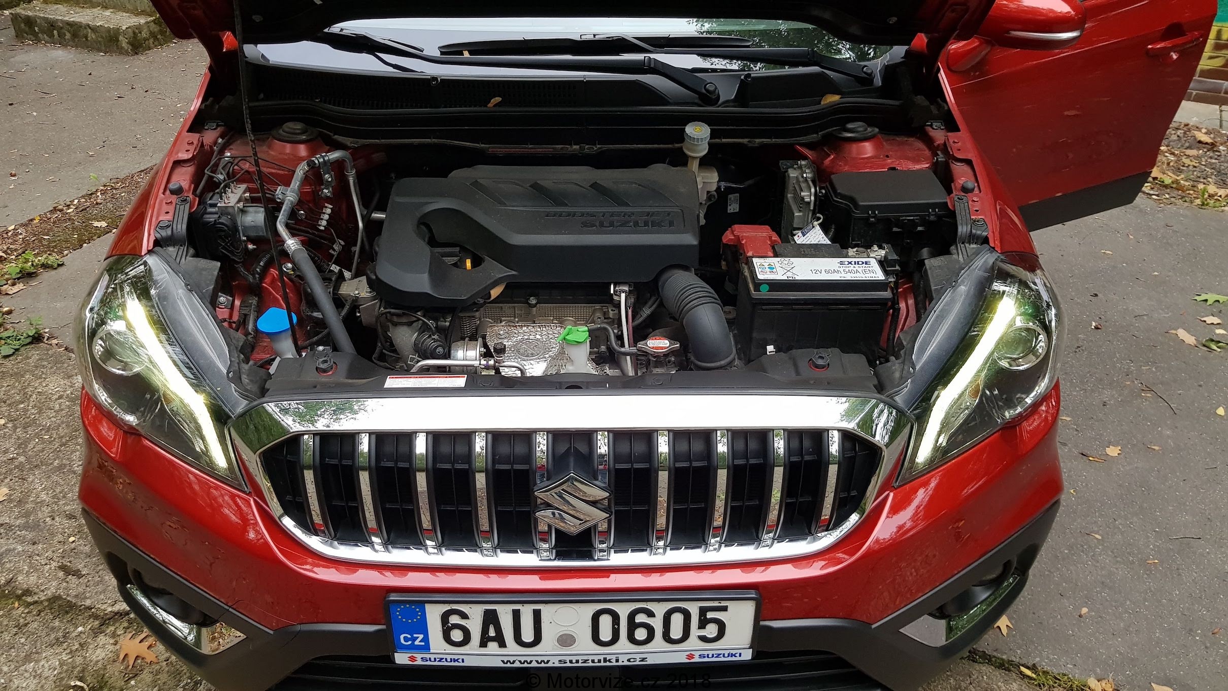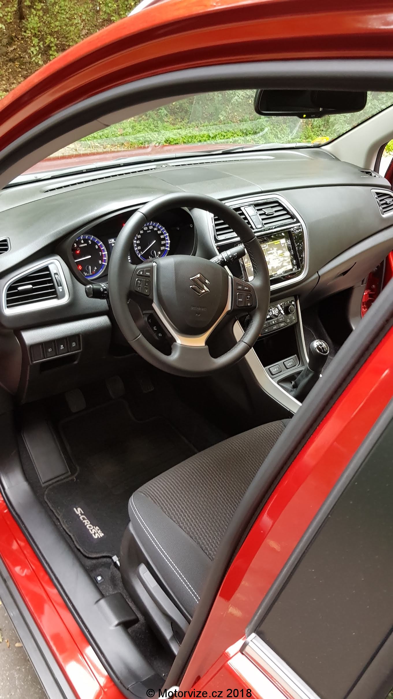 Když se dívám na nový s-cross, připadá mi, že přede mnou stojí velké plnohodnotné SUV, které zvládne vše. Mohutná osmiúhelníková maska s chromovaným grilem, mohutné oplastování nárazníků, plastové lemy blatníků či prahů se snaží vzbudit dojem, že se koukám na opravdový teréňák. Ale opak je pravdou, scross je 4,3 metrů dlouhé SUV s výškou něco málo přes jeden a půl metru. A vlastně ani váhově to není žádný obr. Základní hmotnost dle technických dat začíná jen lehce nad 1.100 kg.Testované Suzuki je lakováno ve slušivé červené metalíze, zmiňované mohutné oplastování je kontrastně černé a auto je postavené na 17“ discích z lehkých slitin obutých do běžných pneumatik s rozměrem 205/50. Přední světlomety jsou vybaveny technologií LED. Zajisté již víte, že mě málokteré LEDky uspokojí, většinou mi vadí krátký paprsek potkávacích světel, ale zde ne, inženýrům od Suzuki se povedlo světla naladit ku mé spokojenosti. I zadní sdružené svítilny jsou osazeny diodami, to ale už spíše pro efekt, kterým jen umocňuje první dojem z vozu.