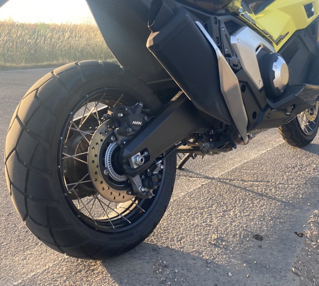 Podvozek tvoří nový ocelový rám a 41mm USD vidlice Showa SFF‑CA se zdvihem 153,5 mm a vzadu monoshock Pro‑Link se zdvihem 150 mm. Upřímně, tohle je na skútru něco fakt extra. Zdvihy jsou na skútr nadprůměrné; X‑ADV tak klidně spolkne hrboly a výmoly, aniž by vás vyhodil ze sedla. V rychlosti na dálnici je jízda stabilní a komfortní, jen na opravdu rozbité cestě pronese do sedla víc vibrací. Světlá výška 165 mm, drátěná kola a poloterénní pneumatiky lákají na lehké šotolinové cesty. Není to sice žádné enduro, ale jestli plánujete jezdit na chalupu a poslední míli máte po polňačce, je X-ADV přesně to, co potřebujete. Pořád je to ale primárně skútr a v terénu je X‑ADV spíš „adventure look“ než off‑road rally ride.