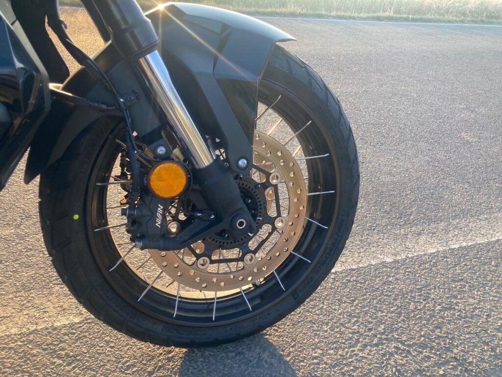 Brzdy jsou kapitola sama pro sebe. Dvojice 296 mm plovoucích kotoučů vpředu s radiálními čtyřpístkovými třmeny a zadní 240 mm kotouč zaručují ostré brzdění, za které by se nestyděl ani velký motocykl. Modulované ABS vám dovolí brzdění i v náklonu bez stresu a zadní brzdová páčka na levé rukojeti si rychle získá vaši důvěru a funguje to i na mokrém asfaltu.