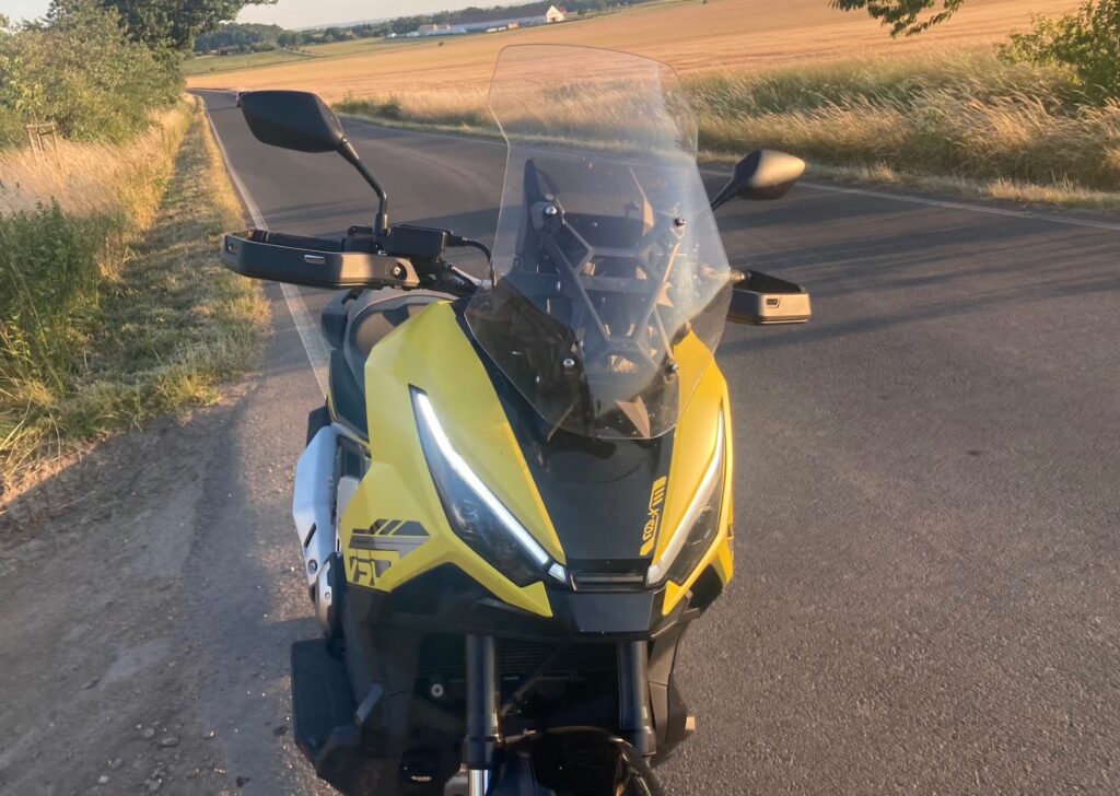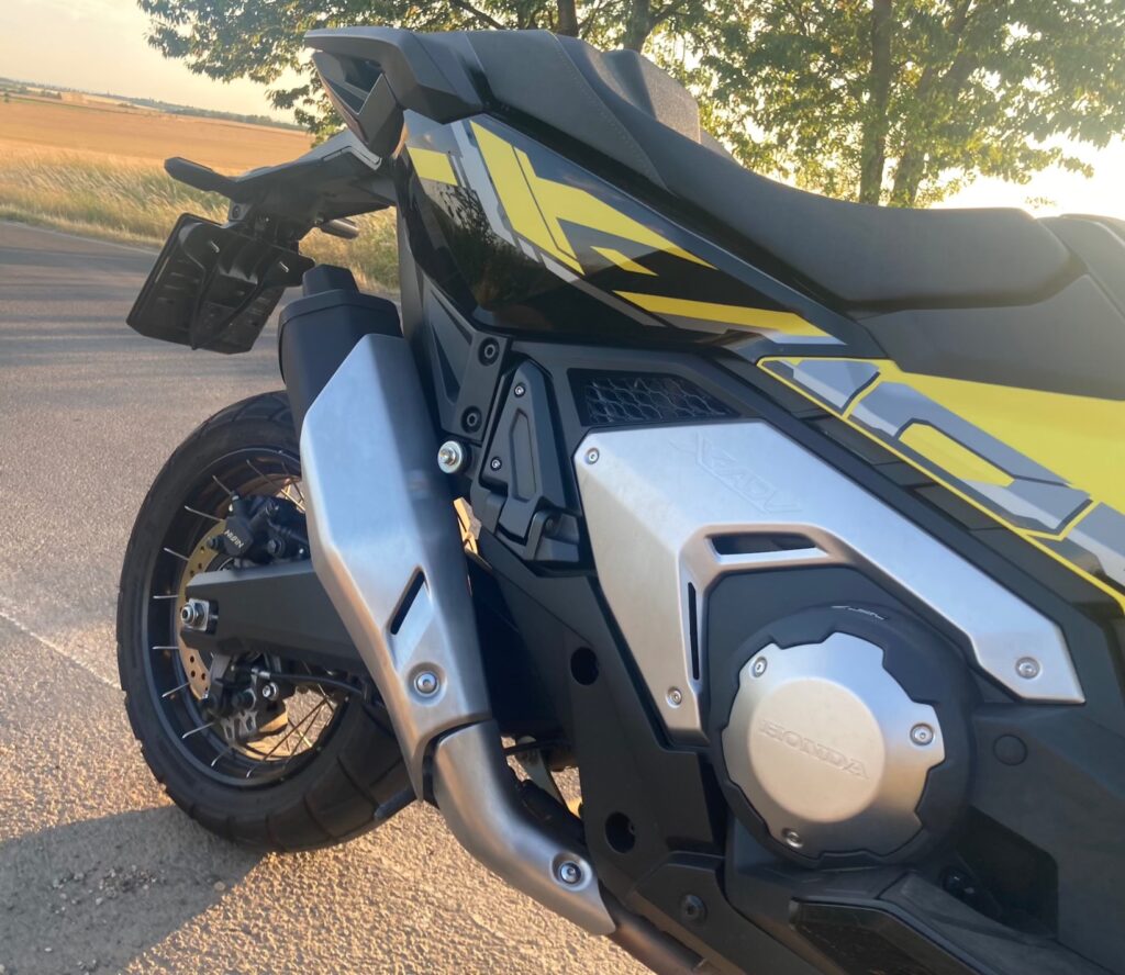 Na první pohled není X‑ADV 750 běžný skútr. Drátěné 17″ přední kolo a 15″ zadní ráfek přibližují konstrukci blíže skútrům tak, jak je známe – tj. přibližovadla pro městskou dopravu. Každý díl působí robustně, jako by chtěl říct „neboj se, přežiju i polňačku“. Pro modelový rok 2025 dostal stroj upravenou kapotáž, nový LED projektorový světlomet, přehlednější přístrojový panel a tempomat. Přední plexi se nastavuje jednou rukou a protože je štít vysoký, dobře odstíní vítr – i na dálnici udržuje hlavu v klidu. Odzkoušeno v praxi. S tímhle skútrem můžete úplně v pohodě frčet 130 i víc a nepo.… se z toho. Prostě to jede, je to stabilní a dobře se to ovládá.