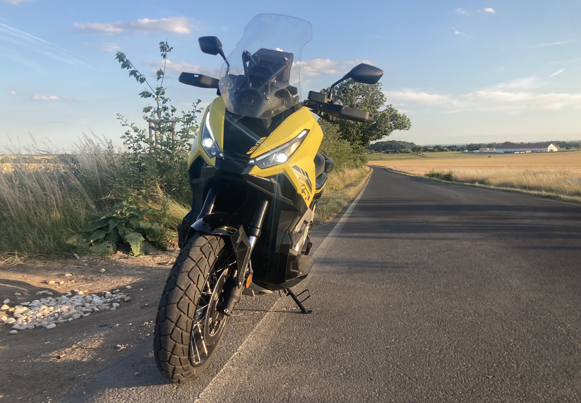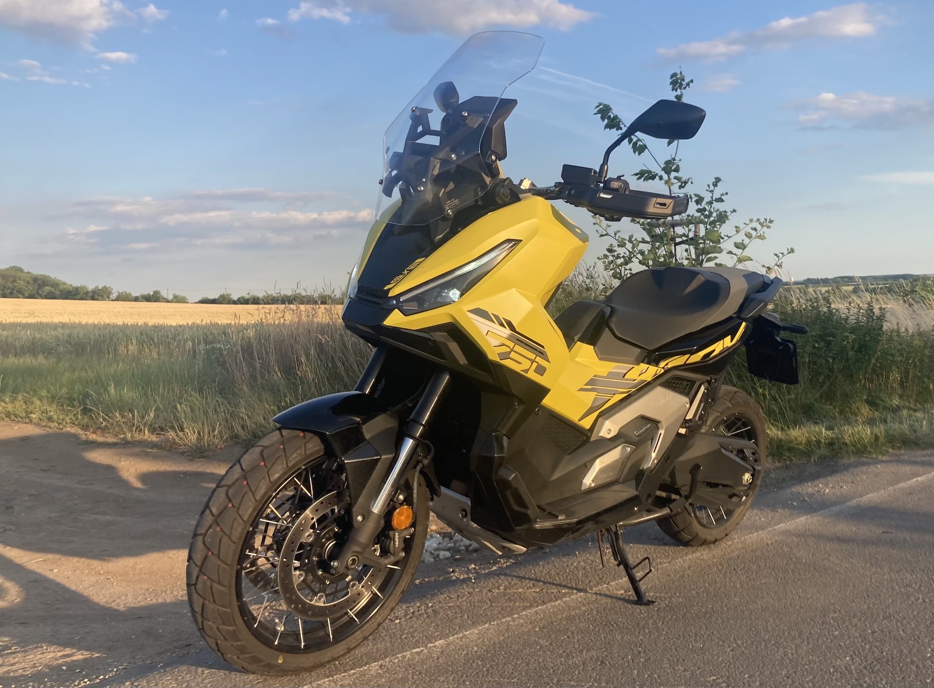 Na první pohled není X‑ADV 750 běžný skútr. Drátěné 17″ přední kolo a 15″ zadní ráfek přibližují konstrukci blíže skútrům tak, jak je známe – tj. přibližovadla pro městskou dopravu. Každý díl působí robustně, jako by chtěl říct „neboj se, přežiju i polňačku“. Pro modelový rok 2025 dostal stroj upravenou kapotáž, nový LED projektorový světlomet, přehlednější přístrojový panel a tempomat. Přední plexi se nastavuje jednou rukou a protože je štít vysoký, dobře odstíní vítr – i na dálnici udržuje hlavu v klidu. Odzkoušeno v praxi. S tímhle skútrem můžete úplně v pohodě frčet 130 i víc a nepo.… se z toho. Prostě to jede, je to stabilní a dobře se to ovládá.