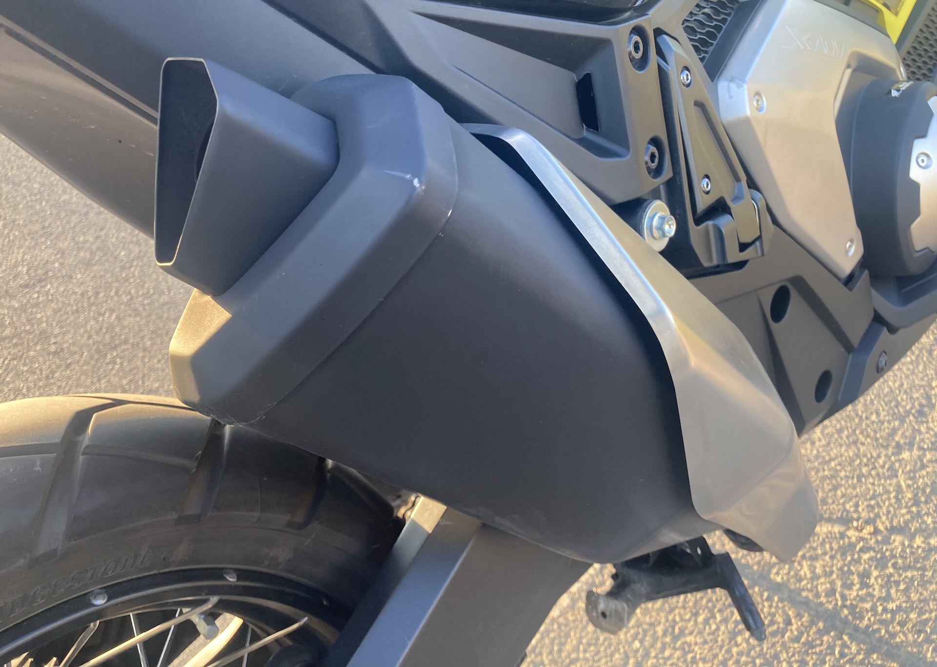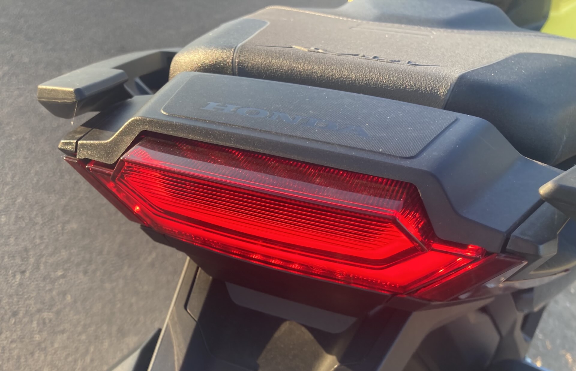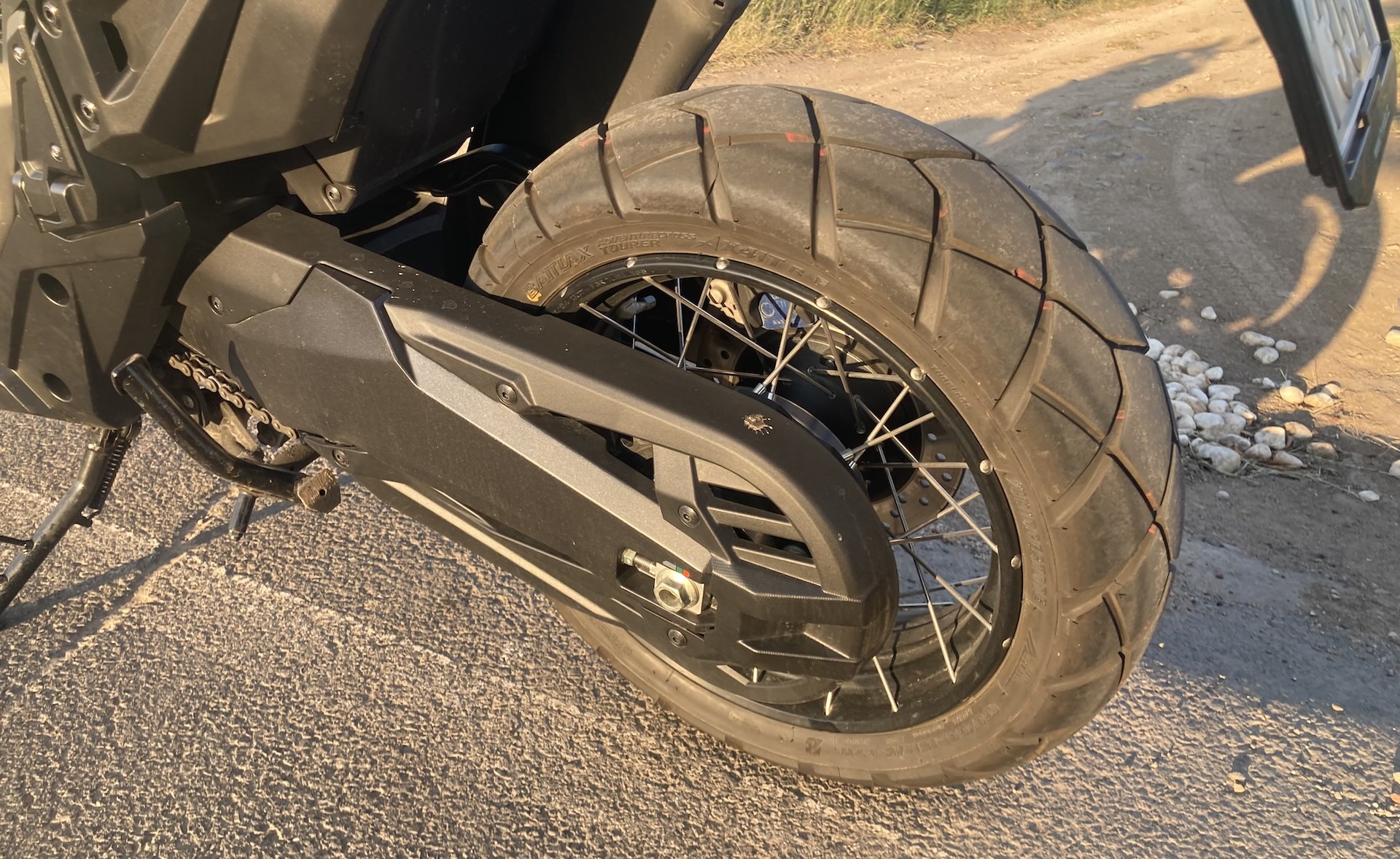 Podvozek tvoří nový ocelový rám a 41mm USD vidlice Showa SFF‑CA se zdvihem 153,5 mm a vzadu monoshock Pro‑Link se zdvihem 150 mm. Upřímně, tohle je na skútru něco fakt extra. Zdvihy jsou na skútr nadprůměrné; X‑ADV tak klidně spolkne hrboly a výmoly, aniž by vás vyhodil ze sedla. V rychlosti na dálnici je jízda stabilní a komfortní, jen na opravdu rozbité cestě pronese do sedla víc vibrací. Světlá výška 165 mm, drátěná kola a poloterénní pneumatiky lákají na lehké šotolinové cesty. Není to sice žádné enduro, ale jestli plánujete jezdit na chalupu a poslední míli máte po polňačce, je X-ADV přesně to, co potřebujete. Pořád je to ale primárně skútr a v terénu je X‑ADV spíš „adventure look“ než off‑road rally ride.