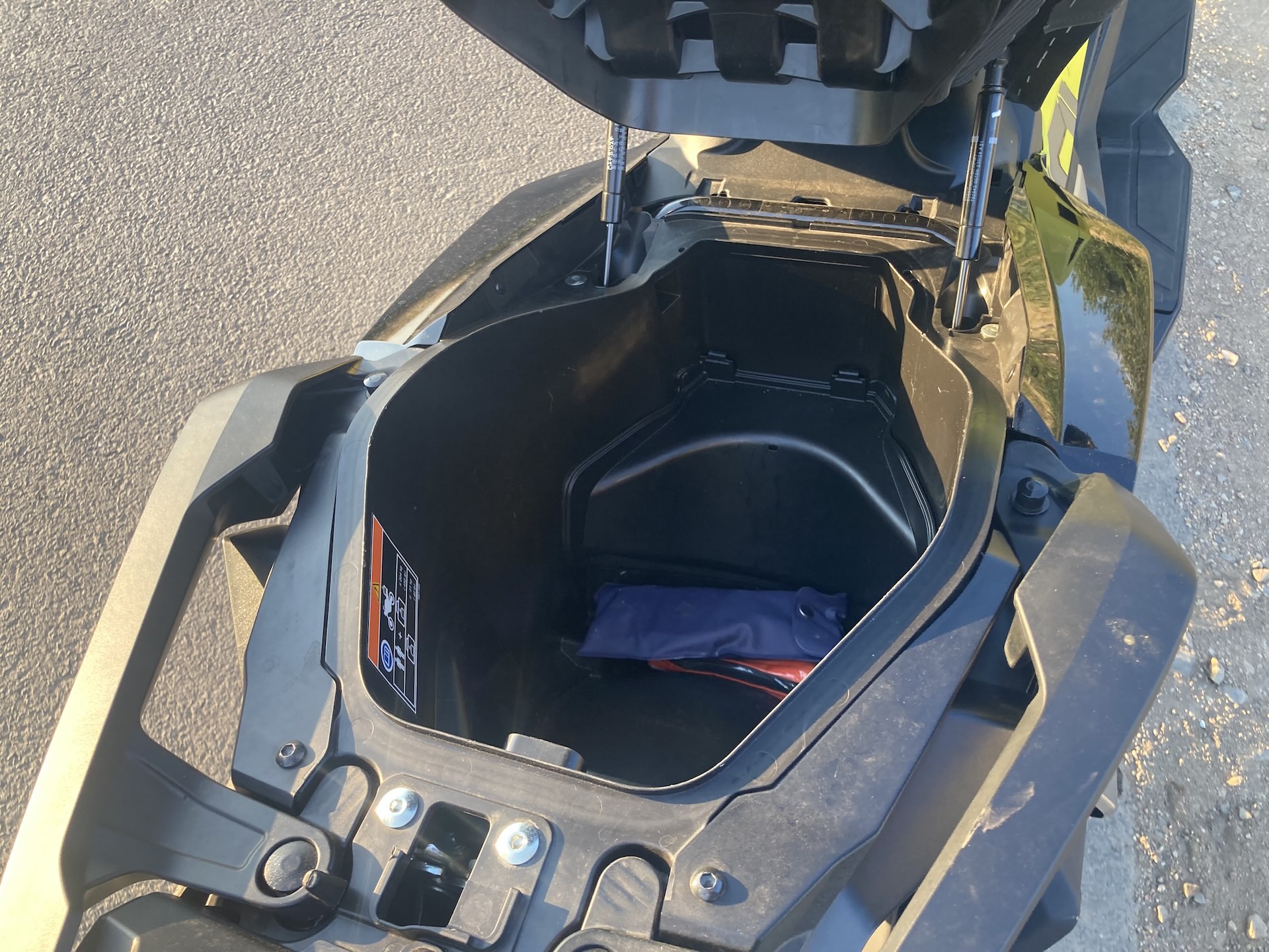 Sedlo leží 820 mm nad zemí. Není to žádný prcek, ale při výšce 180 cm dosáhnete nohama na zem a na širším sedle se pohodlně uvelebí i spolujezdec. Pod sedlem je celkem veliký úložný prostor (cca 22 l), který pojme menší helmu, nákup nebo menší notebook. Velký notebook, nebo velkou vyklápěčku tam už nedostanete, ale je to skútr, takže se úplně nepředpokládá, že pod sedlo budete cpát koženou kombinézu a velkou integralku. Přední schránka na pravé straně je ideální na klíče či kapesní telefon, jen pozor, skútr má bezklíčové zapalování, tak ať si tam nezapomenete klíče od motorky. Je to až skoro přirozené je tam odložit, ale abyste se nedivili, že vám na mašině bude jezdit celá ulice.