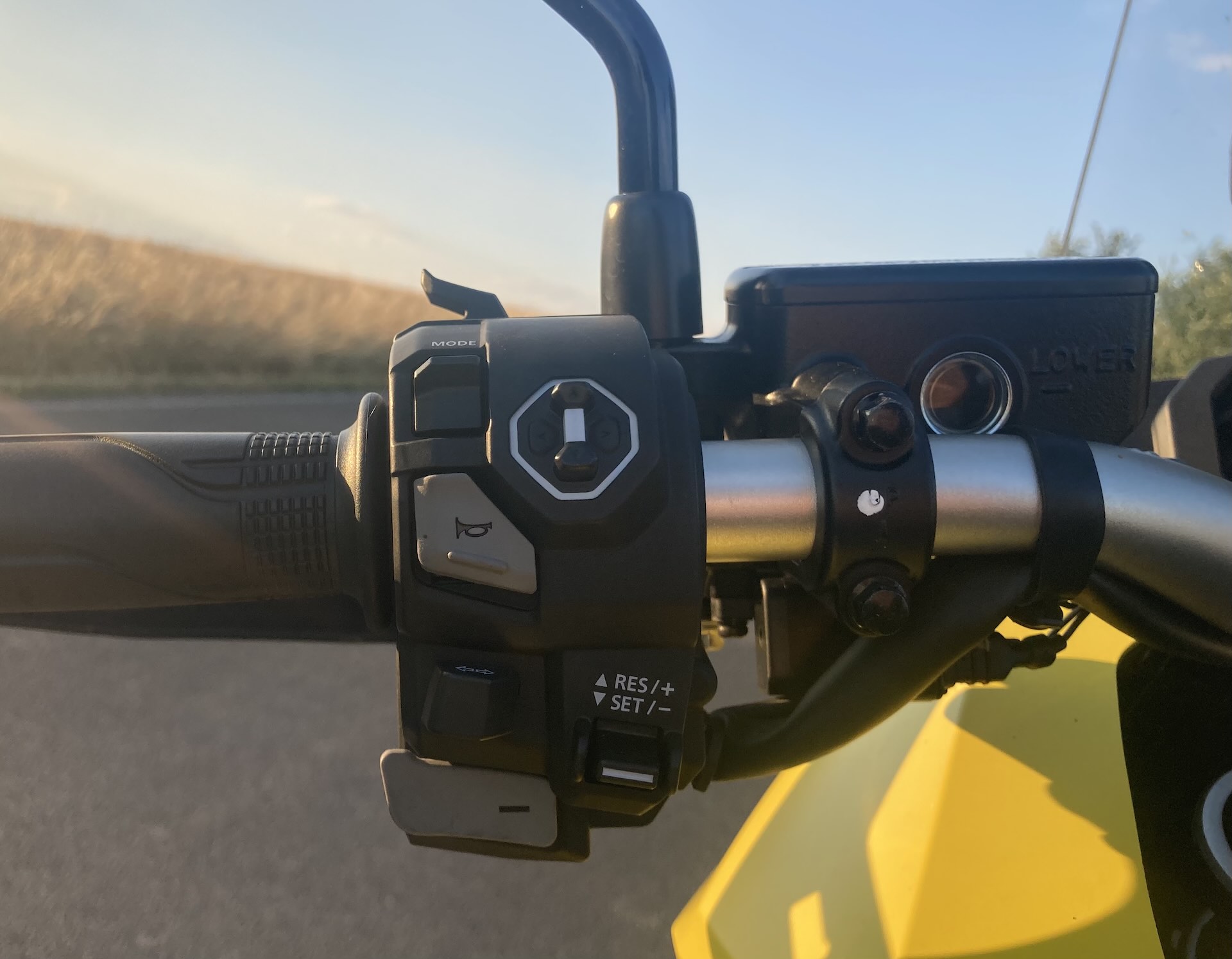 Vybavení dále zahrnuje 5″ TFT displej s hlasovým ovládáním telefonu přes RoadSync. USB‑C zásuvka pod sedlem umožní dobíjet mobil, 12V zásuvku můžete dokoupit. K dispozici jsou jízdní asistenti včetně Hill Start Assist, elektronického kontroly trakce a nového tempomatu. Spotřeba okolo 3,6 l/100 km při klidné jízdě a 13,2litrová nádrž vám dovolí dojezd přes 350 km, v reálném provozu jsem se pohyboval kolem 4,5 l/100 km, což je stále solidní.