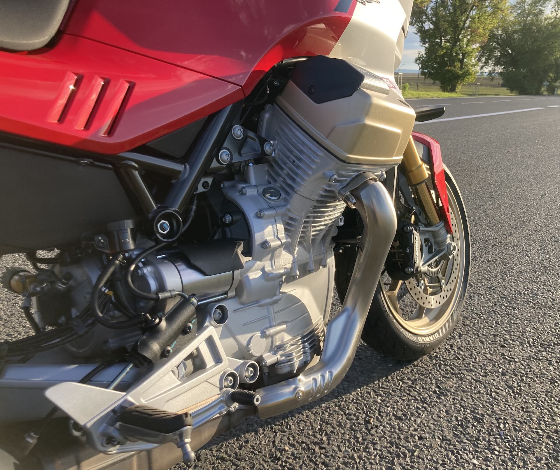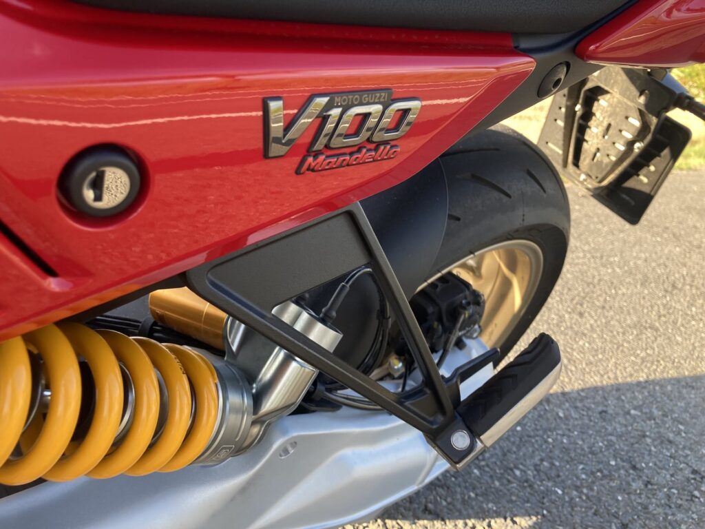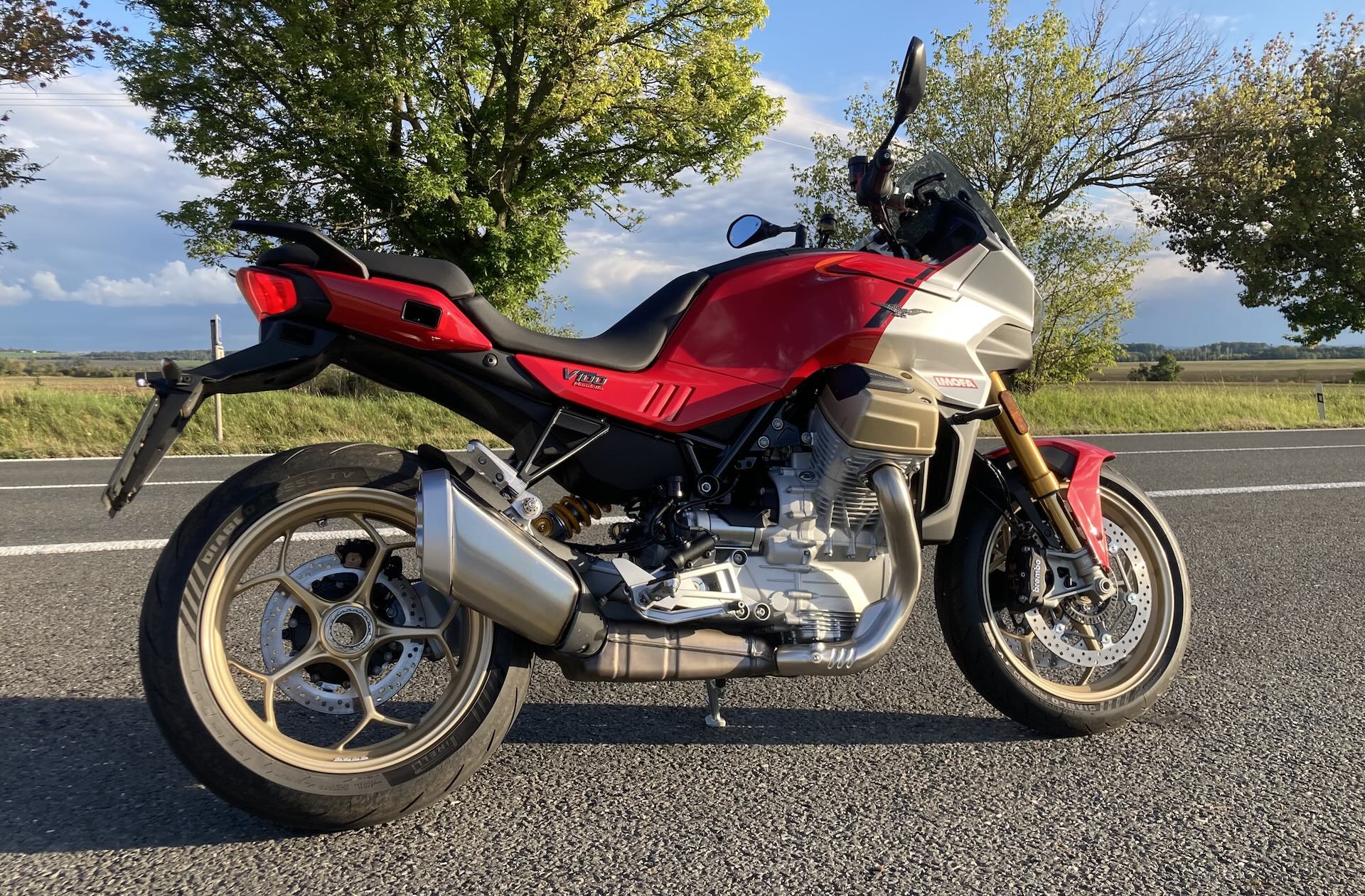 Stačí jeden pohled na motorku a víte, že se koukáte na extra kousek. První, co vás musí oslovit, je kompaktní, jako šelma nakrčená, svalnatá silueta s velkými válci vyčnívajícími po stranách motorky. Na boku nádrže vynikají adaptivní aerodynamické deflektory, jež se automaticky vysouvají dle zvoleného jízdního režímu a snižují tlak větru až o 22 %. Testovaný model V 100 Mandello S jsem měl k dispozici v nádherné barvě Rosso Lava. Dvoubarevné lakování doplňují zlaté detaily na přední vidlici, na ráfcích velkých 17″ litých kol a hlavách válců. Prostě dokonalý designový kousek z Itálie. Motorka je skvěle a precizně zpracovaná do každého detailu, se kterými si v továrně opravdu vyhráli. Například zadní světla připomínající stíhačku, přední světlomet s denním světlem v siluetě znaku Motto Guzzi, krásně zpracované sedlo a další drobnosti, které potěší oko a dokládají mistrovské zpracování tohoto modelu. Motorka je prošpikovaná elektronikou, která se ovládá přes palubní systém, jenž využívá 5″ TFT displej a joystick na levém řídítku. Displej má dobrou a přehlednou grafiku, údaje jsou dobře čitelné, jen systém je občas pomalejší než prst na joysticku. Pro pohodlí jezdce pak nechybí bezklíčové zapalování, tempomat, čtyři jízdní režimy (Touring, Sport, Rain a Street) a čtyři úrovně kontroly trakce a motorové brzdy. Model S přidává vyhřívané rukojeti, monitor tlaku v pneumatikách, obousměrné rychlořazení, multimediální rozhraní MIA, Ohlins adaptivní podvozek a u všech modelů V100 dokonce dostanete i elektricky nastavitelný přední štítek. Stačí zmáčknout tlačítko a štítek jede nahoru, nebo dolů.