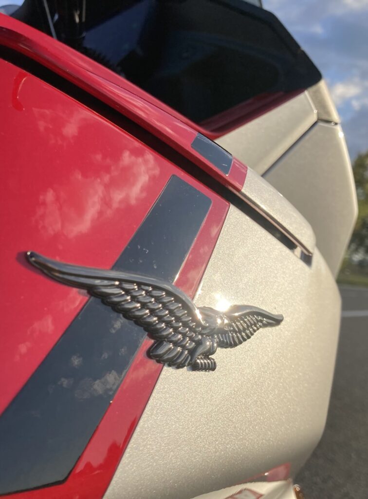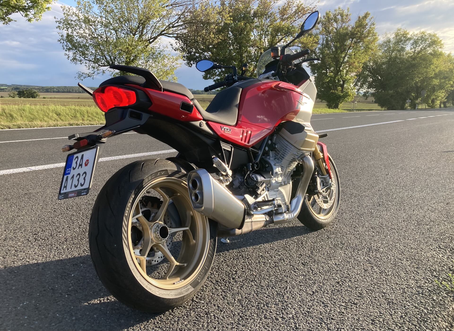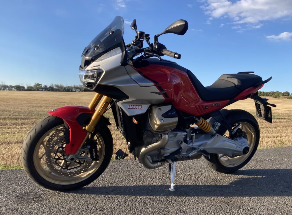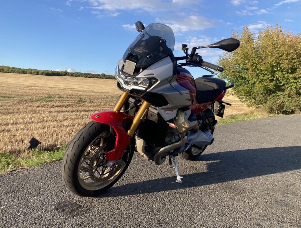 Stačí jeden pohled na motorku a víte, že se koukáte na extra kousek. První, co vás musí oslovit, je kompaktní, jako šelma nakrčená, svalnatá silueta s velkými válci vyčnívajícími po stranách motorky. Na boku nádrže vynikají adaptivní aerodynamické deflektory, jež se automaticky vysouvají dle zvoleného jízdního režímu a snižují tlak větru až o 22 %. Testovaný model V 100 Mandello S jsem měl k dispozici v nádherné barvě Rosso Lava. Dvoubarevné lakování doplňují zlaté detaily na přední vidlici, na ráfcích velkých 17″ litých kol a hlavách válců. Prostě dokonalý designový kousek z Itálie. Motorka je skvěle a precizně zpracovaná do každého detailu, se kterými si v továrně opravdu vyhráli. Například zadní světla připomínající stíhačku, přední světlomet s denním světlem v siluetě znaku Motto Guzzi, krásně zpracované sedlo a další drobnosti, které potěší oko a dokládají mistrovské zpracování tohoto modelu. Motorka je prošpikovaná elektronikou, která se ovládá přes palubní systém, jenž využívá 5″ TFT displej a joystick na levém řídítku. Displej má dobrou a přehlednou grafiku, údaje jsou dobře čitelné, jen systém je občas pomalejší než prst na joysticku. Pro pohodlí jezdce pak nechybí bezklíčové zapalování, tempomat, čtyři jízdní režimy (Touring, Sport, Rain a Street) a čtyři úrovně kontroly trakce a motorové brzdy. Model S přidává vyhřívané rukojeti, monitor tlaku v pneumatikách, obousměrné rychlořazení, multimediální rozhraní MIA, Ohlins adaptivní podvozek a u všech modelů V100 dokonce dostanete i elektricky nastavitelný přední štítek. Stačí zmáčknout tlačítko a štítek jede nahoru, nebo dolů.