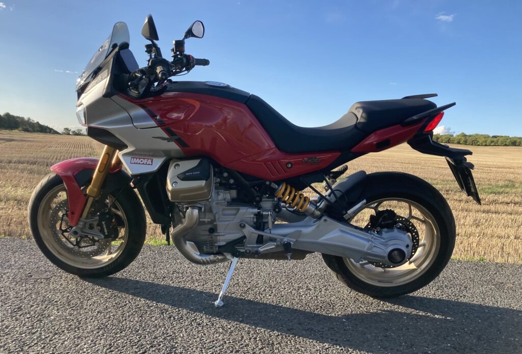 Srdcem motorky je V‑twin o objemu 1 042 cm³. Nová jednotka nazvaná Compact Block má mokré vložky válců, kapalinové chlazení a vícediskovou spojku v olejové lázni s protiprokluzem. Pokud si to technicky nedovedete představit, zjednodušeně řečeno je to skvělý motor s promyšleným designem a špičkovou technologií. Výkon 115 koní při 8 800 ot./min a točivý moment 105 Nm v 6 750 ot./min papírově odpovídá spíše střední třídě, ale Guzzi sází na průběh točivého momentu. Motor má pořádný zátah už od spodních otáček, ale chod je mnohem hladší než u spousty konkurentů. Motorka skvěle reaguje na plyn už od 1 500 ot./min a od 3 000 ot./min dává pořádný kontinuální zátah a nárůst výkonu až do maxima otáček. V rychlejších pasážích se projevuje „italský temperament“, zvuk z výfuku je nádherný, ale kvůli normám lehce utlumený. Při podřazení zní ale surově a hluboce. Nádhera a potěšení pro každého motorkáře. Standardní i S verze využívají kardanovou hřídel s novou, nižší výstupní pozicí a hlavně, nemusíte čistit a mazat řetěz.