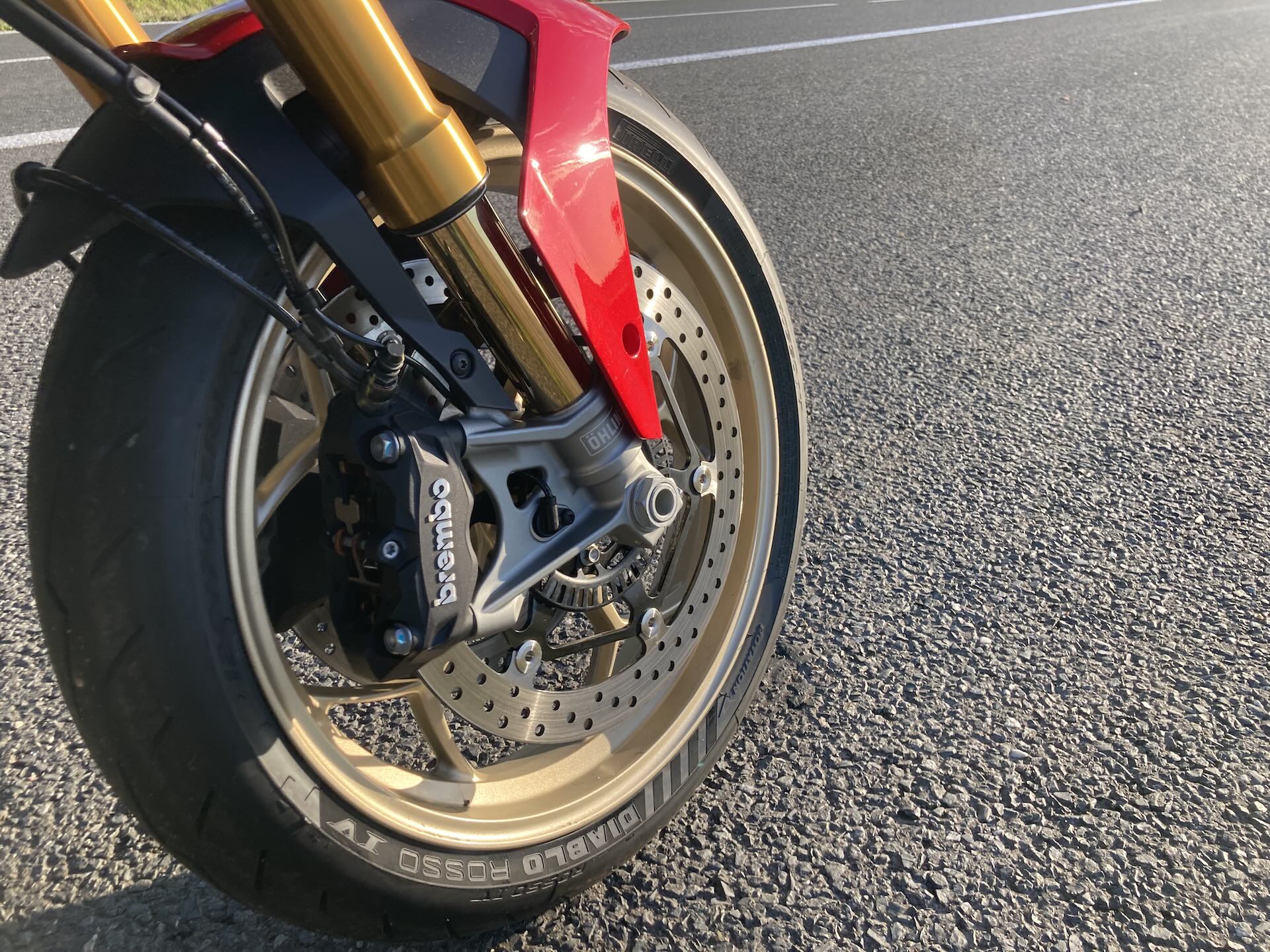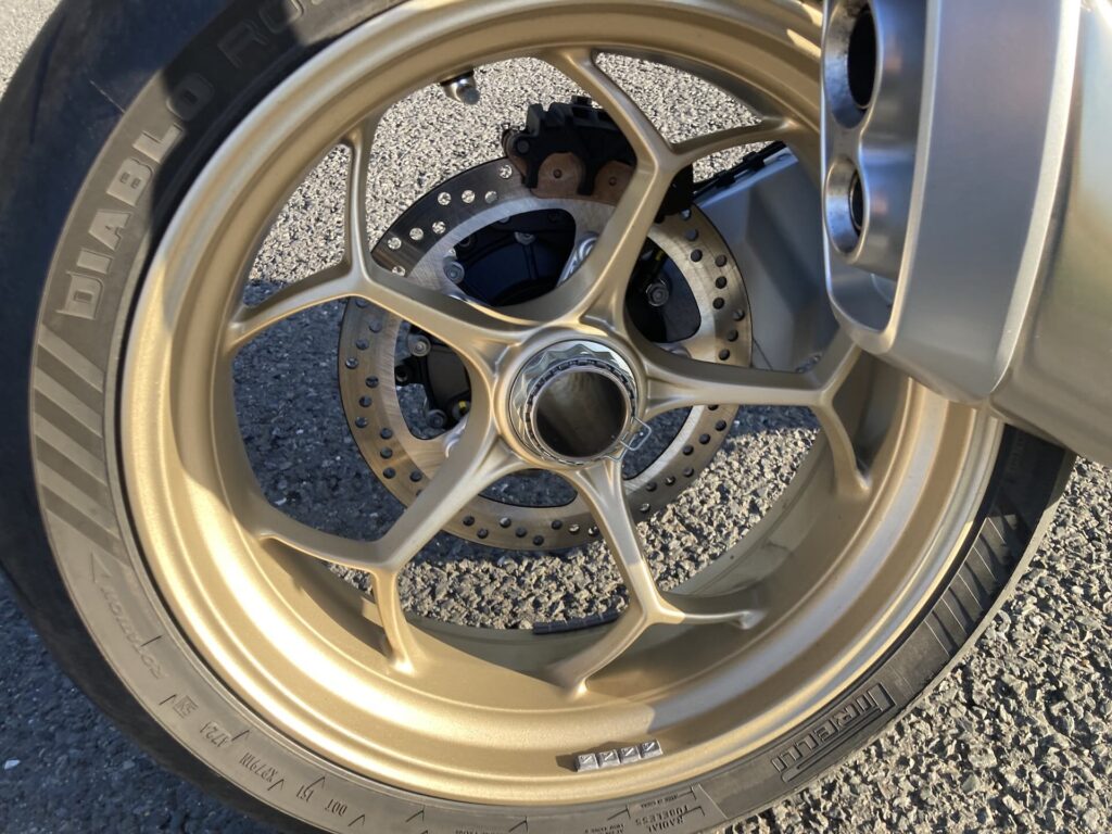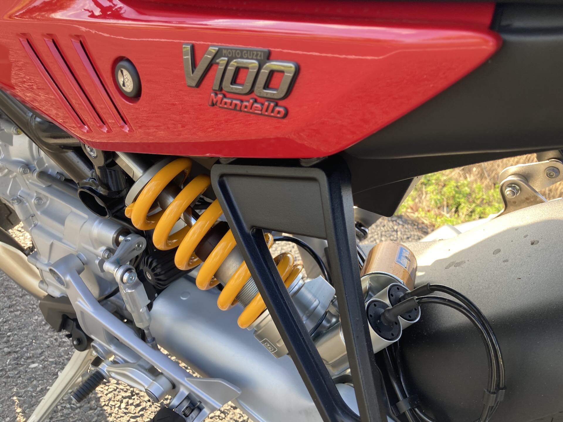 V zatáčkách V100 Mandello potěší hbitostí a precizností. Navzdory hmotnosti okolo 233 kg v suchu působí díky krátkému rozvoru a úzkému rámu z pohledu jezdce drobně a lehce. Podvozek tvoří ocelový trubkový rám a jednoramenná kyvná vidlice. U testovaného modelu Mandello S máte k dispozici semi‑aktivní odpružení Öhlins Smart EC 2.0 s přední 43mm vidlicí upside-down a zadním tlumičem TTX – obojí plně nastavitelné. Prostě špička v této oblasti. V režimu Sport se odpružení zpevní a charakter motorky se změní na špičkové sportovní náčiní. V Touring je trochu měkčí a ideální na delší cestování. Ve všech režimech se Ohlins spolehlivě postará o stabilitu a výbornou zpětnou vazbu podvozku. Dokonalost pak doplňují křidélka na bocích nádrže, neboli adaptivní aerodynamika. Upřímně je to víc designovka než velký game changer, ale je to prostě cool.