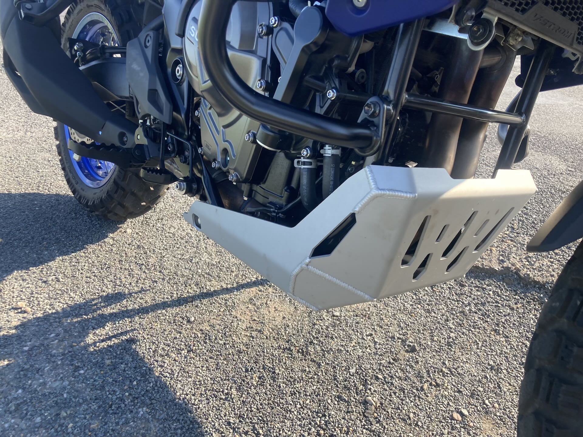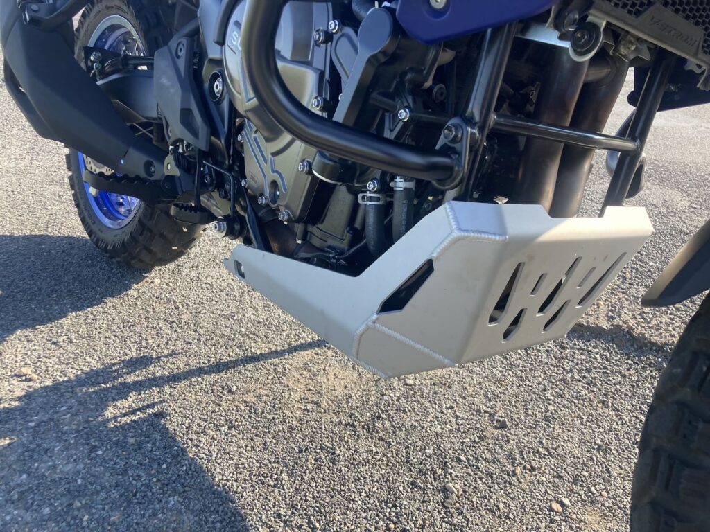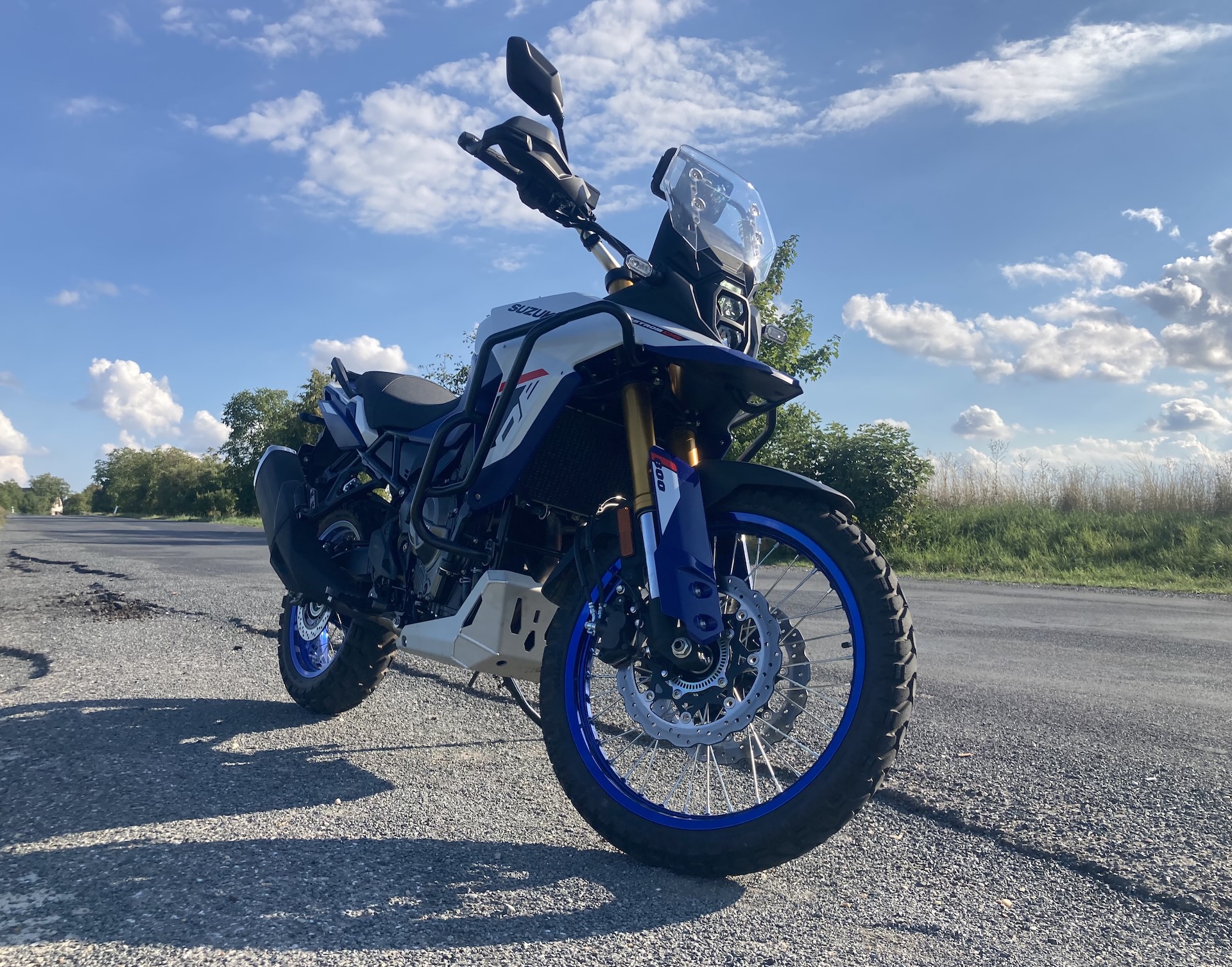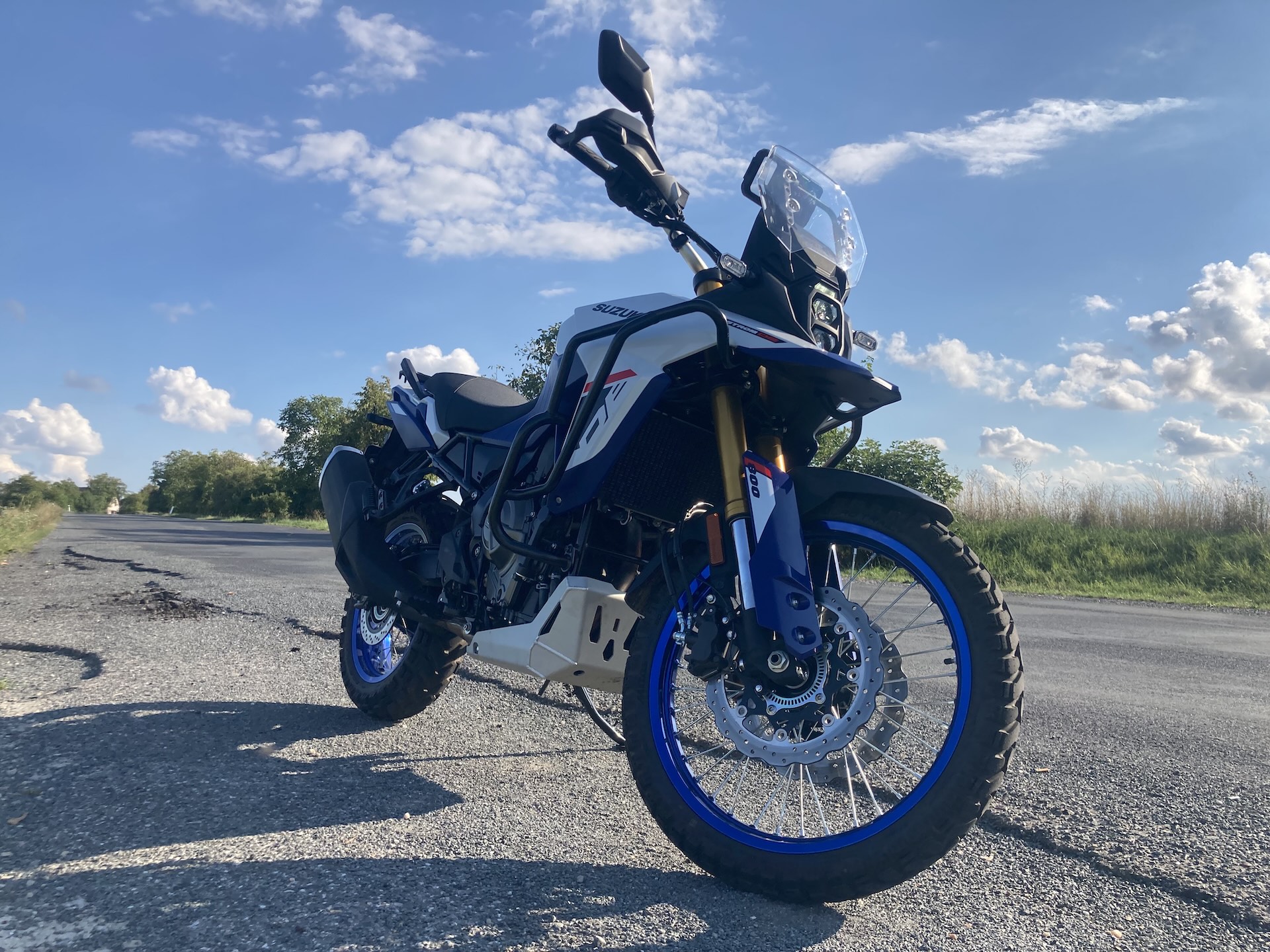 Aby toho železa / hliníku a ochrany nebylo málo, pod motorem je masivní kryt chránící spodek agregátu a nechybí ani kovový chránič chladiče. Dále tu najdeme široká hliníková řídítka s vyztuženými blastery, vysoký zdvih pérování 220 mm vpředu i vzadu či dvojici brzdových kotoučů (310 mm) s dvoupístkovými třmeny Nissin vpředu. V základní výbavě je i USB zásuvka, přední štítek a zadní nosič zavazadel. Náš testovací stroj byl navíc vybaven padacím rámem, který chrání motorku při neplánovaném položení, v Suzuki asi odhadli moje schopnosti v terénu (vtip, pozn. red.)…