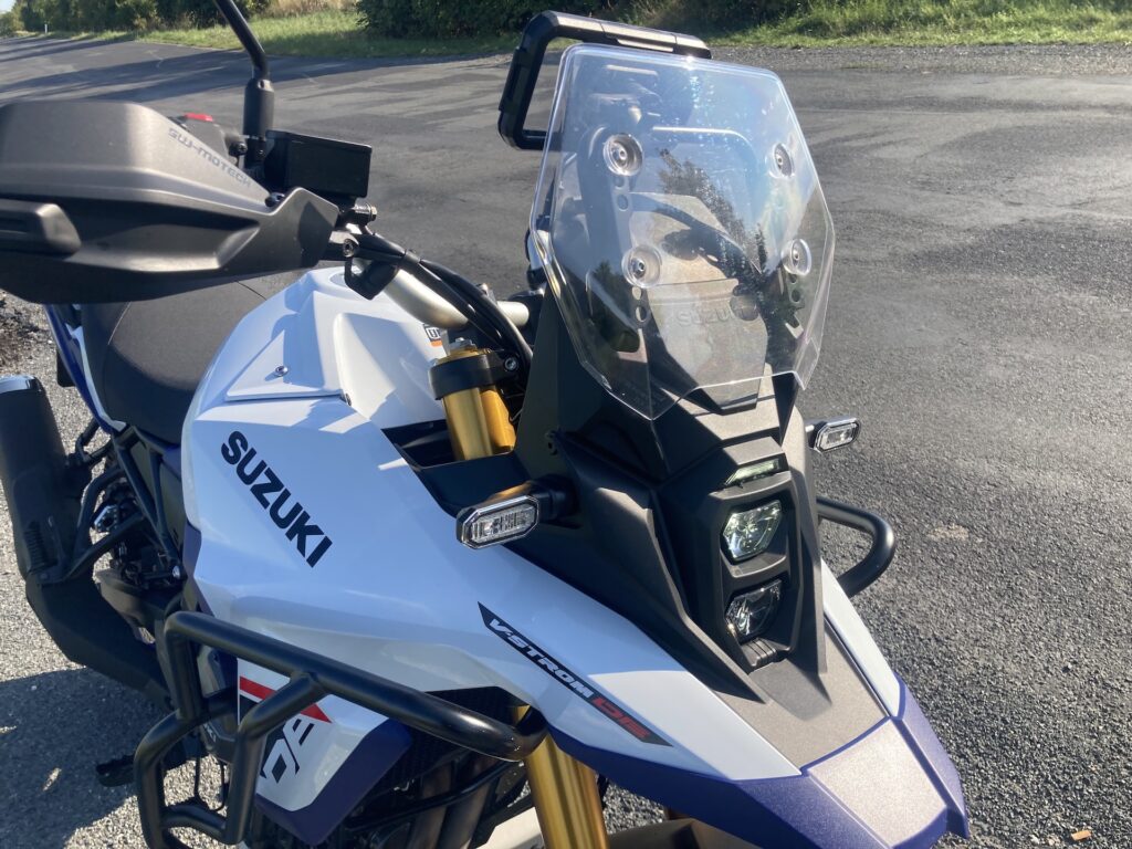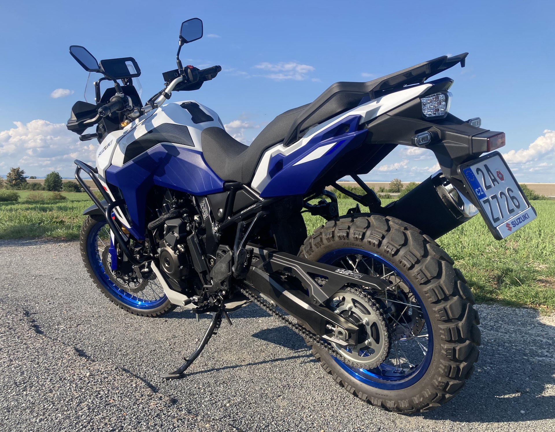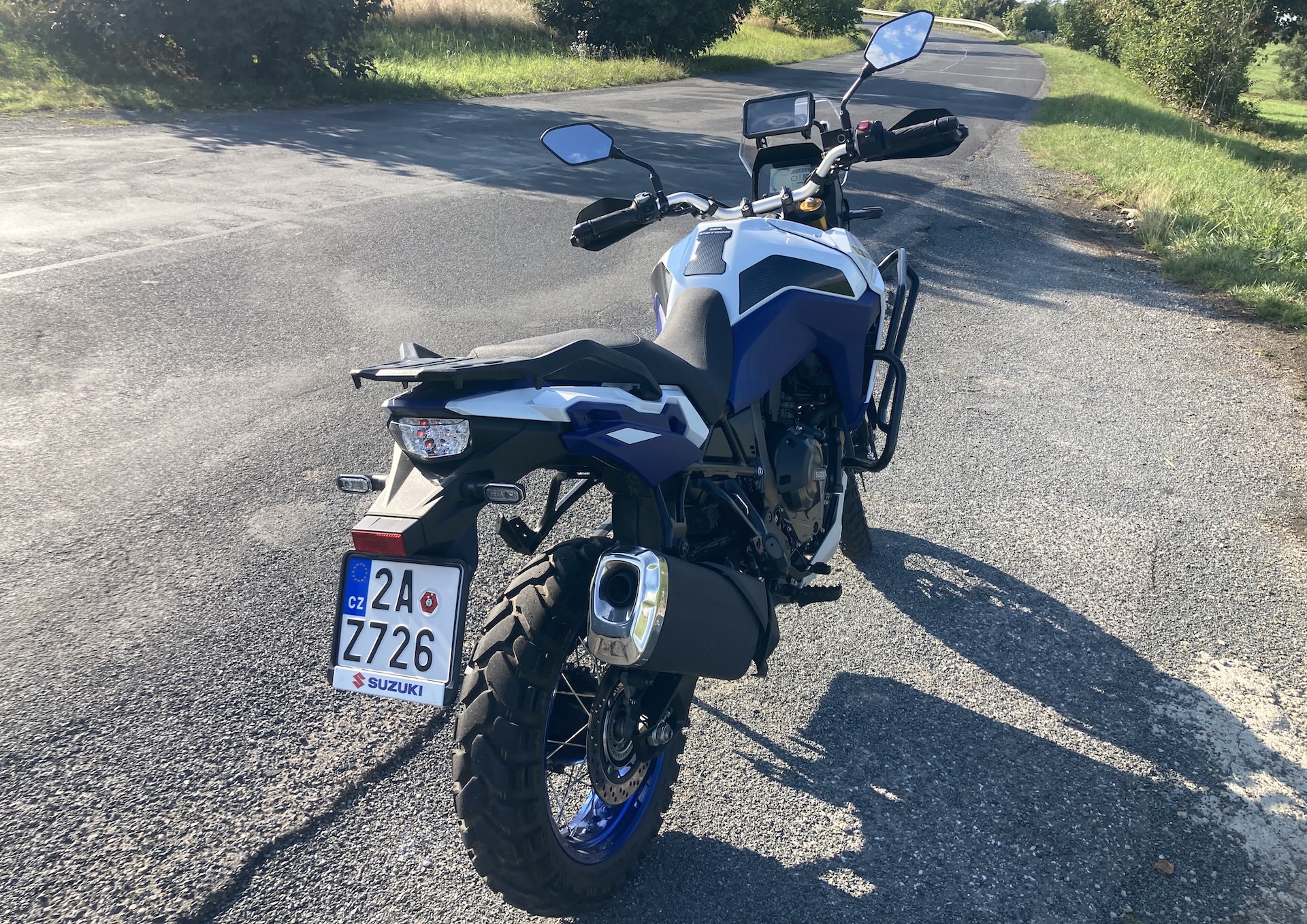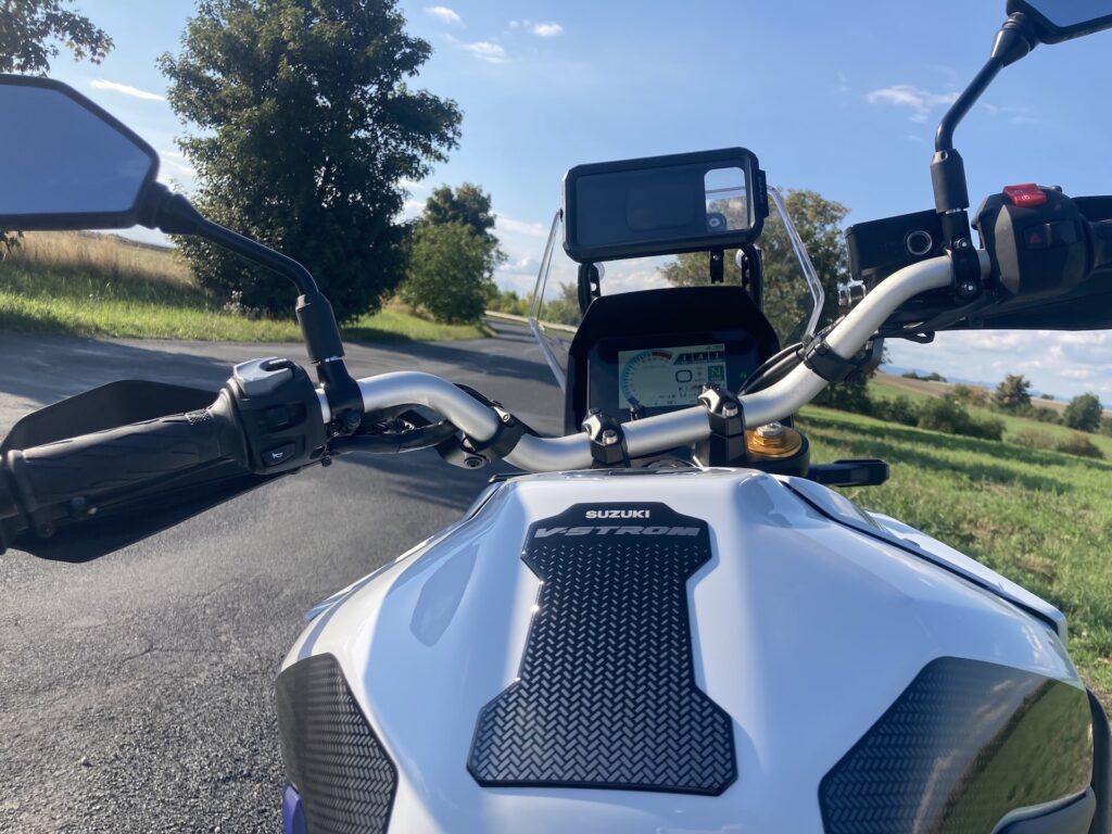 Přes svou off-roadovou orientaci umí V-Strom 800DE i na asfaltu velmi příjemně překvapit. Posaz za širokými řídítky je vzpřímený a pohodlný, sedlo tvoří jeden velký kus a je měkčí, takže ani po celodenní jízdě mě pozadí nebolelo. Podle Suzuki strávil její tvůrce hodně času dolaďováním pozice řídítek, stupaček a sedla – prý si dokonce designér nechal sedlo 800DE namontovat do své kanceláře místo židle, aby se ujistil, že na něm vydrží celý den. Musím říct, že s tím sedadlem bych tomu snad i věřil, ale co se týká řídítek, tam mi to 100% nesedělo. Za mě by mohla být o chlup užší a o trochu míň zahnutá dozadu, ale to by neměl být problém poladit. Při rychlých průjezdech zatáčkou na asfaltu se mi stávalo, že řídítka trochu překážela. Přeci jen když máte na předku 21” kolo, tak musíte na nádrž nalehnout o trochu víc. Při jízdě ve stoje mi někdy přišlo, že řídítka jsou o pár centimetrů za těžištěm a když se do nich opřu, spadnu na ústa, ale možná jsem byl jen líný si víc přidřepnout. Jinak ale určitě zvládnete i maratonské trasy (řečeno obrazně, reálně mnohem delší). Pokud chcete V-Stroma DE hlavně na cestování, rozmyslete si, jak moc budete v terénu (a v jak náročném) a jak moc na asfaltu. Pokud plánujete hlavně silnici, lehký terén a dlouhé trasy, zvažte větší, silniční čelní plexi. To offroadové je poměrně nízké, ale právě v terénu funguje báječně.