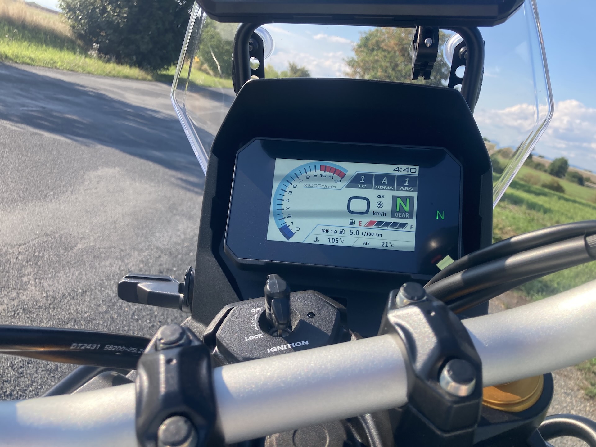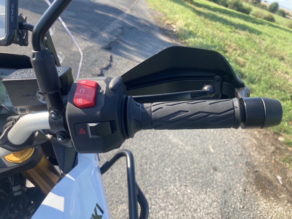 A jak fungují jednotlivé režimy v praxi? Režim A (Active) nabídne nejostřejší odezvu – až příliš jedovatou na můj vkus. Prudší otevření plynu v tomto módu způsobuje lehce trhavé reakce a na mokru nebo šotolině je to spíš na škodu. Na silnici, pokud zvolíte opravdu závodní tempo je A dobré, ale jinak jsem ho moc  nepoužíval. Většinu času jsem jezdil v režimu B (Basic), který má skvělou, přitom plynulou odezvu a dává dostatek výkonu i na ostřejší jízdu. Režim C (Comfort) pak reakce ještě více zjemní, což využijete třeba na mokré silnici nebo pokud si na silný motor teprve zvykáte. Kontrola trakce se v terénu osvědčila hlavně ve zmíněném režimu Gravel, který dovolí poměrně dost prokluzu zadního kola, aniž by elektronika úplně uťala výkon. Zásahy jsou jemné a nenásilné – občas máte pocit, že jedete smykem, což vyloženě potěší a zvýší zábavu.