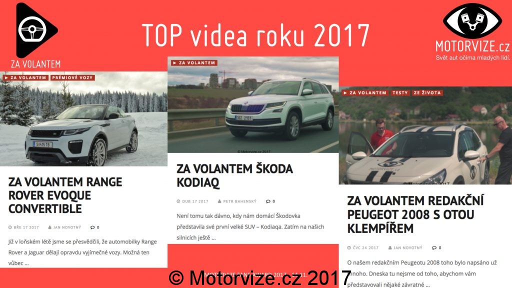 Autor: Jan Novotný · Fotografie: Jan NovotnýRok 2017 se nenávratně blíží ke svému konci. Ani redakce Motorvize.cz nechce usnout na vavřínech, a tak si pro vás do nového roku chystáme mnoho zajímavostí, vylepšení, inovací… Teď je ale na čase bilancovat rok končící. A tak je tu připraven přehled toho nejzajímavějšího, co jsme za uplynulých 365 dní podnikli. Abych byl o něco přesnější, připravili jsme list nejčtenějších článků a nejsledovanějších videí. Jen pro zajímavost – na našem YouTube kanále jste letos strávili více než 80 dní (necelých 2000 hodin) čistého času a jen za poslední 2 velmi povedené měsíce jste si naše stránky zobrazili více než 7.000 krát. Teď už ale nezdržujme a pojďme se podívat na to, co jsme si pro vás přichystali. Děkujeme za přízeň a těšíme se na další úspěšný rok! 🙂